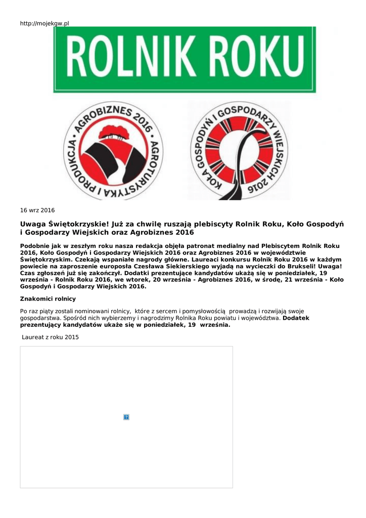 http://mojekgw.pl 16 wrz 2016 Uwaga Świętokrzyskie! Już za chwilę ruszają plebiscyty Rolnik Roku, Koło Gospodyń i Gospodarzy Wiejskich oraz Agrobiznes 2016 Podobnie jak w zeszłym roku nasza redakcja objęła patronat medialny nad Plebiscytem Rolnik Roku 2016, Koło Gospodyń i Gospodarzy Wiejskich 2016 oraz Agrobiznes 2016 w województwie Świętokrzyskim. Czekają wspaniałe nagrody główne. Laureaci konkursu Rolnik Roku 2016 w każdym powiecie na zaproszenie europosła Czesława Siekierskiego wyjadą na wycieczki do Brukseli! Uwaga! Czas zgłoszeń już się zakończył. Dodatki prezentujące kandydatów ukażą się w poniedziałek, 19 września - Rolnik Roku 2016, we wtorek, 20 września - Agrobiznes 2016, w środę, 21 września - Koło Gospodyń i Gospodarzy Wiejskich 2016. Znakomici rolnicy Po raz piąty zostali nominowani rolnicy, które z sercem i pomysłowością prowadzą i rozwijają swoje gospodarstwa. Spośród nich wybierzemy i nagrodzimy Rolnika Roku powiatu i województwa. Dodatek prezentujący kandydatów ukaże się w poniedziałek, 19 września. Laureat z roku 2015 Gospodynie i gospodarze Zmieniono nieco formułę konkursu dla gospodyń. Wieś się zmienia, a konkurs musi dotrzymać jej kroku. Stąd potrzeba włączenia do konkursu kół gospodarzy, którzy są także aktywnie działają na rzecz kultury i folkloru. Stworzono więc plebiscyt Koło Gospodyń i Gospodarzy Wiejskich 2016, w którym zostaną wybrane najlepsze koła w powiecie i regionie. W konkursie udział może wziąć każde koło gospodyń wiejskich i koło gospodarzy wiejskich z województwa świętokrzyskiego, które rozpoczęło działalność najpóźniej w pierwszym kwartale 2016 roku. Dodatek prezentujący kandydatów ukaże się w środę, 21 września. Nagrody przygotowuje już posłanka Platformy Obywatelskiej Marzena Okła - Drewnowicz, szefowa Świętokrzyskiej Rady Wojewódzkiej Kół Gospodyń Wiejskich. Laureatki z roku 2015 Agroturystyka i produkcja Rozwój gospodarstw wniósł potrzebę wprowadzenia nowej nazwę i kategorii. W plebiscycie Agrobiznes 2016 zostaną zaprezentowane dwie kategorie aktywności. Będzie to agroturystyka powiatu ostrowieckiego oraz Najlepsze Gospodarstwo Agroturystyczne 2016 w każdym powiecie i regionie, z kolei w ramach drugiej kategorii zostaną uwidocznione dodatkowe działalności przetwórcze rolników powiatu i zostanie wybrana najlepsza Produkcja 2016. W konkursie w kategorii Gospodarstwo Agroturystyczne zgłoszona mogła zostać każda agroturystyka z województwa prowadzona od co najmniej początku 2016 roku, zaś w kategorii Produkcja - każda działalność przetwórcza rolnika, prowadzona co najmniej od początku 2016 roku , i w której używa do przetwarzania większości produktów z własnego gospodarstwa. Dodatek prezentujący kandydatów ukaże się we wtorek, 20 września. Nagrodami głównymi w tym konkursie będą kampanie promocyjne i powierzchnie reklamowe. Ponadto laureatów w kategorii Produkcja nagrodzi ciekawymi urządzeniami kielecka firma "Swoyskie z Domowej Spiżarni". Laureaci z roku 2015 Ewa Ł.