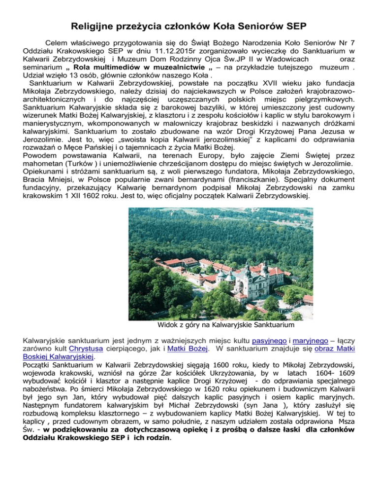 Religijne przeżycia członków Koła Seniorów SEP Celem właściwego przygotowania się do Świąt Bożego Narodzenia Koło Seniorów Nr 7 Oddziału Krakowskiego SEP w dniu 11.12.2015r zorganizowało wycieczkę do Sanktuarium w Kalwarii Zebrzydowskiej i Muzeum Dom Rodzinny Ojca Św.JP II w Wadowicach oraz seminarium „ Rola multimediów w muzealnictwie „ – na przykładzie tutejszego muzeum . Udział wzięło 13 osób, głównie członków naszego Koła . Sanktuarium w Kalwarii Zebrzydowskiej, powstałe na początku XVII wieku jako fundacja Mikołaja Zebrzydowskiego, należy dzisiaj do najciekawszych w Polsce założeń krajobrazowoarchitektonicznych i do najczęściej uczęszczanych polskich miejsc pielgrzymkowych. Sanktuarium Kalwaryjskie składa się z barokowej bazyliki, w której umieszczony jest cudowny wizerunek Matki Bożej Kalwaryjskiej, z klasztoru i z zespołu kościołów i kaplic w stylu barokowym i manierystycznym, wkomponowanych w malowniczy krajobraz beskidzki i nazwanych dróżkami kalwaryjskimi. Sanktuarium to zostało zbudowane na wzór Drogi Krzyżowej Pana Jezusa w Jerozolimie. Jest to, więc „swoista kopia Kalwarii jerozolimskiej” z kaplicami do odprawiania rozważań o Męce Pańskiej i o tajemnicach z życia Matki Bożej. Powodem powstawania Kalwarii, na terenach Europy, było zajęcie Ziemi Świętej przez mahometan (Turków ) i uniemożliwienie chrześcijanom dostępu do miejsc świętych w Jerozolimie. Opiekunami i stróżami sanktuarium są, z woli pierwszego fundatora, Mikołaja Zebrzydowskiego, Bracia Mniejsi, w Polsce popularnie zwani bernardynami (franciszkanie). Specjalny dokument fundacyjny, przekazujący Kalwarię bernardynom podpisał Mikołaj Zebrzydowski na zamku krakowskim 1 XII 1602 roku. Jest to, więc oficjalny początek Kalwarii Zebrzydowskiej. Widok z góry na Kalwaryjskie Sanktuarium Kalwaryjskie sanktuarium jest jednym z ważniejszych miejsc kultu pasyjnego i maryjnego – łączy zarówno kult Chrystusa cierpiącego, jak i Matki Bożej. W sanktuarium znajduje się obraz Matki Boskiej Kalwaryjskiej. Początki Sanktuarium w Kalwarii Zebrzydowskiej sięgają 1600 roku, kiedy to Mikołaj Zebrzydowski, wojewoda krakowski, wzniósł na górze Żar kościółek Ukrzyżowania, by w latach 1604- 1609 wybudować kościół i klasztor a następnie kaplice Drogi Krzyżowej - do odprawiania specjalnego nabożeństwa. Po śmierci Mikołaja Zebrzydowskiego w 1620 roku opiekunem i budowniczym Kalwarii był jego syn Jan, który wybudował pięć dalszych kaplic pasyjnych i osiem kaplic maryjnych. Następnym fundatorem kalwaryjskim był Michał Zebrzydowski (syn Jana ), który zasłużył się rozbudową kompleksu klasztornego – z wybudowaniem kaplicy Matki Bożej Kalwaryjskiej. W tej to kaplicy , przed cudownym obrazem, w samo południe, z naszym udziałem została odprawiona Msza Św. - w podziękowaniu za dotychczasową opiekę i z prośbą o dalsze łaski dla członków Oddziału Krakowskiego SEP i ich rodzin. Kult maryjny zaczął rozwijać się intensywnie od roku 1641, kiedy to w kościele umieszczono wspomniany obraz Matki Bożej Kalwaryjskiej, podarowany bernardynom przez Stanisława z Brzezia Paszkowskiego, właściciela pobliskiej Kopytówki. W ołtarzu głównym znajduje się natomiast srebrna figura Matki Bożej Anielskiej- zakupiona w Loretto przez pierwszego fundatora - Mikołaja Zebrzydowskiego. Kalwaryjskie Sanktuarium często odwiedzał Karol Wojtyła jako chłopiec, modląc się w nim, następnie jako ksiądz i biskup ale również jako papież 2 krotnie nawiedził to miejsce (7.06.1979r i 19.08.2002r)Następca Jana Pawła II na Piotrowej stolicy papież Benedykt XVI także w dniu 27.05 2006 modlił się przed cudownym obrazem Matki Bożej Kalwaryjskiej. Nasza grupa poza wysłuchaniem historii tego miejsca, zapoznaniem się, na makiecie, z lokalizacją poszczególnych obiektów sakralnych na terenach góry Żar i okolicznych lasów -podarowanych przez Michała Zebrzydowskiego ( a jest tego ponad 400 ha )zwiedziła zabytki tutejszego klasztoru. Podziwiając dzieła sztuki,w tym m.in. cenne sukienki do obrazu MB Kalwaryjskiej, obrazy, naczynia i szaty kościelne oraz pomieszczenia w których podejmowano papieży. Wszystko to było możliwe do oglądnięcia i wysłuchania dzięki wspaniałemu przewodnikowi w osobie brata Alberta Mocarskiego. Następnie przejechaliśmy do Wadowic. Zwiedzając Dom Rodzinny Ojca Świętego ,mieliśmy niepowtarzalną okazję poznać miejsce, w którym rozpoczęła się historia przyszłego papieża Jana Pawła II. Właśnie tutaj stawiał On swoje pierwsze kroki, poznawał świat i ludzi, tutaj też doświadczył życiowych tragedii związanych ze śmiercią matki oraz starszego brata. Muzeum pozwala poznać młodego człowieka, który w przyszłości będzie wzorem i autorytetem dla milionów ludzi na całym świecie. Muzeum zlokalizowane w autentycznych wnętrzach, w których wychowywał się Karol Wojtyła, dokumentuje jego życie do momentu, w którym opuścił Polskę na stałe. Spośród licznie zgromadzonych pamiątek, do najcenniejszych należą obrazek-pamiątka Pierwszej Komunii Świętej oraz dwa różańce, w tym jeden podarowany przez siostrę Łucję z Fatimy. Dzisiaj muzeum obejmuje cały cztero kondygnacyjny budynek (1200 m2 ) w tym skromne 2 pokojowe mieszkanie, które zajmowała rodzina Karola Wojtyły. Chodząc po nim czuje się atmosferę dawnych lat z życia naszego wielkiego rodaka. Liczne multimedia, animacje, gabloty, zaskakujące- autentyczne elementy ekspozycji oddają również charakter spotkań Jana Pawła II z drugim człowiekiem. Tutaj naprawdę przekonać się można jak pomagają multimedia w przybliżeniu ducha historii .Stąd temat naszego seminarium „Rola multimediów w muzealnictwie” Zastosowany tutaj system audiowizualny jest systemem scentralizowanym opierającym się na dwóch modelach topologii: Punkt – punkt i topologia gwiazdy. Topologia punkt – punkt 