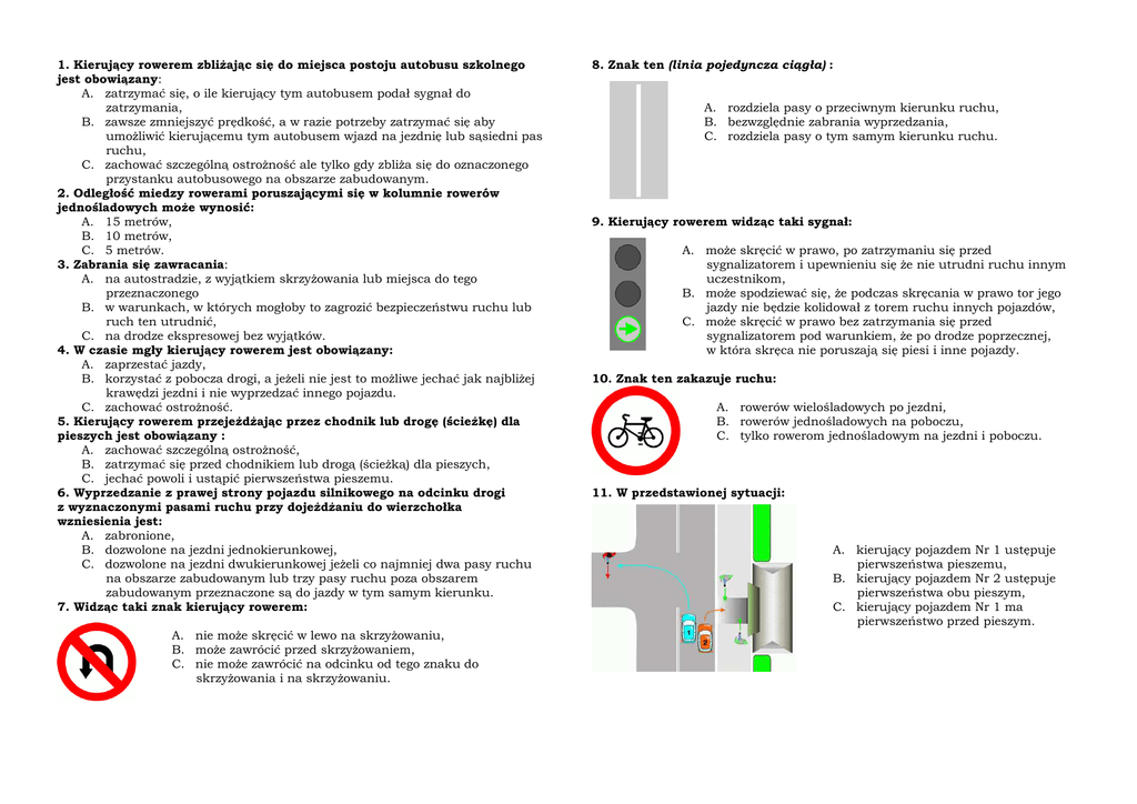 1. Kierujący rowerem zbliŜając się do miejsca postoju autobusu szkolnego jest obowiązany: A. zatrzymać się, o ile kierujący tym autobusem podał sygnał do zatrzymania, B. zawsze zmniejszyć prędkość, a w razie potrzeby zatrzymać się aby umoŜliwić kierującemu tym autobusem wjazd na jezdnię lub sąsiedni pas ruchu, C. zachować szczególną ostroŜność ale tylko gdy zbliŜa się do oznaczonego przystanku autobusowego na obszarze zabudowanym. 2. Odległość miedzy rowerami poruszającymi się w kolumnie rowerów jednośladowych moŜe wynosić: A. 15 metrów, B. 10 metrów, C. 5 metrów. 3. Zabrania się zawracania: A. na autostradzie, z wyjątkiem skrzyŜowania lub miejsca do tego przeznaczonego B. w warunkach, w których mogłoby to zagrozić bezpieczeństwu ruchu lub ruch ten utrudnić, C. na drodze ekspresowej bez wyjątków. 4. W czasie mgły kierujący rowerem jest obowiązany: A. zaprzestać jazdy, B. korzystać z pobocza drogi, a jeŜeli nie jest to moŜliwe jechać jak najbliŜej krawędzi jezdni i nie wyprzedzać innego pojazdu. C. zachować ostroŜność. 5. Kierujący rowerem przejeŜdŜając przez chodnik lub drogę (ścieŜkę) dla pieszych jest obowiązany : A. zachować szczególną ostroŜność, B. zatrzymać się przed chodnikiem lub drogą (ścieŜką) dla pieszych, C. jechać powoli i ustąpić pierwszeństwa pieszemu. 6. Wyprzedzanie z prawej strony pojazdu silnikowego na odcinku drogi z wyznaczonymi pasami ruchu przy dojeŜdŜaniu do wierzchołka wzniesienia jest: A. zabronione, B. dozwolone na jezdni jednokierunkowej, C. dozwolone na jezdni dwukierunkowej jeŜeli co najmniej dwa pasy ruchu na obszarze zabudowanym lub trzy pasy ruchu poza obszarem zabudowanym przeznaczone są do jazdy w tym samym kierunku. 7. Widząc taki znak kierujący rowerem: A. nie moŜe skręcić w lewo na skrzyŜowaniu, B. moŜe zawrócić przed skrzyŜowaniem, C. nie moŜe zawrócić na odcinku od tego znaku do skrzyŜowania i na skrzyŜowaniu. 8. Znak ten (linia pojedyncza ciągła) : A. rozdziela pasy o przeciwnym kierunku ruchu, B. bezwzględnie zabrania wyprzedzania, C. rozdziela pasy o tym samym kierunku ruchu. 9. Kierujący rowerem widząc taki sygnał: A. moŜe skręcić w prawo, po zatrzymaniu się przed sygnalizatorem i upewnieniu się Ŝe nie utrudni ruchu innym uczestnikom, B. moŜe spodziewać się, Ŝe podczas skręcania w prawo tor jego jazdy nie będzie kolidował z torem ruchu innych pojazdów, C. moŜe skręcić w prawo bez zatrzymania się przed sygnalizatorem pod warunkiem, Ŝe po drodze poprzecznej, w która skręca nie poruszają się piesi i inne pojazdy. 10. Znak ten zakazuje ruchu: A. rowerów wielośladowych po jezdni, B. rowerów jednośladowych na poboczu, C. tylko rowerom jednośladowym na jezdni i poboczu. 11. W przedstawionej sytuacji: A. kierujący pojazdem Nr 1 ustępuje pierwszeństwa pieszemu, B. kierujący pojazdem Nr 2 ustępuje pierwszeństwa obu pieszym, C. kierujący pojazdem Nr 1 ma pierwszeństwo przed pieszym. 12. Kierujący pojazdem w tej sytuacji: 16. Kierujący pojazdem Nr 1, na takim skrzyŜowaniu: A. nie musi ustąpić pierwszeństwa pieszemu, B. powinien uwaŜnie obserwować zachowanie pieszego, C. obowiązany jest zatrzymać pojazd. A. ustępuje pierwszeństwa pojazdowi Nr 3 B. ustępuje pierwszeństwa pojazdowi Nr 2 C. ma pierwszeństwo przed pojazdem Nr 2. 13. Kierujący pojazdem Nr 1 w takiej sytuacji: A. moŜe przejechać przez przejście dla pieszych z zachowaniem szczególnej ostroŜności, B. obowiązany jest zatrzymać się przed przejściem, C. moŜe kontynuować jazdę, jeśli ruszy pojazd Nr 2. 14. Na tym skrzyŜowaniu kierujący rowerem (Nr 1): A. ma pierwszeństwo przed pojazdem Nr 3, B. ustępuje pierwszeństwa pojazdowi Nr 4, C. ustępuje pierwszeństwa pojazdowi Nr 2. 15. Kierujący pojazdem Nr 1, na takim skrzyŜowaniu: A. ustępuje pierwszeństwa pojazdowi Nr 2, B. ma pierwszeństwo przed pojazdem Nr 3, C. ma pierwszeństwo przed pojazdem Nr 4. 17. Pozycja bezpieczna powinna być zastosowana: A. u nieprzytomnych ofiar wypadku, dławiących się wymiocinami, krwią lub śluzem, B. u wszystkich nieprzytomnych ofiar wypadku, z wyjątkiem osób z podejrzeniem urazu kręgosłupa, C. u wszystkich przytomnych ofiar wypadku. 18. Przy tamowaniu krwotoków stosuje się: A. opatrunek uciskowy na ranę, B. ucisk poniŜej miejsca krwawienia, C. uniesienie do góry zranionej kończyny. 19. W czasie udzielania pierwszej pomocy tętno sprawdza się: A. po obu stronach szyi, uŜywając kciuka i pozostałych palców, B. po jednej stronie szyi, trzema środkowymi palcami, C. kciukiem na przegubie ręki. 20. Pierwsza pomoc w przypadkach oparzeń to: A. gaszenie płonącej odzieŜy, B. polewanie miejsca oparzenia zimna wodą, C. unikanie ochłodzenia oparzonej skóry.