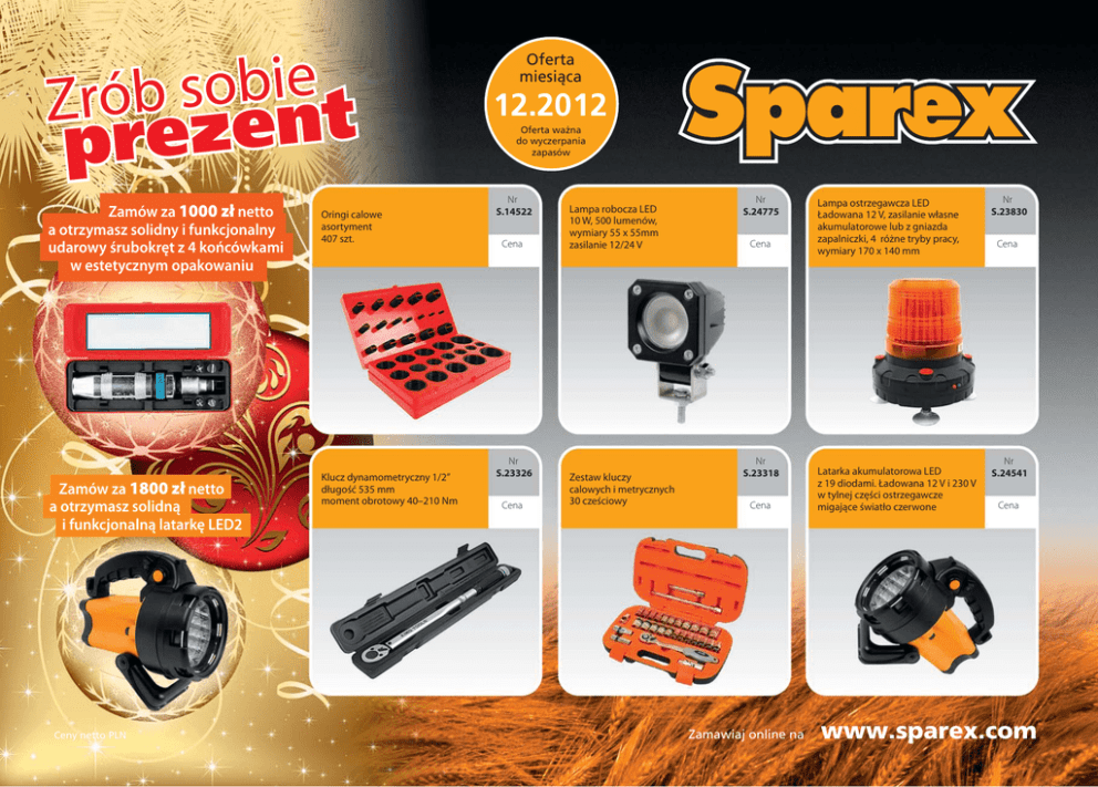 e i b o s b Zró nt preze Zamów za 1000 zł netto a otrzymasz solidny i funkcjonalny udarowy śrubokręt z 4 końcówkami w estetycznym opakowaniu Oringi calowe asortyment 407 szt. Oferta miesiàca 12.2012 Oferta wa˝na do wyczerpania zapasów Nr S.14522 Cena Lampa robocza LED 10 W, 500 lumenów, wymiary 55 x 55mm zasilanie 12/24 V Nr S.24775 Cena Lampa ostrzegawcza LED Ładowana 12 V, zasilanie własne akumulatorowe lub z gniazda zapalniczki, 4 różne tryby pracy, wymiary 170 x 140 mm Nr S.23830 Cena HIT CENOWY Zamów za 1800 zł netto a otrzymasz solidną i funkcjonalną latarkę LED2 Ceny netto PLN Klucz dynamometryczny 1/2” długość 535 mm moment obrotowy 40–210 Nm Nr S.23326 Cena Zestaw kluczy calowych i metrycznych 30 cześciowy Nr S.23318 Cena Zamawiaj online na Latarka akumulatorowa LED z 19 diodami. Ładowana 12 V i 230 V w tylnej części ostrzegawcze migające światło czerwone Nr S.24541 Cena www.sparex.com Oferta miesiàca 12.2012 Oferta wa˝na do wyczerpania zapasów Urządzenie do kontroli i regulacji wtryskiwaczy. Wyposażone w zbiornik, 3 przewody łączące i filtr. Zakres ciśnienia 800 PSI, 60 MPA Pokrowiec ochronny fotela (czarny). Pasuje do większości foteli pojedyńczych z zagłówkami Ceny netto PLN Nr S.26266 Cena Nr S.71701 Cena Urządzenie do pomiaru ciśnienia sprężania w cylindrach (Diesel). Wyposażone w komplet końcówek do otworów wtryskiwaczy i świec żarowych. Zakres ciśnienia 1000 PSI, 70 bar Ładowarka do akumulatorów ołowiowych i żelowych 12 V. Przeznaczona do akumulatorów samochodowych, motocyklowych i do łodzi Nr S.26265 Cena Dla wszystkich zamówień online powyżej 1500 zł netto transport gratis www.sparex.com Promocje Przenośna elektryczna wciągarka 12 V. Wyposażona w linkę z hakiem i przewód elektryczny 9 m. Uciąg 900 kg Nr S.24142 Cena Odwiedź nasz nowy sklep internetowy Nowości Nr S.13253 Cena Części ciągnikowe Pokrowiec ochronny fotela (czarny). Pasuje do większości foteli ciągnikowych i maszyn budowlanych Nr S.31194 Przełącznik klawiszowy podświetlany 12/24 V Cena Części maszyn Nr S.71717 Cena Nr S.5064 Przełącznik 2 pozycyjny 12/24 V Cena Oferta miesiàca 12.2012 Oferta wa˝na do wyczerpania zapasów Bezpiecznik 5A w obudowie komplet z przewodem Nr S.14693 Cena Wtyczka z przewodem spiralnym 2,8 m Nr S.79014 Obudowa bezpiecznika płaskiego standard Cena Nr S.11825 Cena Odwiedź nasz nowy sklep internetowy www.sparex.com Promocje Cena Nowości Nr S.51197 Wtyczka 2 biegunowa Cena Nr S.4340 Wskaźnik ładowania amperomierz 41 mm Dla wszystkich zamówień online powyżej 1500 zł netto transport gratis Części ciągnikowe Gniazdo 2 biegunowe Nr S.61336 Świeca żarowa Massey Ferguson Nr OEM 829162M1 Cena Zamawiaj online na Części maszyn Nr S.51198 Cena Nr S.5949 Środek ułatwiający zapłon 280 ml Cena www.sparex.com Oferta miesiàca Doradztwo techniczne i pomoc w doborze części zamiennych pod specjalnym numerem telefonu 12.2012 Nr S.1550 Cena A ul. Ogrodnicza 13, Janikowo k/ Poznania, 62-006 Kobylnica F +48 61 816 29 22 T +48 61 816 17 27, 816 19 37 Oferta wa˝na do wyczerpania zapasów 663 760 390 Linka holownicza elastyczna 2 t długość od 1,8 m do 3,8 m Sparex Polska Sp. z o.o. Nr S.52838 Przycisk rozrusznika TOWA ROWA N I E Z I M OW E Cena Końcówki na kabel Nr katalogowy Średnica kabla [mm] S.50035 7,0 S.50036 S.50037 Średnica oczka [mm] Cena 8 1,57 zł 8,5 10 2,29 zł 9,5 12,5 3,88 zł Pasy do podnoszenia i ciągnięcia ładunku, 1000 kg, szerokość 60 mm Nr katalogowy Nr S.4071 Hak przyczepki Cena Nr S.4835 Spryskiwacz szyby 12 V pojemność 1,5 L Długość pasa [m] Cena S.19218 1 15,00 zł S.19219 2 20,00 zł S.10880 3 65,00 zł Pasy do podnoszenia i ciągnięcia ładunku, 1500 kg, szerokość 46 mm Cena Nr katalogowy Cena Długość pasa [m] S.20694 2 19 zł S.20695 3 29 zł S.20696 4 39 zł Wytrzymałość Średnica swożnia [mm] Cena S.1467 1300 kg 26 9,00 zł S.1459 1800 kg 32 15,00 zł Hak ładunkowy Nr katalogowy Ceny netto PLN Zamawiaj online na www.sparex.com
