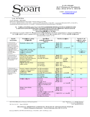 Z.A.W. STOART 00-357 Warszawa, ul. Nowy Świat 64, tel/fax: (48-22) 827 83 71, 828 25 68 e-mail: [email protected], www.stoart.org.pl L.dz. 36774/2016 Z.A.W. STOART : KRS 94940, KONCESJA MINISTERSTWA KULTURY ( Monitor Polski nr 45/1998). Nr. koncesji: DP.041/Z/19/95 z 14.02.1995 r. , rozszerzona DPA.041/Z/3/96 z 17.06.1996 r., rozszerzenie DPA.041/Z/1997 z 27.08.1997 r., rozszerzenie DP.WPA.024/145/01/ik z 15.10.2001 r., rozszerzenie DP.WPA.024/492/02/mp z 27.06.2003 r. II. TABELA STAWEK (netto – bez VAT) WYNAGRODZEŃ MINIMALNYCH ZA KORZYSTANIE Z ARTYSTYCZNYCH WYKONAŃ UTWORÓW MUZYCZNYCH I SŁOWNO – MUZYCZNYCH NA POLU ODTWORZEŃ PUBLICZNYCH Stawki obowiązujące na rok 2016 (po waloryzacji wg zasad z Tabeli VI – „Postanowienia końcowe”; średnie miesięczne wynagrodzenie w sektorze przedsiębiorstw bez wypłat nagród z zysku w grudniu 2014 roku wynosiło 4.378,45 zł a w grudniu 2015 r. 4.514,41 zł; stąd współczynnik przeszacowania wynosi 3,1 %) Sposób korzystania Przykładowy rodzaj działalności 1. Wykorzystywanie artystycznych wykonań utworów muzycznych i słowno – muzycznych, jako elementu pierwszoplanowego i niezbędnego w danym rodzaju działalności (nie ma możliwości prowadzenia działalności bez artystycznych wykonań utworów muzycznych i słowno muzycznych) 2. Wykorzystywanie artystycznych wykonań utworów muzycznych i słowno – muzycznych, jako elementu drugoplanowego lecz integralnego 3 . Wykorzystywanie artystycznych wykonań jako elementu towarzyszącego podstawowej działalności (odtworzenia nie są koniecznym elementem działalności ) Dyskoteki, zabawy, bale Szafy grające, karaoke, inne urządzenia odtwarzające odpłatnie wykonania artystyczne Pokazy mody, widowiska, specyficzne dyscypliny sportowe (jak jazda figurowa na lodzie, gimnastyka artystyczna i.t.p.) Ośrodki taneczne, kursy tańca, aerobic Festyny i imprezy rekreacyjne i sportowe, targi, wystawy nagłośnienie całości powierzchni Lokale gastronomiczne Zakłady usługowe Sklepy i inne obiekty handlowe Określenie wielkości podmiotu lub imprezy do 50 miejsc do 100 do 200 powyżej 200 38,35 98,69 197,28 389,72 PLN PLN PLN PLN za imprezę Stawka % od wpływów (patrz uwagi pkt 2) 4 lub 4 od wpływów z urządzenia do 200 miejsc do 500 miejsc powyżej 500 miejsc do 20 miejsc do 50 miejsc do 100 miejsc do 100 uczestników do 200 uczestników do 500 uczestników powyżej 500 uczestników do 20 miejsc do 50 miejsc powyżej 50 miejsc do 20 m2 do 50 m2 powyżej 50 m2 nagłośnionej powierzchni usługowej dostępnej dla klienta do 50 m2 do 100 m2 do 200 m2 za każde następne rozpoczęte 100 m2 nagłośnionej powierzchni handlowej dostępnej dla klienta KRS 94940, Sąd Rej.dla m.st.Warszawy, XII Wydz.Gosp.K.R.S. NIP: 526-13-36-718 Stawka ryczałtowa Regon: 010934284 98,69 PLN 197,28 PLN 389,72 PLN za każdy dzień imprezy 9,24 PLN 20,23 PLN 38,35 PLN za 1 grupę/zajęcie 38,35 PLN 98,69 PLN 197,28 PLN 389,72 PLN za dzień 98,69 PLN 197,28 PLN 389,72 PLN za 1 miesiąc 38,35 PLN 98,69 PLN 197,28 PLN za 1 miesiąc 38,35 PLN 98,69 PLN 197,28 PLN 3 lub 3 0,5 lub lub 0,2 lub 0,2 lub + 20,23 PLN za 1 miesiąc Bank PEKAO S.A., V oddział / Warszawa Nr 73 124010661111000000062949 Swift: PKOPPLPWWA5 ORGANIZACJA ZBIOROWEGO ZARZĄDZANIA PRAWAMI DO ARTYSTYCZNYCH WYKONAŃ Collective Management Organisation - Union of Performing Artists „ S T O A R T ” Koncesja MKiDN nr DP.WPA 024/492/02 mp z 27.06.2003 r. (M.P. 18/2004 poz. 322) 0,2 Strona 2 z 2 Hotele, pensjonaty, ośrodki wypoczynkowe (odtworzenia w pomieszczeniach ogólnie dostępnych) do 20 miejsc hotelowych do 50 miejsc hotelowych do 100 miejsc hotelowych powyżej 100 miejsc hotelowych Audio – za pokój Video – za pokój 38,35 98,69 197,28 389,72 Środki transportu pasażerskiego (odtworzenia na pokładach statków, samolotów, autobusów i in.) do 50 miejsc do 100 miejsc do 500 miejsc powyżej 500 miejsc Kina (odtworzenia w przerwach między seansami) do 100 miejsc do 200 miejsc powyżej 200 miejsc 20,23 PLN 38,35 PLN 98,69 PLN lub 197,28 PLN za rejs lub 1 dzień rejsu w przypadku rejsów wielodniowych 98,69 PLN lub 197,28 PLN 389,72 PLN za 1 miesiąc Centrale telefoniczne odtwarzające w czasie oczekiwania artystyczne wykonania do 10 aparatów każdy następny do 100 aparatów każdy następny do 200 aparatów każdy następny powyżej 200 aparatów Hotele, pensjonaty, ośrodki wypoczynkowe (odtworzenia w pokojach) PLN PLN lub PLN PLN za 1 miesiąc 9,24 PLN 20,23 PLN za 1 miesiąc 29,13 PLN 0,38 PLN 0,20 PLN 0,98 PLN za 1 miesiąc 0,2 0,1 lub Odtworzenia przez telefon artystycznych wykonań jako elementu usług audiotekstowych 0,1 0,1 1 opłat uzyskanych przez operatora usługi za zarejestrowane połączenia *stawka pobierana w przypadku jeśli 100% repertuaru wykorzystanego przez danego użytkownika w przyjętym okresie rozliczeniowym jest reprezentowane przez STOART; jeśli STOART nie reprezentuje całości wykorzystywanego repertuaru – pobierane wynagrodzenie jest zmniejszane w poszczególnych okresach rozliczeniowych odpowiednio o udział repertuaru reprezentowanego przez inne organizacje zbiorowego zarządu upoważnione do pobierania wynagrodzeń na tym samym polu eksploatacji UWAGI 1. Fakt odtworzenia publicznego artystycznego wykonania nie zależy od środków technicznych jakimi posłużono się w tym celu (odtworzenie taśmy, płyty CD, dowolnego innego nośnika elektronicznego, przekaz satelitarny itp.) ani od tego, czy artystyczne wykonanie jest odtwarzane samoistnie, czy też stanowi część większej całości (np. program radiowy lub telewizyjny) 2. Stawka procentowa stosowana jest tam gdzie nie ustalono stawki zryczałtowanej lub na żądanie użytkownika, jej podstawę stanowią wpływy brutto (bez VAT) z działalności, z którą związane jest odtwarzanie artystycznych wykonań. 3. Honorarium wyliczone procentowo nie może być niższe niż 50% stawki kwotowej przewidzianej dla danego użytkownika. 4. W przypadku i