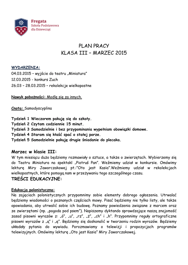 PLAN PRACY KLASA III – MARZEC 2015 WYDARZENIA: 04.03.2015 – wyjście do teatru „Miniatura” 12.03.2015 - konkurs Zuch 26.03 – 28.03.2015 – rekolekcje wielkopostne Nawyk pobożności: Modlę się za innych. Cnota: Samodyscyplina Tydzień Tydzień Tydzień Tydzień Tydzień 1 2 3 4 5 Wieczorem pakuję się do szkoły. Czytam codziennie 15 minut. Samodzielnie i bez przypominania wypełniam obowiązki domowe. Staram się kłaść spać o stałej porze. Samodzielnie pakuję drugie śniadanie do plecaka. Marzec w klasie III: W tym miesiącu dużo będziemy rozmawiały o sztuce, a także o zwierzętach. Wybierzemy się do Teatru Miniatura na spektakl „Piotruś Pan”. Weźmiemy udział w konkursie. Omówimy lekturę Miry Jaworczakowej pt.:”Oto jest Kasia”.Weźmiemy udział w rekolekcjach wielkopostnych, które pomogą nam w przeżywaniu tego szczególnego czasu. TREŚCI EDUKACYJNE: Edukacja polonistyczna: Na zajęciach polonistycznych przypomnimy sobie elementy dobrego ogłoszenia. Utrwalać będziemy wiadomości o poznanych częściach mowy. Pisać będziemy nie tylko listy, ale także opowiadania, aby utrwalić sobie ich budowę. Poznamy powiedzenia związane z marcem oraz ze zwierzętami (np. „pogoda pod psem”). Napiszemy dyktando sprawdzające naszą znajomość zasad pisowni wyrazów z: „ó”, „u”, „rz”, „ż”, „ch” i „h”. Przypomnimy reguły ortograficzne pisowni wyrazów z „ą” i „ę”. Będziemy się doskonalić w tworzeniu rodzin wyrazów. Będziemy układały pytania do wywiadu. Porozmawiamy o telewizji i propozycjach programów telewizyjnych. Omówimy lekturę „Oto jest Kasia” Miry Jaworczakowej. Edukacja matematyczna: W marcu będziemy układały zadania do działań. Będziemy doskonaliły dodawanie, odejmowanie i mnożenie w zakresie 100. Utrwalimy kolejność wykonaywania działań. Poznamy kolejne ważne i trudne działanie, a mianowicie dzielenie. Skonstruujemy gry matematyczne. Edukacja plastyczna/techniczna: W marcu dużo rozmawiać będziemy o malarstwie. Poznamy kilka reprodukcji popularnych obrazów. Poeksperymentujemy z farbami – mieszanie kolorów. Techniką kropelek wykonamy pracę na dowolny temat. Stworzymy plakat reklamujacy ulubione urządzenie. Wykonamy portret „Pana Marca” oraz ryby z origami. Utrwalimy pojęcia: martwa natura, pejzaż, portret, abstrakcja. Edukacja przyrodnicza: Rozmawiać będziemy o różnych gatunkach zwierząt: ptakach, ssakach, gadach, płazach, rybach i owadach. Bliżej poznamy zwyczaje i rasy psów oraz kotów. Edukacja społeczna: W marcu rozmawiać będziemy o problemie bezdomności zwierząt. Zastanowimy się w jaki sposób możemy pomóc porzuconym zwierzętom. TREŚCI WYCHOWAWCZE: W marcu pracować będziemy nad samodyscypliną, która swój początek ma w dyscyplinie nałożonej z zewnątrz, przez rodziców i wychowawców. Dzieci potrzebują granic dla swych zachowań, tak jak rzeki potrzebują trwałych i mocnych brzegów, by nie rozlewały się w sposób niekontrolowany i niszczycielski. Dyscyplina jest procesem uczenia dzieci samokontroli i respektowania rozsądnych zasad współżycia społecznego. Ucząc samodyscypliny, czyli umiejętności kierowania własnymi zachowaniami, przygotowujemy dzieci do szczęśliwego życia. Samodyscyplina to dyscyplinowanie samego siebie. Jest ona wyrazem dojrzałości, dlatego jej nauczanie to na ogół długi proces. Celami samodyscypliny są umiar oraz rozwój własnego potencjału. Umiar to umiejętność nakładania sobie ograniczeń, wyznaczania granic, zaś rozwój własnego potencjału to droga do samodoskonalenia. Samodyscyplina wymaga: - planowania - wytrwałości - silnej woli - motywacji - samokontroli Samokontrolę można i należy stosować we wszystkich dziedzinach życia. Od tej umiejętności zależy, czy stosujemy umiar na przykład w jedzeniu lub oglądaniu telewizji, czy potrafimy kontrolować wyrażanie własnych emocji, swój język i zachowanie, odsuwać negatywne myśli, wybaczać, a także rozwijać swoje talenty. Samodyscyplinę stosujemy wobec samych siebie, ale jej skutki dotyczą nie tylko nas. Na przykład, kiedy powściągamy swój impulsywny gniew – nie ranimy innych, kiedy przezwyciężamy lenistwo - szybciej wykonujemy pracę, na którą ktoś czeka, z umiarem oglądamy telewizję – mamy więcej czasu, by pomagać innym członkom rodziny.