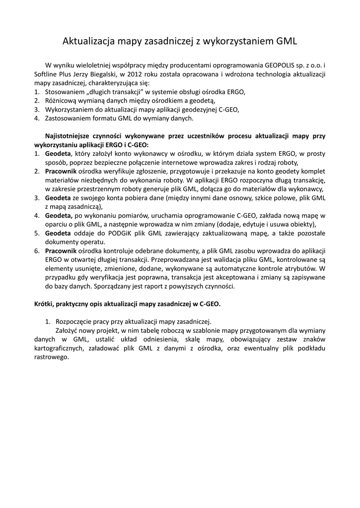 Aktualizacja mapy zasadniczej z wykorzystaniem GML W wyniku wieloletniej współpracy między producentami oprogramowania GEOPOLIS sp. z o.o. i Softline Plus Jerzy Biegalski, w 2012 roku została opracowana i wdrożona technologia aktualizacji mapy zasadniczej, charakteryzująca się: 1. Stosowaniem „długich transakcji” w systemie obsługi ośrodka ERGO, 2. Różnicową wymianą danych między ośrodkiem a geodetą, 3. Wykorzystaniem do aktualizacji mapy aplikacji geodezyjnej C-GEO, 4. Zastosowaniem formatu GML do wymiany danych. Najistotniejsze czynności wykonywane przez uczestników procesu aktualizacji mapy przy wykorzystaniu aplikacji ERGO i C-GEO: 1. Geodeta, który założył konto wykonawcy w ośrodku, w którym działa system ERGO, w prosty sposób, poprzez bezpieczne połączenie internetowe wprowadza zakres i rodzaj roboty, 2. Pracownik ośrodka weryfikuje zgłoszenie, przygotowuje i przekazuje na konto geodety komplet materiałów niezbędnych do wykonania roboty. W aplikacji ERGO rozpoczyna długą transakcję, w zakresie przestrzennym roboty generuje plik GML, dołącza go do materiałów dla wykonawcy, 3. Geodeta ze swojego konta pobiera dane (między innymi dane osnowy, szkice polowe, plik GML z mapą zasadniczą), 4. Geodeta, po wykonaniu pomiarów, uruchamia oprogramowanie C-GEO, zakłada nową mapę w oparciu o plik GML, a następnie wprowadza w nim zmiany (dodaje, edytuje i usuwa obiekty), 5. Geodeta oddaje do PODGiK plik GML zawierający zaktualizowaną mapę, a także pozostałe dokumenty operatu. 6. Pracownik ośrodka kontroluje odebrane dokumenty, a plik GML zasobu wprowadza do aplikacji ERGO w otwartej długiej transakcji. Przeprowadzana jest walidacja pliku GML, kontrolowane są elementy usunięte, zmienione, dodane, wykonywane są automatyczne kontrole atrybutów. W przypadku gdy weryfikacja jest poprawna, transakcja jest akceptowana i zmiany są zapisywane do bazy danych. Sporządzany jest raport z powyższych czynności. Krótki, praktyczny opis aktualizacji mapy zasadniczej w C-GEO. 1. Rozpoczęcie pracy przy aktualizacji mapy zasadniczej. Założyć nowy projekt, w nim tabelę roboczą w szablonie mapy przygotowanym dla wymiany danych w GML, ustalić układ odniesienia, skalę mapy, obowiązujący zestaw znaków kartograficznych, załadować plik GML z danymi z ośrodka, oraz ewentualny plik podkładu rastrowego. 2. Aktualizacja mapy wektorowej. Do aktualizacji mapy wektorowej jest udostępniona funkcja wywoływana ikonką Mapa obiektowa. Użytkownik wybiera odpowiedni obiekt z listy w oknie Mapy obiektowej, rysuje go na mapie. W zależności od typu obiektu dostępne są funkcje tworzenia obiektów punktowych, liniowych, powierzchniowych, etykiet. Ostatnio wybrane obiekty są zapamiętane, tak aby szybko można było je użyć ponownie. Nowe obiekty mapy są oparte na punktach powstałych po wykonaniu obliczeń, transmisji z tachimetrów, odbiorników GPS, ewentualnie zaimportowanych z plików tekstowych, lub innych formatów danych. Jeśli geodeta stosuje kodowanie w terenie, wówczas zaimportowane punkty jak i całe obiekty generują się automatycznie na mapie, operator kontroluje jedynie ich poprawność przypisania do odpowiedniej kategorii, oraz uzupełnia ich atrybuty. Po zakończeniu rysowania obiektu, wyświetla się lista jego atrybutów do wypełnienia: Wszystkie wymagane pola (oznaczone na czerwono) należy wypełnić. Jeśli jakieś pole pozostanie niewypełnione, program będzie to sygnalizował, ale umożliwi zakończenie edycji danych. Naciśnięcie prawego klawisza myszki na nazwie pola pozwala na ustalenie dla danego pola wartości domyślnej – takiej jak aktualnie wybrana. Przy wypełnianiu danych następnych obiektów tego samego typu program będzie podpowiadał zapamiętaną wartość. 3. Usuwanie i edycja obiektów W razie potrzeby usunięcia już istniejącego na mapie obiektu – po jego wybraniu, usuwa się go poprzez wciśnięcia klawisza Delete. Jeżeli istniejący już obiekt powinien mieć zmodyfikowaną geometrię (położenie na mapie), należy go wybrać i dodać lub usunąć punkty załamania, ewentualnie wykonać inne operacje zmieniające jego geometrię. Jeśli zmianie podlegać ma nie geometria, ale atrybuty obiektu, w oknie atrybutów modyfikuje się ich wartość. 4. Wygenerowanie wyników aktualizacji mapy zasadniczej. Po zakończeniu pracy, należy utworzyć plik GML - w menu Plik-Eksport, lub w oknie Projektów rozwinąć „drzewko” projektu i tabeli, na pozycji Warstwy kliknąć prawym klawiszem myszki i wybrać opcję Eksportuj do... XML-GML. Program zapyta się o zmianę kolejności osi X/Y (wybrać TAK), dalej zostanie zaproponowana nazwa eksportowanego pliku, można też wybrać rodzaj rozszerzenia - GML lub od razu ZIP – powstanie wówczas od razu plik GML zarchiwizowany, gotowy do wysłania do ośrodka. W trakcie tworzenia pliku wykonywana jest procedura walidacji – kontroli zgodności z szablonem XSD, a ewentualne błędy są sygnalizowane w pliku z raportem błędów, ponadto wszystkie obiekty, które miały błędy w geometrii lub atrybutach są oznaczone w bazie danych CGEO i na mapie w wyraźny sposób, ułatwiający ich odnalezienie i wykonanie poprawek. Korzyści wynikające z zastosowanej technologii: 1. Ośrodek przekazuje geodecie materiały drogą elektroniczną z zasobu, w którym mapa zasadnicza jest przechowywana w bazie danych, 2. Geodeta bez zbędnego oczekiwania, otrzymuje kompletne dane w postaci cyfrowej, 3. Opracowanie wyników pomiarów i aktualizacja mapy obiektowej wykonywane jest przez geodetę w jego aplikacji geodezyjnej, którą zna od lat, wykorzystuje na każdym etapie przetwarzania danych. 4. Geodeta nie jest zmuszany do zakupu i stosowania oprogramowań przeznaczonych z zasady do prowadzenia zasobu przez ośrodki dokumentacji, a nie dla wykonawcy robót geodezyjnych. 5. Zaktualizowana mapa jest przesyłana do ośrodka w postaci elektronicznej, pracownik ośrodka 