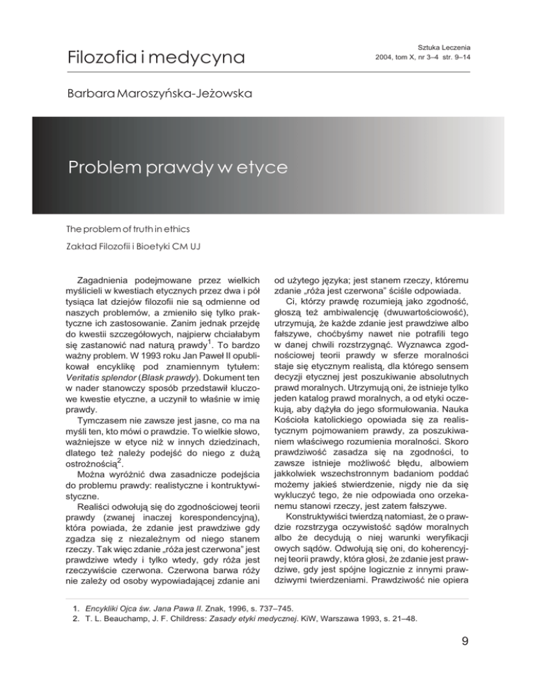 Sztuka Leczenia 2004, tom X, nr 3–4 str. 9–14 Filozofia i medycyna Barbara Maroszyñska-Je¿owska Problem prawdy w etyce The problem of truth in ethics Zak³ad Filozofii i Bioetyki CM UJ Zagadnienia podejmowane przez wielkich myœlicieli w kwestiach etycznych przez dwa i pó³ tysi¹ca lat dziejów filozofii nie s¹ odmienne od naszych problemów, a zmieni³o siê tylko praktyczne ich zastosowanie. Zanim jednak przejdê do kwestii szczegó³owych, najpierw chcia³abym siê zastanowiæ nad natur¹ prawdy1. To bardzo wa¿ny problem. W 1993 roku Jan Pawe³ II opublikowa³ encyklikê pod znamiennym tytu³em: Veritatis splendor (Blask prawdy). Dokument ten w nader stanowczy sposób przedstawi³ kluczowe kwestie etyczne, a uczyni³ to w³aœnie w imiê prawdy. Tymczasem nie zawsze jest jasne, co ma na myœli ten, kto mówi o prawdzie. To wielkie s³owo, wa¿niejsze w etyce ni¿ w innych dziedzinach, dlatego te¿ nale¿y podejœæ do niego z du¿¹ ostro¿noœci¹2. Mo¿na wyró¿niæ dwa zasadnicze podejœcia do problemu prawdy: realistyczne i kontruktywistyczne. Realiœci odwo³uj¹ siê do zgodnoœciowej teorii prawdy (zwanej inaczej korespondencyjn¹), która powiada, ¿e zdanie jest prawdziwe gdy zgadza siê z niezale¿nym od niego stanem rzeczy. Tak wiêc zdanie „ró¿a jest czerwona” jest prawdziwe wtedy i tylko wtedy, gdy ró¿a jest rzeczywiœcie czerwona. Czerwona barwa ró¿y nie zale¿y od osoby wypowiadaj¹cej zdanie ani od u¿ytego jêzyka; jest stanem rzeczy, któremu zdanie „ró¿a jest czerwona” œciœle odpowiada. Ci, którzy prawdê rozumiej¹ jako zgodnoœæ, g³osz¹ te¿ ambiwalencjê (dwuwartoœciowoœæ), utrzymuj¹, ¿e ka¿de zdanie jest prawdziwe albo fa³szywe, choæbyœmy nawet nie potrafili tego w danej chwili rozstrzygn¹æ. Wyznawca zgodnoœciowej teorii prawdy w sferze moralnoœci staje siê etycznym realist¹, dla którego sensem decyzji etycznej jest poszukiwanie absolutnych prawd moralnych. Utrzymuj¹ oni, ¿e istnieje tylko jeden katalog prawd moralnych, a od etyki oczekuj¹, aby d¹¿y³a do jego sformu³owania. Nauka Koœcio³a katolickiego opowiada siê za realistycznym pojmowaniem prawdy, za poszukiwaniem w³aœciwego rozumienia moralnoœci. Skoro prawdziwoœæ zasadza siê na zgodnoœci, to zawsze istnieje mo¿liwoœæ b³êdu, albowiem jakkolwiek wszechstronnym badaniom poddaæ mo¿emy jakieœ stwierdzenie, nigdy nie da siê wykluczyæ tego, ¿e nie odpowiada ono orzekanemu stanowi rzeczy, jest zatem fa³szywe. Konstruktywiœci twierdz¹ natomiast, ¿e o prawdzie rozstrzyga oczywistoœæ s¹dów moralnych albo ¿e decyduj¹ o niej warunki weryfikacji owych s¹dów. Odwo³uj¹ siê oni, do koherencyjnej teorii prawdy, która g³osi, ¿e zdanie jest prawdziwe, gdy jest spójne logicznie z innymi prawdziwymi twierdzeniami. Prawdziwoœæ nie opiera 1. Encykliki Ojca œw. Jana Pawa II. Znak, 1996, s. 737–745. 2. T. L. Beauchamp, J. F. Childress: Zasady etyki medycznej. KiW, Warszawa 1993, s. 21–48. 9 Problem prawdy w etyce siê wiêc tutaj na zgodnoœci z pewnym niezale¿nym faktem, ca³kowicie zale¿y od dobrego przystawania do innych prawdziwych twierdzeñ. Mo¿e siê to wydawaæ bardzo zawi³e, ale ostatecznie jest doœæ proste. Sprzeciwiaj¹ siê oni temu, by szukaæ nieosi¹galnej, mo¿e ostatecznej instancji, le¿¹cej poza sfer¹ ludzkiego jêzyka i ludzkiej praktyki. Chc¹ natomiast szukaæ prawdy, która rodzi siê w granicach ludzkiej spo³ecznoœci. Prawda – powiadaj¹ – jest konstruowana przez ludzi ¿yj¹cych we wspólnocie. Gdy chodzi o kwestie moralne, nie nale¿y szukaæ rzeczywistoœci zewnêtrznej wobec regu³, które ludzie tworz¹ i do których siê stosuj¹. Maj¹ te¿ rozwiniêty zmys³ historyczny, uwa¿aj¹ ¿e pretensje do prawdziwoœci uzale¿nia siê od konkretnych epok i warunków historycznych. Istniej¹ dwa zasadnicze typy konstruktywizmu etycznego: 1. Konstruktywizm relatywistyczny, twierdzi on, ¿e prawda jest wzglêdna, relatywna. Nie ma wiêc absolutnych prawd moralnych, gdy¿ zale¿¹ one od spo³eczeñstwa albo sposobu ¿ycia. Zwolenników koherencyjnej teorii prawdy, którzy s¹ zarazem relatywistami, okreœla siê czasem jako antyrealistów. Rzecznicy tego stanowiska uwa¿aj¹ s¹dy moralne za subiektywne, gdy¿ zale¿¹ one od pogl¹dów tych, którzy je wypowiadaj¹. 2. Konstruktywizm nie musi byæ jednak relatywistyczny. Zwolennicy tego pogl¹du bêd¹ g³osiæ, ¿e prawdziwoœæ s¹du moralnego zale¿y od jego oczywistoœci (to jest od jego przystawalnoœci), to jednak spójnoœci owej nie mo¿na ograniczaæ do pogl¹dów ¿ywionych w okreœlonym czasie i okreœlonym spo³eczeñstwie, istnieje bowiem jeden zespó³ moralnych tez, które prawdziwe bêd¹ tylko wtedy, gdy utworz¹ ca³oœæ obejmuj¹c¹ ca³¹ wspólnotê ludzk¹. S¹dy te uznaj¹ za obiektywne, gdy¿ zak³adaj¹ istnienie jednego tylko zespo³u prawd moralnych, który poznany zostanie z chwil¹ osi¹gniêcia optymalnej spójnoœci wszystkich tez. Zanim to nast¹pi, b³¹d jest zawsze mo¿liwy. Warto zauwa¿yæ, ¿e zarówno realiœci jak i nierelatywistyczni konstruktywiœci uznaj¹ prawdy moralne za obiektywne, termin ten nie charakteryzuje zatem precyzyjnie stanowisk etycznych. 3. Platon: Pañstwo. Warszawa, 1990. 10 Etyczni realiœci bardzo czêsto odwo³ywaæ siê bêd¹ do metafizyki, zale¿eæ im bêdzie na wskazaniu pewnej transcendentnej podstawy dla s¹dów moralnych. Konstruktywiœci nierealistyczni rezygnuj¹ z metafizycznych rozwa¿añ, gdy¿ dla nich prawdy moralne maj¹ oparcie w jêzyku ludzkim i jego u¿yciu. Nale¿y dokonaæ rozró¿nienia pomiêdzy koherencj¹ jako testem prawdziwoœci, a koherencj¹ jako arbitrem. Etyczny realista (zwolennik prawdy jako odpowiednioœci) ³atwo mo¿e przystaæ na to, ¿e „dobre przystawanie” jest wygodnym sprawdzianem zgodnoœci danego s¹du z niezale¿nym dla niego stanem rzeczy. Czym innym jest teza, ¿e koherencja rozstrzyga o prawdziwoœci, a takie jest stanowisko kontru