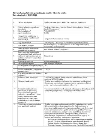 Kierunek, specjalność, specjalizacja studiów historia sztuki Rok akademicki 2009/2010 1. Nazwa przedmiotu Sztuka przełomu wieku XIX i XX – wybrane zagadnienia 2. Nazwa jednostki prowadzącej przedmiot Kod przedmiotu* Język przedmiotu Wydział Historyczny, Instytut Historii Sztuki, Zakład Historii Sztuki Nowoczesnej WH.IHS-0174 Polski 5. Grupa treści kształcenia, w ramach której przedmiot jest realizowany* Grupa treści kształcenia do wyboru 6. Typ przedmiotu* 7. Rok studiów, semestr 3. 4. 8. 9. 10. 11. 12 13 Imię i nazwisko osoby (osób) prowadzącej przedmiot Imię i nazwisko osoby (osób) egzaminującej bądź udzielającej zaliczenia w przypadku, gdy nie jest nim osoba prowadząca dany przedmiot Formuła przedmiotu Wymagania wstępne* Liczba godzin zajęć dydaktycznych 15 Liczba punktów ECTS przypisana przedmiotowi* Czy podstawa obliczenia średniej ważonej?* Założenia i cele przedmiotu 16 Metody dydaktyczne 17 Forma i warunki zaliczenia przedmiotu, w tym zasady dopuszczenia do egzaminu, zaliczenia z przedmiotu, a także formę i warunki zaliczenia poszczególnych form zajęć wchodzących w zakres danego przedmiotu Treści merytoryczne przedmiotu oraz sposób ich realizacji 14 18 Fakultatywny – dowolnego wyboru (dla wszystkich studentów) Studia I stopnia (1-3 rok) i jednolite studia magisterskie (4-5), stacjonarne i niestacjonarne Prof. dr hab. Tomasz Gryglewicz Nie dotyczy Wykład monograficzny Brak wymagań wstępnych 30 1 ECTS NIE Przekazać słuchaczom wiedzę z zakresu historii sztuki okresu przełomu XIX i XX wieku Wykład monograficzny (informacyjny a zarazem problemowy) ilustrowany przezroczami przygotowanymi w programie Power point i wyświetlanymi rzutnikiem cyfrowym Test pisemny na końcowych zajęciach, polegający na identyfikacji dzieł sztuki, których reprodukcje zostaną wyświetlone na ekranie Wykład prezentuje sztukę ostatnich lat XIX wieku i początku wieku XX na przykładzie wybranych problemów. Będzie dotyczyć w pierwszym rzędzie zagadnień związanych z malarstwem, ale również będzie omawiana tematyka grafiki artystycznej, grafiki użytkowej, rzemiosła artystycznego, design `u oraz architektury. Dominować będzie problematyka historii sztuki powszechnej, aczkolwiek poruszane będą też problemy z zakresu historii sztuki polskiej na zasadzie porównawczej. Problematyka wykładów: Symbolizm a postimpresjonizm: rola środowiska paryskiego lat 80-tych i 90-tych. Późna twórczość impresjonistów Moneta, Degasa, Renoira. Neoimpresjoniści: Seurat, Signac. Rola Toulouse-Lautreca; Gauguin i syntetyzm. Symboliści francuscy i 1 19 Wykaz literatury podstawowej i uzupełniającej, obowiązującej do zaliczenia danego przedmiotu grupa Nabis. Rzeźba Rodina i reakcja na nią po 1900 roku. Poza Paryżem: École de Nancy. Protoekspresjonizm Van Gogha, Jamesa Ensora i Edwarda Muncha. Sztuka secesji monachijskiej, berlińskiej i wiedeńskiej. Inne środowiska modern style i art nouveaux: Stany Zjednoczone Ameryki Północnej, Wielka Brytania - Londyn i Glasgow, Barcelona, Bruksela, Praga, Budapeszt i Kraków. Zakres dziedzinowy: historia sztuki nowoczesnej Literatura podstawowa: 1. Mieczysław Porębski, Dzieje sztuki w zarysie, tom 3: Wiek XIX i XX, Warszawa 1988 2. Moderniści o sztuce, wybrała, opracowała i wstępem opatrzyła Elżbieta Grabska, Warszawa 197. Literatura uzupełniająca: 1. Wiesław Juszczak, Postimpresjoniści, Warszawa 1972. 2. Kirk Varnedoe, Wien 1900. Kunst, Architektur & design, Köln 1987 3. Gabriele Fahr-Becker, Jugenstil, Köln 1996 4. Bruksela-Kraków 1890-1920. Młoda Polska, Bruksela 1997 5. Andrzej Szczerski, Wzorce tożsamości. Recepcja sztuki brytyjskiej w Europie Środkowej około roku 1900 (Ars vetus et nova, t. X), Kraków 200 6. Tomasz Gryglewicz, Malarstwo Europy Środkowej 1900-1914. Tendencje modernistyczne i wczesnoawangardowe, Kraków 1992 7. Tomasz Gryglewicz, Tendencje regionalistycznonarodowe w środkowoeuropejskim malarstwie około 1900 roku, „Folia Historiae Artium”, t. XXVIII (1992), s. 113149 8. Dorota Leśniak-Rychlak, Charles Rennie Mackintosh architektura, Kraków 2004 2