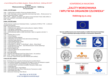 „Co powie Ryba gdy Mors po Bałtyku zimą pływa – Światowy Zlot Morsów – Kołobrzeg 2013-2015” Program Międzynarodowego Spotkania Morsów – Kołobrzeg 4-6 styczeń 2013 1 dzień - 4.01.2013 piątek 14:00 – 17:00 Przyjazd uczestników Światowego Spotkania Morsów, 17:00 - 19:00 Przywitanie z morzem, rozgrzewka, nocne mycie nóg i karku - „Wioska morsowa” na plaży przy Kamiennym Szańcu , ognisko 20:00 – 24:00 –– spotkanie „koszykowe” przy muzyce na żywo kawiarnia Verano, każdy zabiera ze sobą koszyk smakołyków i przysmaków dla siebie i przyjaciół 24:00 – nocleg KONFERENCJA NAUKOWA „ZALETY MORSOWANIA I WPŁYW NA ORGANIZM CZŁOWIEKA” Kołobrzeg 05.01.2013 2 dzień - 5.01.2013 sobota „Wioska morsowa” na plaży przy Kamiennym Szańcu, w godzinach od 10:00 do 17:00 – w zależności od pogody przewidujemy: 10:00 – 10:45 Chrzest Nowicjuszy 10:00 – 17:00 Ruska bania i gorąca beczka na plaży połączone z kąpielą w Bałtyku 10:00 – 17:00 Ognisko z kiełbaskami, 10:00 – 15:00 Jednostki pływające Straży granicznej na redzie 11:00 – 14:00 Konferencja naukowa „Zalety morsowania i wpływ na organizm człowieka” w VERANO 11:00 – 12:00 Bieg Morsa na plaży 12:30 – 15:30 Lot balonem, 12:00 – 17:00 Kulig Świętego Mikołaja, 12:00 – 17:00 Summer Car-zwiedzanie strefy uzdrowiskowej Kołobrzegu 12:00 – 13:00 Pokaz Mody Morsowej 12:00 – 17:00 Przejażdżki Quady na plaży 12:00 – 13:00 Turniej piłki siatkowej 12:00 - 13:00 Konkurs na „siłaczkę – Foczka Strong”, „siłacza – Morsa Strong” 12:30 – 13:30 Konkurencja na celność – „Rzut Morsem beretem” do koła ratunkowego 13:00 – 14:00 Konkurencja bulle 13:00 - 14:00 Przeciąganie liny 15:00 – 17:00 Ocena składu ciała oraz porady dietetyczne 15:30 – 17:00 Firewalking 17:00 – Pokaz fajerwerków 19:30 – Wyjazd do Hali Milenium (spod Groty Solnej Verano - dwa autokary) 20:00 – 02:00 – Światowy Bal Morsów w Hali Milenium 02:15 – Powrót do Verano/Wistomu spod Hali Milenium (dwa autokary) Operacja współfinansowana przez Unię Europejską ze środków finansowych Europejskiego Funduszu Rybackiego zapewniającą inwestycje w zrównoważone rybołówstwo. Razem można więcej 3 dzień 6.01.2013 niedziela 08:30 – 09:30 Msza Święta w Katedrze Kołobrzeskiej dla wszystkich Morsów 10:30 – 10:45 Zbiórka uczestników, przygotowanie do parady, na czele wóz policyjny na sygnale 10:45 – 11:15 Wymarsz klubów ulicami Kołobrzegu do „Wioski Morsów” 11:30 – 11:45 Hymn Morsów i powitanie uczestników Zlotu przez władze miasta 11:45 – 12:00 Rozgrzewka 12:00 – 12:20 Wspólna kąpiel w falach Bałtyku 12:00 – 14:00 Jednostki pływające Straży Granicznej oraz Turystyczne na redzie 12:30 – 14:00 Wspólna zupa rybna 14:00 – Zakończenie Światowego Zlotu Morsów Biuro Zlotu: tel. 94 35 53 000 e-mail: [email protected] PATRONAT HONOROWY PROGRAM KONFERENCJI Regionalne Stowarzyszenie Turystyczno-Uzdrowiskowe w Kołobrzegu Kołobrzeski Klub Morsów Katedra i Zakład Fizjologii Uniwersytetu Medycznego im. Karola Marcinkowskiego w Poznaniu, Katedra Biologii Medycznej Collegium Medicum Uniwersytetu Mikołaja Kopernika w Toruniu 05 styczeń 2013 r. 10 Otwarcie konferencji 10 20 Projekcja filmu promującego współczesny Kołobrzeg. 30 Prezentacja klubu Nødebo Vikings oraz omówienie różnych aspektów działalności klubu w tym współpracy z magistratem, z innymi klubami oraz rozwiązywanie konfliktów wynikających z korzystania z tej samej infrastruktury. 50 mgr Ryszard Woźniak – „Geneza powstania i funkcjonowanie Kołobrzeskiego Klubu Morsów””. 05 prof. dr hab. Hanna Krauss – „Zimowe kąpiele to zdrowie czy hazard?”. 20 dr Jacek Nikisch – „Wybrane problemy wydolności fizycznej”. 35 dr Przemysław Sosnowski – „Termoregulacja”. 55 Przerwa kawowa 10 prof. dr hab. Jacek Piątek – „Wpływ hipotermii na układ krążenia”. 25 dr Beata Buraczyńska-Andrzejewska – „Zastosowanie hipotermii w fizjoterapii”. 40 mgr Paweł Sutkowy – „Hartowanie ciała w zimnej wodzie a przebieg procesów zapalnych”. 55 mgr Roland Wesołowski – „Czy morsowanie jest źródłem stresu oksydacyjnego?”. 10 mgr Emilia Korek – „Co mors jeść powinien?”. 25 Dyskusja 40 Zakończenie konferencji 11 – 11 11 zapraszają na: 00 11 – 11 20 – 11 konferencję naukową nt. 30 „ZALETY MORSOWANIA I WPŁYW NA ORGANIZM CZŁOWIEKA” 11 – 11 11 50 – 12 05 Komitet Organizacyjny Komitet Naukowy przewodniczący: przewodniczący: mgr Ryszard Woźniak prof. dr hab. Hanna Krauss mgr Izabela Rębiś prof. dr hab. Jacek Piątek mgr Anna Maria Sawicka prof. dr hab. Alina Woźniak mgr Paweł Markiewicz dr Celestyna Mila-Kierzenkowska mgr Przemysław Kiełkowski dr Edward Wiśniewski Przewodniczący Komitetu Organizacyjnego mgr Ryszard Woźniak Celem konferencji jest prezentacja i dyskusja problemów badawczych i aplikacyjnych dotyczących wpływu morsowania na organizm człowieka. Miejsce obrad: Centrum Zdrowia i Relaksu VERANO ul. Sikorskiego 8, 78-100 Kołobrzeg, tel. 94 3553011 12 – 12 12 20 – 12 12 35 – 12 12 55 – 13 13 10 – 13 13 25 – 13 13 40 – 13 55 13 – 14 14 10 – 14 14 25 – 14 14 40 - 15 30 Obiad 00 00 Po zakończeniu konferencji i obiedzie w godzinach od 16 – 18 w sali konferencyjnej Centrum Zdrowia i Relaksu „Verano” będą udzielane indywidualne porady dietetyczne dla uczestników Światowego Zlotu Morsów.