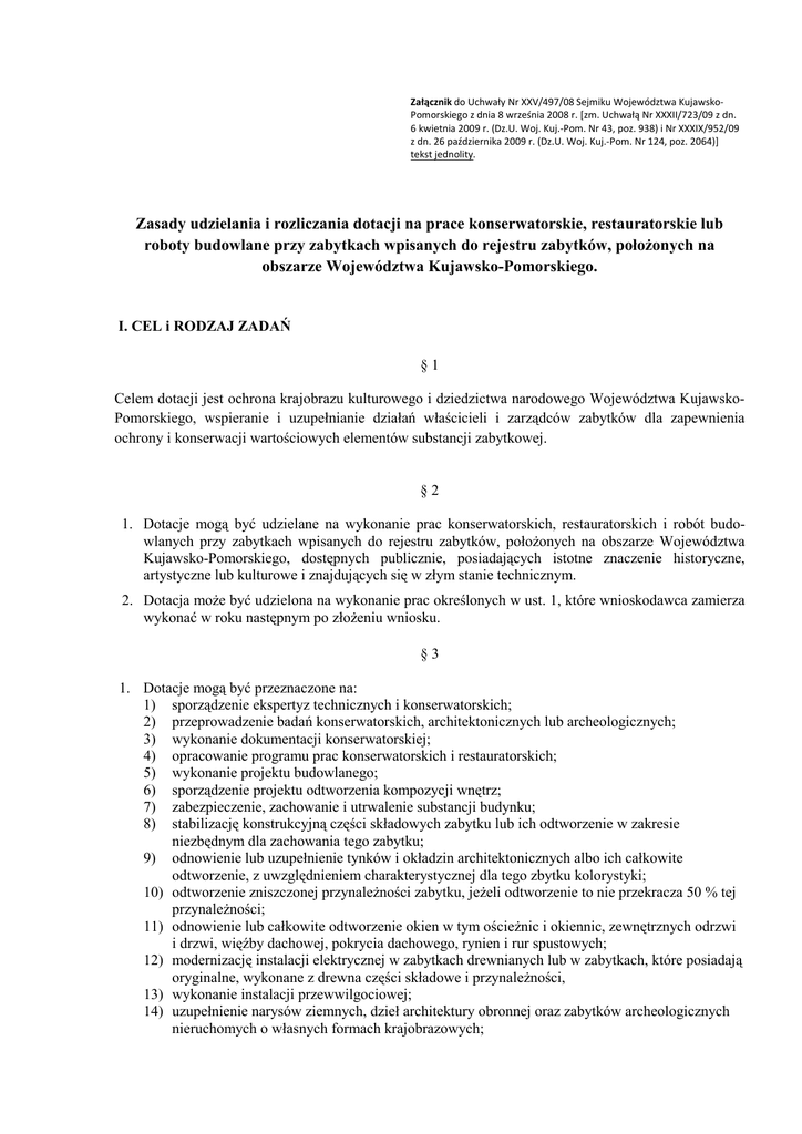 Załącznik do Uchwały Nr XXV/497/08 Sejmiku Województwa KujawskoPomorskiego z dnia 8 września 2008 r. [zm. Uchwałą Nr XXXII/723/09 z dn. 6 kwietnia 2009 r. (Dz.U. Woj. Kuj.-Pom. Nr 43, poz. 938) i Nr XXXIX/952/09 z dn. 26 października 2009 r. (Dz.U. Woj. Kuj.-Pom. Nr 124, poz. 2064)] tekst jednolity. Zasady udzielania i rozliczania dotacji na prace konserwatorskie, restauratorskie lub roboty budowlane przy zabytkach wpisanych do rejestru zabytków, połoŜonych na obszarze Województwa Kujawsko-Pomorskiego. I. CEL i RODZAJ ZADAŃ §1 Celem dotacji jest ochrona krajobrazu kulturowego i dziedzictwa narodowego Województwa KujawskoPomorskiego, wspieranie i uzupełnianie działań właścicieli i zarządców zabytków dla zapewnienia ochrony i konserwacji wartościowych elementów substancji zabytkowej. §2 1. Dotacje mogą być udzielane na wykonanie prac konserwatorskich, restauratorskich i robót budowlanych przy zabytkach wpisanych do rejestru zabytków, połoŜonych na obszarze Województwa Kujawsko-Pomorskiego, dostępnych publicznie, posiadających istotne znaczenie historyczne, artystyczne lub kulturowe i znajdujących się w złym stanie technicznym. 2. Dotacja moŜe być udzielona na wykonanie prac określonych w ust. 1, które wnioskodawca zamierza wykonać w roku następnym po złoŜeniu wniosku. §3 1. Dotacje mogą być przeznaczone na: 1) sporządzenie ekspertyz technicznych i konserwatorskich; 2) przeprowadzenie badań konserwatorskich, architektonicznych lub archeologicznych; 3) wykonanie dokumentacji konserwatorskiej; 4) opracowanie programu prac konserwatorskich i restauratorskich; 5) wykonanie projektu budowlanego; 6) sporządzenie projektu odtworzenia kompozycji wnętrz; 7) zabezpieczenie, zachowanie i utrwalenie substancji budynku; 8) stabilizację konstrukcyjną części składowych zabytku lub ich odtworzenie w zakresie niezbędnym dla zachowania tego zabytku; 9) odnowienie lub uzupełnienie tynków i okładzin architektonicznych albo ich całkowite odtworzenie, z uwzględnieniem charakterystycznej dla tego zbytku kolorystyki; 10) odtworzenie zniszczonej przynaleŜności zabytku, jeŜeli odtworzenie to nie przekracza 50 % tej przynaleŜności; 11) odnowienie lub całkowite odtworzenie okien w tym ościeŜnic i okiennic, zewnętrznych odrzwi i drzwi, więźby dachowej, pokrycia dachowego, rynien i rur spustowych; 12) modernizację instalacji elektrycznej w zabytkach drewnianych lub w zabytkach, które posiadają oryginalne, wykonane z drewna części składowe i przynaleŜności, 13) wykonanie instalacji przewwilgociowej; 14) uzupełnienie narysów ziemnych, dzieł architektury obronnej oraz zabytków archeologicznych nieruchomych o własnych formach krajobrazowych; 15) działania zmierzające do wyeksponowania istniejących oryginalnych elementów zabytkowego parku lub ogrodu; 16) zakup materiałów konserwatorskich i budowlanych niezbędnych do wykonania prac i robót przy zabytku wpisanym do rejestru o których mowa pkt 7-15; 17) zakup i montaŜ instalacji przeciwwłamaniowej i przeciwpoŜarowej odgromowej. 2. Dotacja moŜe być przeznaczona wyłącznie na finansowanie prac konserwatorskich, restauratorskich i robót budowlanych wskazanych we wniosku i określonych umowie o udzielenie dotacji . II. WNIOSKODAWCY §4 O dotację ubiegać się moŜe osoba fizyczna lub jednostka organizacyjna posiadająca tytuł prawny do zabytku wynikający z prawa własności, uŜytkowania wieczystego, trwałego zarządu, ograniczonego prawa rzeczowego albo stosunku zobowiązaniowego. III. WYSOKOŚĆ DOTACJI §5 Wysokość środków przeznaczonych na dotację ustalana jest corocznie w budŜecie województwa. §6 1. Dotacja moŜe być udzielona w wysokości do 50 % nakładów koniecznych na wykonanie prac konserwatorskich, restauratorskich lub robót budowlanych przy zabytku wpisanym do rejestru. 2. JeŜeli zabytek posiada wyjątkową wartość historyczną, artystyczną lub naukową albo wymaga przeprowadzenia złoŜonych pod względem technologicznym prac konserwatorskich, restauratorskich lub robót budowlanych dotacja moŜe być udzielona w wysokości do 100% nakładów koniecznych na wykonanie tych prac lub robót. 3. W przypadku jeśli stan zachowania zabytku wymaga niezwłocznego podjęcia prac konserwatorskich, restauratorskich, lub robót budowlanych przy zabytku dotacja moŜe być równieŜ udzielona do wysokości 100% nakładów na wykonanie tych prac lub robót. 4. Łączna wysokość dotacji na prace konserwatorskie, restauratorskie lub roboty budowlane przy zabytku udzielonych przez samorząd województwa, inne jednostki samorządu terytorialnego, ministra właściwego ds. kultury i ochrony dziedzictwa narodowego, wojewódzkiego konserwatora zabytków bądź środków uzyskiwanych z innych źródeł nie moŜe przekroczyć 100% wysokości nakładów koniecznych na wykonanie tych prac lub robót. IV. TERMIN i TRYB PRZYZNAWANIA DOTACJI §7 1. Udzielenie dotacji moŜe nastąpić po złoŜeniu przez właściciela lub posiadacza zabytku wniosku do departamentu właściwego ds. kultury i dziedzictwa narodowego Urzędu Marszałkowskiego Województwa Kujawsko-Pomorskiego. 2. Wnioski o udzielenie dotacji składa się do dnia 15 grudnia roku poprzedzającego rok w którym planowane jest wykorzystanie dotacji. W przypadku niewykorzystania całości środków przeznaczonych w budŜecie województwa na prace konserwatorskie, restauratorskie lub roboty budowlane przy zabytkach lub ich zwiększenia, mogą być składane wnioski w drugim terminie, tj. do dnia 15 kwietnia roku, w którym dotacja ma być wykorzystana. Informacja o drugim terminie składania wniosków zostanie podana do publicznej wiadomości na stronie internetowej Urzędu Marszałkowskiego oraz w dzienniku o zasięgu regionalnym. 3. Terminy, o których mowa w ust. 2 nie mają zastosowania w przypadku ubiegania się o dotację na prace interwencyjne wynikające z zagroŜenia zabytku. 4. O dacie złoŜenia wniosku decy