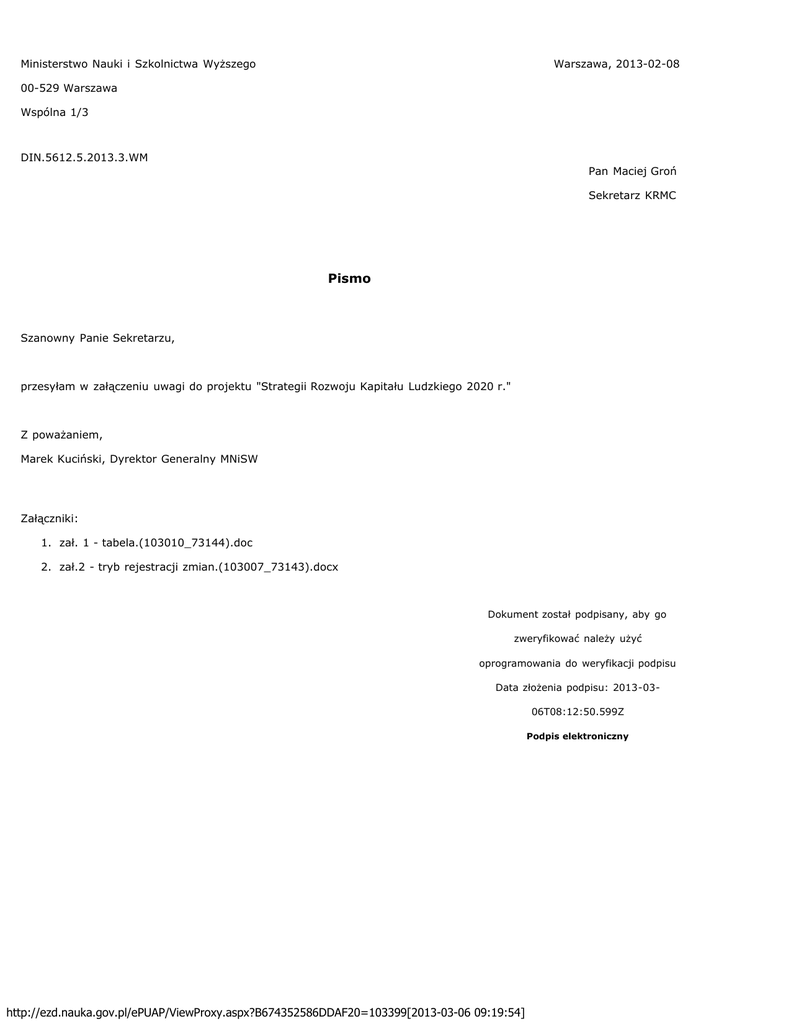 Ministerstwo Nauki i Szkolnictwa Wyższego Warszawa, 2013-02-08 00-529 Warszawa Wspólna 1/3 DIN.5612.5.2013.3.WM Pan Maciej Groń Sekretarz KRMC Pismo Szanowny Panie Sekretarzu, przesyłam w załączeniu uwagi do projektu "Strategii Rozwoju Kapitału Ludzkiego 2020 r." Z poważaniem, Marek Kuciński, Dyrektor Generalny MNiSW Załączniki: 1. zał. 1 - tabela.(103010_73144).doc 2. zał.2 - tryb rejestracji zmian.(103007_73143).docx Dokument został podpisany, aby go zweryfikować należy użyć oprogramowania do weryfikacji podpisu Data złożenia podpisu: 2013-0306T08:12:50.599Z Podpis elektroniczny http://ezd.nauka.gov.pl/ePUAP/ViewProxy.aspx?B674352586DDAF20=103399[2013-03-06 09:19:54]