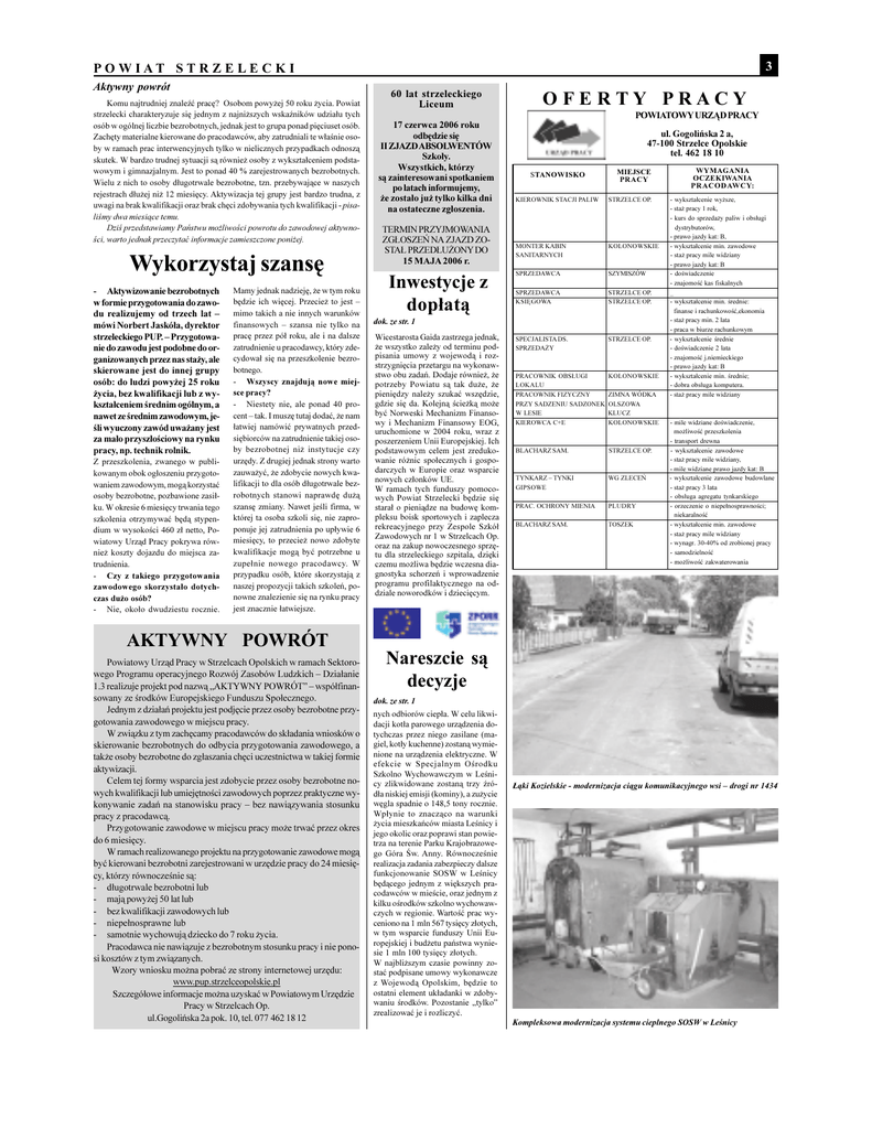 P O W I A T 3 S T R Z E L E C K I Aktywny powrót Komu najtrudniej znaleæ pracê? Osobom powy¿ej 50 roku ¿ycia. Powiat osób w ogólnej liczbie bezrobotnych, jednak jest to grupa ponad piêciuset osób. Zachêty materialne kierowane do pracodawców, aby zatrudniali te w³anie osoby w ramach prac interwencyjnych tylko w nielicznych przypadkach odnosz¹ skutek. W bardzo trudnej sytuacji s¹ równie¿ osoby z wykszta³ceniem podstawowym i gimnazjalnym. Jest to ponad 40 % zarejestrowanych bezrobotnych. Wielu z nich to osoby d³ugotrwale bezrobotne, tzn. przebywaj¹ce w naszych rejestrach d³u¿ej ni¿ 12 miesiêcy. Aktywizacja tej grupy jest bardzo trudna, z uwagi na brak kwalifikacji oraz brak chêci zdobywania tych kwalifikacji - pisalimy dwa miesi¹ce temu. Liceum P R A C Y POWIATOWY URZ¥D PRACY 17 czerwca 2006 roku ul. Gogoliñska 2 a, odbêdzie siê 47-100 Strzelce Opolskie II ZJAZD ABSOLWENTÓW tel. 462 18 10 Szko³y. Wszystkich, którzy s¹ zainteresowani spotkaniem STANOWISKO WYMAGANIA MIEJSCE OCZEKIWANIA PRACY po latach informujemy, ¿e zosta³o ju¿ tylko kilka dni P R A C O D AW C Y: KIEROWNIK STACJI PALIW STRZELCE OP. na ostateczne zg³oszenia. - wykszta³cenie wy¿sze, - sta¿ pracy 1 rok, - kurs do sprzeda¿y paliw i obs³ugi Dzi przedstawiamy Pañstwu mo¿liwoci powrotu do zawodowej aktywnoci, warto jednak przeczytaæ informacje zamieszczone poni¿ej. Wykorzystaj szansê Aktywizowanie bezrobotnych Mamy jednak nadziejê, ¿e w tym roku w formie przygotowania do zawo- bêdzie ich wiêcej. Przecie¿ to jest - O F E R T Y 60 lat strzeleckiego strzelecki charakteryzuje siê jednym z najni¿szych wskaników udzia³u tych du realizujemy od trzech lat mimo takich a nie innych warunków mówi Norbert Jaskó³a, dyrektor finansowych szansa nie tylko na strzeleckiego PUP. Przygotowa- pracê przez pó³ roku, ale i na dalsze nie do zawodu jest podobne do or- zatrudnienie u pracodawcy, który zde- ganizowanych przez nas sta¿y, ale cydowa³ siê na przeszkolenie bezro- skierowane jest do innej grupy botnego. osób: do ludzi powy¿ej 25 roku - ¿ycia, bez kwalifikacji lub z wy- sce pracy? Wszyscy znajduj¹ nowe miej- kszta³ceniem rednim ogólnym, a - nawet ze rednim zawodowym, je- cent tak. I muszê tutaj dodaæ, ¿e nam Niestety nie, ale ponad 40 pro- li wyuczony zawód uwa¿any jest ³atwiej namówiæ prywatnych przed- za ma³o przysz³ociowy na rynku siêbiorców na zatrudnienie takiej oso- pracy, np. technik rolnik. by bezrobotnej ni¿ instytucje czy Z przeszkolenia, zwanego w publi- urzêdy. Z drugiej jednak strony warto kowanym obok og³oszeniu przygoto- zauwa¿yæ, ¿e zdobycie nowych kwa- waniem zawodowym, mog¹ korzystaæ lifikacji to dla osób d³ugotrwale bez- osoby bezrobotne, pozbawione zasi³- robotnych stanowi naprawdê du¿¹ ku. W okresie 6 miesiêcy trwania tego szansê zmiany. Nawet jeli firma, w szkolenia otrzymywaæ bêd¹ stypen- której ta osoba szkoli siê, nie zapro- dium w wysokoci 460 z³ netto, Po- ponuje jej zatrudnienia po up³ywie 6 wiatowy Urz¹d Pracy pokrywa rów- miesiêcy, to przecie¿ nowo zdobyte nie¿ koszty dojazdu do miejsca za- kwalifikacje mog¹ byæ potrzebne u trudnienia. zupe³nie nowego pracodawcy. W - Czy z takiego przygotowania przypadku osób, które skorzystaj¹ z zawodowego skorzysta³o dotych- naszej propozycji takich szkoleñ, po- czas du¿o osób? nowne znalezienie siê na rynku pracy - jest znacznie ³atwiejsze. Nie, oko³o dwudziestu rocznie. AKTYWNY POWRÓT Powiatowy Urz¹d Pracy w Strzelcach Opolskich w ramach Sektoro- ZG£OSZEÑ NA ZJAZD ZOSTA£ PRZED£U¯ONY DO 15 MAJA 2006 r. Inwestycje z dop³at¹ Jednym z dzia³añ projektu jest podjêcie przez osoby bezrobotne przy- W zwi¹zku z tym zachêcamy pracodawców do sk³adania wniosków o skierowanie bezrobotnych do odbycia przygotowania zawodowego, a tak¿e osoby bezrobotne do zg³aszania chêci uczestnictwa w takiej formie aktywizacji. Celem tej formy wsparcia jest zdobycie przez osoby bezrobotne no- ¿e wszystko zale¿y od terminu podpisania umowy z wojewod¹ i roz- byæ kierowani bezrobotni zarejestrowani w urzêdzie pracy do 24 miesiêcy, którzy równoczenie s¹: - d³ugotrwale bezrobotni lub - maj¹ powy¿ej 50 lat lub - bez kwalifikacji zawodowych lub - niepe³nosprawne lub - samotnie wychowuj¹ dziecko do 7 roku ¿ycia. Pracodawca nie nawi¹zuje z bezrobotnym stosunku pracy i nie pono- si kosztów z tym zwi¹zanych. Wzory wniosku mo¿na pobraæ ze strony internetowej urzêdu: www.pup.strzelceopolskie.pl Szczegó³owe informacje mo¿na uzyskaæ w Powiatowym Urzêdzie Pracy w Strzelcach Op. ul.Gogoliñska 2a pok. 10, tel. 077 462 18 12 STRZELCE OP. _ STRZELCE OP. - wykszta³cenie min. rednie: - dowiadczenie - znajomoæ kas fiskalnych finanse i rachunkowoæ,ekonomia - praca w biurze rachunkowym SPECJALISTA DS. STRZELCE OP. SPRZEDA¯Y - dowiadczenie 2 lata - znajomoæ j.niemieckiego potrzeby Powiatu s¹ tak du¿e, ¿e LOKALU PRACOWNIK FIZYCZNY gdzie siê da. Kolejn¹ cie¿k¹ mo¿e KOLONOWSKIE - wykszta³cenie min. rednie; ZIMNA WÓDKA - sta¿ pracy mile widziany - dobra obs³uga komputera. PRZY SADZENIU SADZONEK OLSZOWA byæ Norweski Mechanizm Finanso- W LESIE KLUCZ wy i Mechanizm Finansowy EOG, KIEROWCA C+E KOLONOWSKIE uruchomione w 2004 roku, wraz z - transport drewna BLACHARZ SAM. STRZELCE OP. - wykszta³cenie zawodowe TYNKARZ TYNKI WG ZLECEÑ - wykszta³cenie zawodowe budowlane wanie ró¿nic spo³ecznych i gospo- - sta¿ pracy mile widziany, darczych w Europie oraz wsparcie nowych cz³onków UE. - mile widziane dowiadczenie, mo¿liwoæ przeszkolenia poszerzeniem Unii Europejskiej. Ich podstawowym celem jest zreduko- - wykszta³cenie rednie - prawo jazdy kat: B pieniêdzy nale¿y szukaæ wszêdzie, - mile widziane prawo jazdy kat: B W ramach tych funduszy pomoco- GIPSOWE stara³ o pieni¹dze na budowê kom- PRAC. OCHRONY MIENIA PLUDRY - orzeczenie o niepe³nosprawnoci; rekreacyjnego przy Zespole Szkó³ BLACHARZ SAM. TOSZEK - wykszta³cenie min. zawodowe wych Powiat St