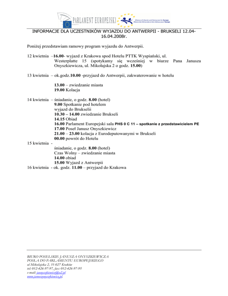 INFORMACJE DLA UCZESTNIKÓW WYJAZDU DO ANTWERPII - BRUKSELI 12.0416.04.2008r. PoniŜej przedstawiam ramowy program wyjazdu do Antwerpii. 12 kwietnia –16.00- wyjazd z Krakowa spod Hotelu PTTK Wyspiański, ul. Westerplatte 15 (spotykamy się wcześniej w biurze Pana Janusza Onyszkiewicza, ul. Mikołajska 2 o godz. 15.00) 13 kwietnia – ok.godz.10.00 -przyjazd do Antwerpii, zakwaterowanie w hotelu 13.00 – zwiedzanie miasta 19.00 Kolacja 14 kwietnia – śniadanie, o godz. 8.00 (hotel) 9.00 Spotkanie pod hotelem wyjazd do Brukselii 10.30 – 14.00 zwiedzanie Brukseli 14.15 Obiad 16.00 Parlament Europejski sala PHS 0 C 11 – spotkanie z przedstawicielem PE 17.00 Poseł Janusz Onyszkiewicz 21.00 – 23.00 kolacja z Eurodeputowanymi w Brukseli 00.00 powrót do Hotelu 15 kwietnia śniadanie, o godz. 8.00 (hotel) Czas Wolny – zwiedzanie miasta 14.00 obiad 15.00 Wyjazd z Antwerpii 16 kwietnia - ok. godz. 11.00 – przyjazd do Krakowa BIURO POSELSKIE JANUSZA ONYSZKIEWICZA POSŁA DO PARLAMENTU EUROPEJSKIEGO ul Mikołajska 2, 31-027 Kraków tel: 012-426-97-97, fax: 012-426-97-95 e-mail: [email protected] www.januszonyszkiewicz.pl.