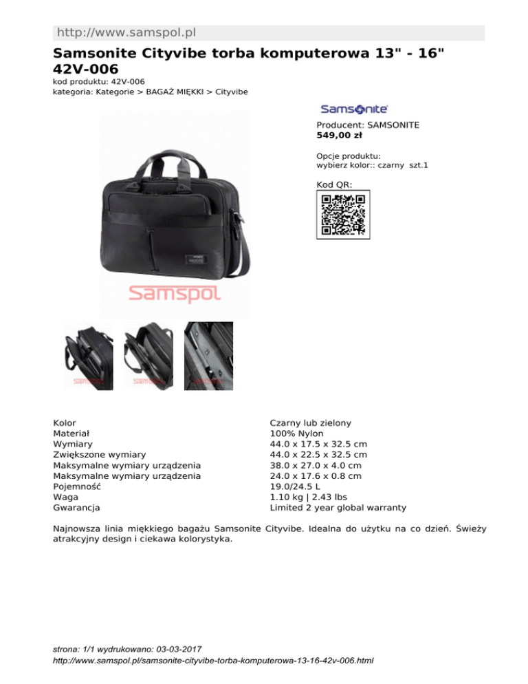 http://www.samspol.pl Samsonite Cityvibe torba komputerowa 13" - 16" 42V-006 kod produktu: 42V-006 kategoria: Kategorie > BAGAŻ MIĘKKI > Cityvibe Producent: SAMSONITE 549,00 zł Opcje produktu: wybierz kolor:: czarny szt.1 Kod QR: Kolor Materiał Wymiary Zwiększone wymiary Maksymalne wymiary urządzenia Maksymalne wymiary urządzenia Pojemność Waga Gwarancja Czarny lub zielony 100% Nylon 44.0 x 17.5 x 32.5 cm 44.0 x 22.5 x 32.5 cm 38.0 x 27.0 x 4.0 cm 24.0 x 17.6 x 0.8 cm 19.0/24.5 L 1.10 kg | 2.43 lbs Limited 2 year global warranty Najnowsza linia miękkiego bagażu Samsonite Cityvibe. Idealna do użytku na co dzień. Świeży atrakcyjny design i ciekawa kolorystyka. strona: 1/1 wydrukowano: 03-03-2017 http://www.samspol.pl/samsonite-cityvibe-torba-komputerowa-13-16-42v-006.html