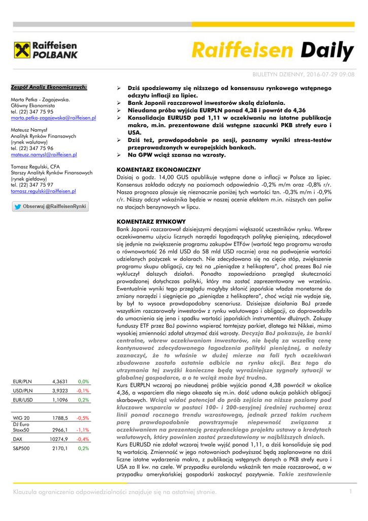 BIULETYN DZIENNY, 2016-07-29 09:08 Zespół Analiz Ekonomicznych: Marta Petka - Zagajewska. Główny Ekonomista tel. (22) 347 75 95 [email protected] Mateusz Namysł Analityk Rynków Finansowych (rynek walutowy) tel. (22) 347 75 96 [email protected] Tomasz Regulski, CFA Starszy Analityk Rynków Finansowych (rynek giełdowy) tel. (22) 347 75 97 [email protected] EUR/PLN 4,3631 0,0% USD/PLN 3,9323 -0,1% EUR/USD 1,1096 0,2% WIG 20 DJ Euro Stoxx50 1788,5 -0,5% 2966,1 -1,1% 10274,9 -0,4% 2170,1 0,2% DAX S&P500 Dziś spodziewamy się niższego od konsensusu rynkowego wstępnego odczytu inflacji za lipiec. Bank Japonii rozczarował inwestorów skalą działania. Nieudana próba wyjścia EURPLN ponad 4,38 i powrót do 4,36 Konsolidacja EURUSD pod 1,11 w oczekiwaniu na istotne publikacje makro, m.in. prezentowane dziś wstępne szacunki PKB strefy euro i USA. Dziś też, prawdopodobnie po sesji, poznamy wyniki stress-testów przeprowadzonych w europejskich bankach. Na GPW wciąż szansa na wzrosty. KOMENTARZ EKONOMICZNY Dzisiaj o godz. 14,00 GUS opublikuje wstępne dane o inflacji w Polsce za lipiec. Konsensus zakłada odczyty na poziomach odpowiednio -0,2% m/m oraz -0,8% r/r. Nasza prognoza plasuje się nieznacznie poniżej tych wartości tzn. -0,3% m/m i -0,9% r/r. Niższy odczyt wskaźnika będzie w naszej ocenie efektem m.in. niższych cen paliw na stacjach benzynowych w lipcu. KOMENTARZ RYNKOWY Bank Japonii rozczarował dzisiejszymi decyzjami większość uczestników rynku. Wbrew oczekiwanemu użyciu licznych narzędzi łagodzących politykę pieniężną, zdecydował się jedynie na zwiększenie programu zakupów ETFów (wartość tego programu wzrosła o równowartość 26 mld USD do 58 mld USD rocznie) oraz na podwojenie wartości udzielanych pożyczek w dolarach. Nie zdecydowano się na cięcie stóp, zwiększenie programu skupu obligacji, czy też na „pieniądze z helikoptera”, choć prezes BoJ nie wykluczył dalszych działań. Ponadto zapowiedziano przegląd skuteczności prowadzonej dotychczas polityki, który ma zostać zaprezentowany we wrześniu. Ewentualnie wyniki tego przeglądu mogłyby skłonić japońskie władze monetarne do zmiany narzędzi i sięgnięcie po „pieniądze z helikoptera”, choć wciąż nie wydaje się, by był to wysoce prawdopodobny scenariusz. Dzisiejsze działania BoJ przede wszystkim rozczarowały inwestorów z rynku walutowego i obligacji, co doprowadziło do umocnienia się jena i spadku wartości japońskich instrumentów dłużnych. Zakupy funduszy ETF przez BoJ powinno wspierać tamtejszy parkiet, dlatego też Nikkei, mimo wysokiej zmienności zdołał utrzymać dziś wzrosty. Decyzja BoJ pokazuje, że banki centralne, wbrew oczekiwaniom inwestorów, nie będą za wszelką cenę kontynuować zdecydowanego łagodzenia polityki pieniężnej, a należy zaznaczyć, że to właśnie w dużej mierze na fali tych oczekiwań zbudowane zostało ostatnie odbicie na rynku akcji. Bez tego do utrzymania tej zwyżki konieczne będą wyraźniejsze sygnały sytuacji w globalnej gospodarce, a o te wciąż może być trudno. Kurs EURPLN wczoraj po nieudanej próbie wyjścia ponad 4,38 powrócił w okolice 4,36, a wsparciem dla niego okazała się m.in. dość udana aukcja polskich obligacji skarbowych. Wciąż widać potencjał do prób zejścia na niższe poziomy pod kluczowe wsparcia w postaci 100- i 200-sesyjnej średniej ruchomej oraz linii ponad rocznego trendu wzrostowego, jednak przed takim ruchem parę prawdopodobnie powstrzymuje niepewność związana z oczekiwaniem na prezentację prezydenckiego projektu ustawy o kredytach walutowych, który powinien zostać przedstawiony w najbliższych dniach. Kurs EURUSD nie zdołał wczoraj trwale wyjść ponad 1,11, a dziś konsoliduje się pod tą wartością. Zmienność w jego notowaniach podwyższać będą zaplanowane na dziś liczne istotne wydarzenia makro, z publikacją wstępnych danych o PKB strefy euro i USA za II kw. na czele. W przypadku eurolandu wskaźnik ten może rozczarować, a w przypadku amerykańskiej gospodarki zaskoczyć pozytywnie. Takie zestawienie Klauzula ograniczenia odpowiedzialności znajduje się na ostatniej stronie. 1 BIULETYN DZIENNY, 29 lipca 2016, GODZ 9.10 przemawia za zejściem kursu EURUSD na niższe poziomy, w pobliże 1,10. Dziś też, choć prawdopodobnie już po sesji zostaną zaprezentowane wyniki stress-testów przeprowadzonych w europejskich banków. Jeśli wskażą one na konieczność istotnego zwiększenia kapitałów przez te podmioty to prawdopodobnie wywołają korekcyjne spadki na zachodnioeuropejskich parkietach. Na GPW w czwartek WIG20 odnotował spadek o 0,5%, natomiast mWIG40 oraz sWIG80 wzrosły o odpowiednio 0,4% i 0,7%. W przypadku indeksów małych i średnich spółek można już dostrzec lekkie krótkoterminowe wykupienie, jednak zachowują one potencjał do dalszej zwyżki. Szansy na krótkoterminowe odbicie nie zanegował również WIG20. 2 Klauzula ograniczenia odpowiedzialności znajduje się na ostatniej stronie. BIULETYN DZIENNY, 29 lipca 2016, GODZ 9.10 Stan na początek dnia Waluty Zmiana (dziś) % Zamkn. Zmiana % 5 sesji Wyniki sesji: Polska Zamkn. Zmiana % Zmiana % 5 sesji obroty (w tys PLN) EUR/PLN 4,3631 4,3625 0,04% -0,02% WIG 46719,0 -0,18% 0,17% 718 486,19 USD/PLN 3,9323 3,9385 -0,14% -1,10% WIG 20 1788,5 -0,51% -0,84% 599 048,94 -0,04% WIG 30 2029,8 -0,28% -0,35% 645 826,11 mWIG40 3618,9 0,44% 2,15% 66 573,76 sWIG80 13684,2 0,71% 2,16% 25 344,15 WIG Banki 5730,2 0,64% -0,65% 201 873,83 8 568,06 CHF/PLN 4,0205 4,0150 0,17% EUR/USD 1,1096 1,1077 0,18% 1,09% GBP/PLN 5,1876 5,1838 -0,80% -0,97% *Zamkniecie z poprzedniego dnia z godziny 22:00 FIXINGI Data 3M Euribor Wartość 2016-07-28 3M Libor CHF 2016-07-27 FIXINGI Zmiana (pb) WIG Telkom 737,0 -0,58% 5,05% -0,296% 0,0020 WIG Budow 2730,2 0,23% 1,23% 5 831,69 -0,748% 0,0044 WIG Paliwa 4532,0 -2,41% -2,63% 114 028,23 Zmiana (pb) Wyniki sesji: Świat Indeks Wartość 1,65% - 3M Wibor fixin