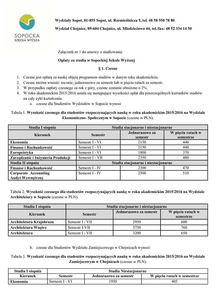 Wydziały Sopot, 81-855 Sopot, ul. Rzemieślnicza 5, tel. 48 58 550 78 80 Wydział Chojnice, 89-604 Chojnice, ul. Młodzieżowa 44, tel./fax: 48 52 334 14 50 Załącznik nr 1 do umowy o studiowanie Opłaty za studia w Sopockiej Szkole Wyższej § 1. Czesne 1. 2. 3. 4. Czesne jest opłatą za naukę objętą programem studiów w danym roku akademickim. Czesne można wnosić: rocznie, jednorazowo za semestr lub w pięciu ratach za semestr. W przypadku zapłaty czesnego za rok z góry, czesne zostanie obniżone o 2%. W roku akademickim 2015/2016 ustala się następujące wysokości opłat dla poszczególnych kierunków studiów na cały cykl kształcenia: a. czesne dla Studentów Wydziałów w Sopocie wynosi: Tabela 1. Wysokość czesnego dla studentów rozpoczynających naukę w roku akademickim 2015/2016 na Wydziale Ekonomiczno- Społecznym w Sopocie (czesne w PLN). Studia I stopnia Kierunek Semestr Ekonomia Finanse i Rachunkowość Europeistyka Zarządzanie i Inżynieria Produkcji Studia II stopnia Finanse i Rachunkowość Corporate Accounting Audyt Wewnętrzny Semestr I - VI Semestr I - VI Semestr I - VI Semestr I - VII Semestr I - IV Semestr I - IV Studia stacjonarne i niestacjonarne Jednorazowo za W pięciu ratach w semestr semestrze 2150 440 2150 440 1800 370 2350 480 Studia stacjonarne i niestacjonarne 2300 470 2500 510 Tabela 2. Wysokość czesnego dla studentów rozpoczynających naukę w roku akademickim 2015/2016 na Wydziale Architektury w Sopocie (czesne w PLN). Studia I stopnia Kierunek Semestr Architektura Krajobrazu Architektura Wnętrz Architektura Semestr I - VII Semestr I-VII Semestr I - VII Studia stacjonarne i niestacjonarne Jednorazowo za semestr W pięciu ratach w semestrze 2950 600 3750 760 3200 650 b. czesne dla Studentów Wydziału Zamiejscowego w Chojnicach wynosi: Tabela 3. Wysokość czesnego dla studentów rozpoczynających naukę w roku akademickim 2015/2016 na Wydziale Zamiejscowym w Chojnicach (czesne w PLN). Studia I stopnia Kierunek Ekonomia Semestr Semestr I - VI Studia Niestacjonarne Jednorazowo za semestr W pięciu ratach w semestrze 1950 405 5. Ustala się następujące terminy wnoszenia czesnego: Tabela nr 4. Terminy wnoszenia opłat. semestr zimowy semestr letni Czesne roczne do 10 września do 10 lutego Jednorazowo za semestr do 10 września do 10 lutego do 10 września, 10 października, 10 listopada, 10 grudnia, 10 stycznia do 10 lutego, 10 marca, 10 kwietnia, 10 maja, 10 czerwca Pięć rat w semestrze 6. Studenci pierwszego semestru studiów wnoszą pierwsze czesne po immatrykulacji, najpóźniej do 1 października. W przypadku rozpoczęcia roku akademickiego od semestru letniego, po immatrykulacji. 7. Studenci podejmujący studia po 1 października, zobowiązani są do uiszczenia czesnego w ciągu 7 dni od dnia podpisania umowy. 8. Wybór sposobu wnoszenia czesnego przez studenta następuje poprzez wybór opcji płatności w dokumentach rekrutacyjnych. 9. Deklarację płatności można zmienić w formie pisemnej. Zmianę deklaracji należy złożyć w dziekanacie przed rozpoczęciem kolejnego semestru. § 2. Czesne za studiowanie na drugiej specjalności 1. Czesne za studiowanie na drugiej specjalności wynosi 30 % czesnego obowiązującego w danym semestrze na tej specjalności w wybranym trybie. 2. Czesne za każdy semestr powinno być wnoszone z góry do 10 września lub do 10 lutego z zastrzeżeniem §1.p.6. § 3. Czesne za studiowanie na drugim kierunku 1. Czesne za studiowanie na drugim kierunku (pierwszym i drugim realizowanym w SSW) ustala się na poziomie 50% obowiązującego czesnego na wybranym kierunku studiów. § 4. Opłata z tytułu uzupełnienia różnic programowych dla studentów przyjętych z innej Uczelni 1. Opłata z tytułu różnic programowych uzależniona jest od liczby ECTS, gdzie 1 punkt ECTS wycenia się na100zł. 2. Opłata powinna być wniesiona w terminie 7 dni od dnia wydania decyzji przez Dziekana. § 5. Opłata za przedmiot poza programem studiów 1. Semestralna opłata za przedmiot nieobjęty planem studiów wynosi 500 zł. § 6. Opłata za powtarzanie przedmiotu 1. Opłata za powtarzanie przedmiotu dla studentów, którzy rozpoczęli naukę od semestru pierwszego w roku akademickim 2015/2016 uzależniona jest od liczby punktów ECTS dotyczących tego przedmiotu, gdzie 1 pkt ECTS wycenia się na 100 złotych. 2. Opłata powinna być wniesiona w terminie 7 dni od dnia wydania decyzji przez Dziekana. § 7. Opłata za przedłużenie sesji egzaminacyjnej 1. Opłata za przedłużenie sesji egzaminacyjnej powyżej jednego miesiąca, od zakończenia sesji poprawkowej wynosi 300 zł. 2. Opłata powinna być wniesiona w terminie 7 dni od dnia złożenia podania o przedłużenie sesji. § 8. Opłata za przedłużenie terminu złożenia pracy dyplomowej 1. Za przedłużenie terminu złożenia pracy dyplomowej powyżej 1 miesiąca, za każdy kolejny miesiąc pobierana jest opłata w wysokości 100 zł. § 9. Opłata za przyjęcie lub wznowienie studiów 1. Opłata rekrutacyjna za przyjęcie na studia wynosi 80 złotych. 2. Opłata za wznowienie studiów przez studenta uprzednio skreślonego z listy studentów wynosi 80 złotych. 3. Opłata powinna być wniesiona w terminie 7 dni od dnia zawarcia nowej umowy o studiowaniu w Sopockiej Szkole Wyższej. § 10. Opłaty za wydanie dokumentów 1. Uczelnia pobiera opłaty za wydanie: 1) legitymacji studenckiej i jej duplikatu, 2) indeksu i jego duplikatu, 3) dyplomu ukończenia studiów, jego duplikatu oraz dodatkowego odpisu dyplomu w tłumaczeniu na język obcy, 4) świadectwa ukończenia studiów podyplomowych i jego duplikatu. 2. Opłaty za wydanie następujących dokumentów wynoszą: 1) 5 zł - za wydanie legitymacji studenckiej * 2) 17 zł – za wydanie elektronicznej legitymacji studenckiej, 3) 4 zł – za wydanie indeksu*, 4) 60 zł – za wydanie dyplomu ukończenia studiów wraz z dwoma odpisami, 5) 30 zł – za wydanie świadectwa ukończenia studiów podyplomowych,