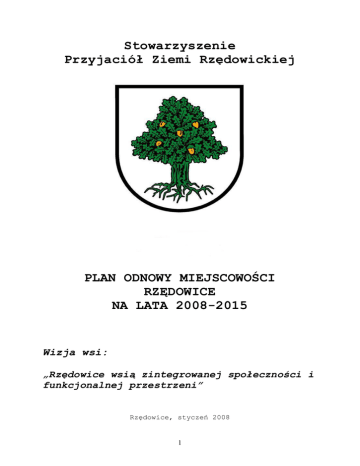Stowarzyszenie Przyjaciół Ziemi Rzędowickiej PLAN ODNOWY MIEJSCOWOŚCI RZĘDOWICE NA LATA 2008-2015 Wizja wsi: „Rzędowice wsią zintegrowanej społeczności i funkcjonalnej przestrzeni” Rzędowice, styczeń 2008 1 Spis treści: 1. Charakterystyka miejscowości …………………………………………. 2 str. 2. Inwentaryzacja zasobów ……………………………………………….. 3 str. 3. Ocena mocnych i słabych stron, szans i zagrożeń ……………………... 5 str. 4. Plan i program długookresowy rozwoju wsi na lata 2008-2015 ………...7 str. 5. Plan i program krótkoterminowy rozwoju wsi na lata 2008-2010 ………8 str. 6. Planowane przedsięwzięcia 6.1. Opis planowanych zadań …………………………………………..9 str. 6.2. Wdrażanie harmonogramu działań oraz koszt realizacji zadań …...12 str 2 1. Charakterystyka miejscowości Rzędowice to wieś położona w północnej części gminy Dobrodzień przy drodze powiatowej Dobrodzień – Olesno. W skład sołectwa obok głównej wsi wchodzą przysiółki Bzionków, Pustkowie, Kwierucie i Papiernia. Sołectwo liczy 490 mieszkańców. Zabudowa głównej części wsi ma charakter zwarty wielodrożnicowy. Centrum wsi u zbiegu głównych ulic obejmuje tereny publiczne dawnej szkoły, kaplicę, dom spotkań Mniejszości Niemieckiej oraz sklep. Udział terenów wolnych od zabudowy jest tu znaczny. Wieś ma typowo rolniczy charakter. Główną działalnością gospodarczą jest produkcja w indywidualnych gospodarstwach o powierzchni od 1 do 40 ha. Znaczna ich część jest coraz bardziej nowoczesna. Gospodarstwa rolne prowadzą produkcję w zakresie mleka, trzody chlewnej i produkcji roślinnej. Ostatnio w jednym gospodarstwie rozwija się produkcja ogrodnicza. Na wsi zlokalizowany jest 1 zakład stolarski, 1 zakład mechaniczny i 1 hydrauliczny. Sołectwo w 2004 r. przystąpiło do programu odnowy wsi. 30.06.2004 r. założono Stowarzyszenie Przyjaciół Ziemi Rzędowickiej, które odpowiada za realizację programu. Na wsi co roku odbywają się imprezy organizowane przez Stowarzyszenie: Święto Matki – w maju, Dzień Dziecka – w czerwcu, Festyn Wiejski Wszystko Swojskie – w sierpniu, Opłatek i jasełka dla seniorów wsi – w grudniu. Wieś ma ogólnodostępną świetlicę dla dzieci i młodzieży wyposażoną w gry planszowe i tenis stołowy. Do ważniejszych obiektów zabytkowych i budujących tożsamość oraz tradycję na wsi należą dwie byłe szkoły, kaplica, dom Mniejszości Niemieckiej, kamień upamiętniający pobyt na polowaniu w rzędowickich lasach króla saksońskiego Fryderyka Augusta III, 300-letni dąb szypułkowy – pomnik przyrody. Dużą atrakcją jest Wąwóz na Kwieruciach, tzw. Szwajcaria Rzędowicka. Oprócz stowarzyszenia na terenie wsi działa koło DFK oraz straż pożarna. 3 2. Inwentaryzacja zasobów Analiza zasobów Rodzaj zasobu Środowisko przyrodnicze, położenie - walory krajobrazu - walory klimatu - walory szaty roślinnej - cenne przyrodniczo obiekty i obszary - świat zwierzęcy - wody powierzchniowe - wody podziemne - podłoże, warunki hydrogeologiczne - gleby - kopaliny - drogi (dostępność komunikacyjna) Środowisko kulturowe - walory architektury wiejskiej Opis zasobu jakim wieś dysponuje Krajobraz kulturowy rolniczy wysoczyzny polodowcowej na wyżynnej krawędzi strukturalnej. Obecność głębokich rozcięć erozyjnych w postaci głębokich dolinek rzecznych Korzystne warunki bioklimatyczne Dosyć liczne stanowiska rzadkich i chronionych gatunków roślin, zróżnicowane siedliskowo lasy Projektowane powiększenie OCHK Lasy Stobrawsko-Turawskie, istniejący pomnik przyrody dąb szypułkowy, projektowany zespól przyrodniczo-krajobrazowy i użytek ekologiczny. Rozległe ostoje zwierzyny leśnej w północnej części wsi, m.in. bocian czarny, żuraw Małe cieki, brak większych zbiorników wodnych Użytkowy poziom wodonośny płytko w czwartorzędzie, wody zanieczyszczone głębiej warstwa izolacyjna iłów i iłowców górnotriasowych Piaski i żwiry wodnolodowcowowe, lokalnie gliny zwałowe z brukiem morenowym, płytko wiśniowe iły górnotrisaowe, wody podziemne mało zasobne w czwartorzędzie i głębiej w górnym triasie Dominują pseudobielicowe, lokalnie brunatne, IV klasa, dobra kultura rolna Brak udokumentowanych złóż, lokalnie niewielkie piaskownie Główna droga powiatowa w dobrym stanie, podobnie jak część dróg gminnych, znaczny udział dróg utwardzonych w bardzo złym stanie Wieś z dominującymi zadbanymi gospodarstwami, znaczny udział domów 4 Znaczenie zasobu M D Wyró a u żł ż niając e e e wieś X X X X X X X X X X X X - walory ukształtowania przestrzeni publicznej - osobliwości kulturowe - miejsca, osoby i przedmioty kultu - święta, odpusty, pielgrzymki - tradycje, obrzędy, gwara - specyficzne potrawy - legendy, podania, fakty historyczne - ważne postacie historyczne - specyficzne nazwy - dawne zawody - zespoły artystyczne Obiekty i tereny - działki pod zabudowę mieszkaniową - działki pod domy letniskowe - działki pod zakłady usługowe i przemysł - pustostany - tradycyjne obiekty gospodarskie - place i miejsca publicznych spotkań - miejsca sportu i rekreacji - szlaki turystyczne Gospodarka, rolnictwo - miejsca pracy (ilość) - zakłady produkcyjne odnowionych w tradycyjnym stylu śląskiej zabudowy wiejskiej Główna przestrzeń publiczna w centrum wsi słabo wykorzystana Wieś nie wyróżnia się kulturowo W centrum wsi kaplica, w której sporadycznie odbywają się msze święte, często modlitwy, kilka przydrożnych kapliczek Coroczny odpust we wrześniu, przez wieś często przechodzą pielgrzymki, dla których sporadycznie wieś w centrum przygotowuje poczęstunek Większość mieszkańców na co dzień porozumiewa się gwarą. Szczególne obrzędy i tradycje nie są kultywowane w sposób wyróżniający Dominuje tradycyjna śląska kuchnia bez lokalnych specyfików Polowanie