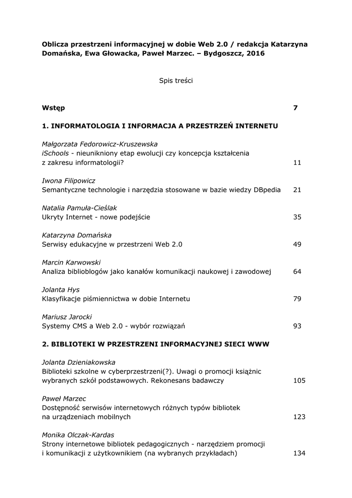Oblicza przestrzeni informacyjnej w dobie Web 2.0 / redakcja Katarzyna Domańska, Ewa Głowacka, Paweł Marzec. – Bydgoszcz, 2016 Spis treści Wstęp 7 1. INFORMATOLOGIA I INFORMACJA A PRZESTRZEŃ INTERNETU Małgorzata Fedorowicz-Kruszewska iSchools - nieunikniony etap ewolucji czy koncepcja kształcenia z zakresu informatologii? 11 Iwona Filipowicz Semantyczne technologie i narzędzia stosowane w bazie wiedzy DBpedia 21 Natalia Pamuła-Cieślak Ukryty Internet - nowe podejście 35 Katarzyna Domańska Serwisy edukacyjne w przestrzeni Web 2.0 49 Marcin Karwowski Analiza biblioblogów jako kanałów komunikacji naukowej i zawodowej 64 Jolanta Hys Klasyfikacje piśmiennictwa w dobie Internetu 79 Mariusz Jarocki Systemy CMS a Web 2.0 - wybór rozwiązań 93 2. BIBLIOTEKI W PRZESTRZENI INFORMACYJNEJ SIECI WWW Jolanta Dzieniakowska Biblioteki szkolne w cyberprzestrzeni(?). Uwagi o promocji książnic wybranych szkół podstawowych. Rekonesans badawczy 105 Paweł Marzec Dostępność serwisów internetowych różnych typów bibliotek na urządzeniach mobilnych 123 Monika Olczak-Kardas Strony internetowe bibliotek pedagogicznych - narzędziem promocji i komunikacji z użytkownikiem (na wybranych przykładach) 134 Kazimierz Adamczyk, Maciej Weryho, Małgorzata Zmitrowicz Przestrzeń informacji cyfrowej w Bibliotece Uniwersytetu Kazimierza Wielkiego w Bydgoszczy 149 3. ZASOBY INFORMACYJNE W PRZESTRZENI INTERNETU Małgorzata Kowalska Crowdfunding - alternatywne źródło finansowania w dobie Web 2.0 163 Bernardeta Iwańska-Cieślik Druki włocławskie z lat 1848-1918 w zasobach polskich bibliotek cyfrowych 188 Elżbieta Pokorzyńska Kolekcje cyfrowe opraw zabytkowych 220 Wanda A. Ciszewska Obecność elementów Web 2.0 w serwisach branży wydawniczoksięgarskiej 232 Dariusz Spychała Antyk w Internecie 244 Zdzisław Kropidłowski „Republika Listów" online 257 Indeks nazwisk 274 Autorzy 280 oprac. BPK