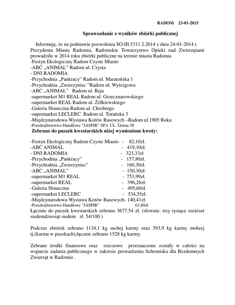 RADOM 23-01-2015 Sprawozdanie z wyników zbiórki publicznej Informuję, że na podstawie pozwolenia SO.III.5311.2.2014 z dnia 24-01-2014 r. Prezydenta Miasta Radomia, Radomskie Towarzystwo Opieki nad Zwierzętami prowadziło w 2014 roku zbiórki publiczne na terenie miasta Radomia -Festyn Ekologiczny Radom Czyste Miasto -ABC „ANIMAL” Radom ul. Czysta - DNI RADOMIA -Przychodnia „Pankracy” Radom ul. Maratońska 1 -Przychodnia „Zwierzyniec ”Radom ul. Wyścigowa -ABC „ANIMAL” Radom ul. Reja -supermarket M1 REAL Radom ul. Grzecznarowskiego -supermarket REAL Radom ul. Żółkiewskiego -Galeria Słoneczna Radom ul. Chrobrego -supermarket LECLERC Radom ul. Toruńska 3 -Międzynarodowa Wystawa Kotów Rasowych –Radom ul.1905 Roku -Przedsiębiorstwo Handlowe ”JASPIR” SP.J. UL. Górna 30 Zebrano do puszek kwestarskich niżej wymienione kwoty: -Festyn Ekologiczny Radom Czyste Miasto - 82,10zł. -ABC ANIMAL - 419,10zł. - DNI RADOMIA - 323,33zł -Przychodnia „Pankracy” - 157,80zł. -Przychodnia „Zwierzyniec” - 160,30zł. -ABC „ANIMAL” - 150,30zł. -supermarket M1 REAL - 753,99zł. -supermarket REAL - 396,26zł. -Galeria Słoneczna - 495,60zł. -supermarket LECLERC - 534,55zł. -Międzynarodowa Wystawa Kotów Rasowych- 140,41zł. -Przedsiębiorstwo Handlowe ”JASPIR” 63,80zł. Łącznie do puszek kwestarskich zebrano 3677,54 zł. (słownie: trzy tysiące sześćset siedemdziesiąt siedem zł. 54/100 ) Podczas zbiórek zebrano 1134,1 kg suchej karmy oraz 393,9 kg karmy mokrej tj.(karma w puszkach),łącznie zebrano 1528 kg karmy. Zebrane środki finansowe oraz rzeczowe przeznaczone zostały w całości na wsparcie zadania publicznego w zakresie prowadzenia Schroniska dla Bezdomnych Zwierząt w Radomiu .