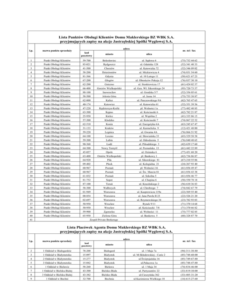 Lista Punktów Obsługi Klientów Domu Maklerskiego BZ WBK S.A. przyjmujących zapisy na akcje Jastrzębskiej Spółki Węglowej S.A. l.p. nazwa punktu sprzedaŜy adres kod pocztowy miasto nr. tel / fax ulica 1 Punkt Obsługi Klientów 59-700 Bolesławiec ul. Sądowa 6 (75) 732 44 62 2 Punkt Obsługi Klientów 85-021 Bydgoszcz ul. Gdańska 128 (52) 341 40 33 3 Punkt Obsługi Klientów 41-500 Chorzów ul. Katowicka 72 (32) 346 09 02 4 Punkt Obsługi Klientów 58-200 DzierŜoniów ul. Mickiewicza 4 (74) 831 54 60 5 Punkt Obsługi Klientów 81-366 Gdynia ul. 10 Lutego 11 (58) 621 67 23 6 Punkt Obsługi Klientów 67-200 Głogów ul. Obrońców Pokoju 12 (76) 837 30 10 7 Punkt Obsługi Klientów 62-200 Gniezno ul. Sienkiewicza 17 (61) 424 02 57 8 Punkt Obsługi Klientów 66-400 Gorzów Wielkopolski ul. Gen. Wł. Sikorskiego 24 (95) 720 73 57 9 Punkt Obsługi Klientów 88-100 Inowrocław ul. Grodzka 5/7 (52) 356 05 61 10 Punkt Obsługi Klientów 58-500 Jelenia Góra ul. Jasna 14 (75) 753 38 87 11 Punkt Obsługi Klientów 62-800 Kalisz ul. Parczewskiego 9A (62) 765 47 65 12 Punkt Obsługi Klientów 40-174 Katowice ul. Katowicka 61 (32) 351 39 56 13 Punkt Obsługi Klientów 47-220 Kędzierzyn-Koźle pl. Wolności 1a (77) 482 40 85 14 Punkt Obsługi Klientów 63-300 Kępno ul. Kościuszki 6 (62) 782 21 87 15 Punkt Obsługi Klientów 25-950 Kielce ul. Wspólna 2 (41) 335 86 15 16 Punkt Obsługi Klientów 57-300 Kłodzko ul. Kościuszki 7 (74) 867 22 52 17 Punkt Obsługi Klientów 62-510 Konin ul. Energetyka 6A (63) 245 67 47 18 Punkt Obsługi Klientów 31-133 Kraków ul. Karmelicka 9 (12) 421 48 00 19 Punkt Obsługi Klientów 59-220 Legnica ul. Gwarna 4A (76) 866 51 92 20 Punkt Obsługi Klientów 64-100 Leszno ul. Słowiańska 33 (65) 529 58 58 21 Punkt Obsługi Klientów 59-300 Lubin ul. Odrodzenia 5 (76) 840 48 65 22 Punkt Obsługi Klientów 90-368 Łodź al. Piłsudskiego 3 (42) 639 17 60 23 Punkt Obsługi Klientów 64-300 Nowy Tomyśl ul. Poznańska 13 (61) 442 22 89 24 Punkt Obsługi Klientów 45-057 Opole ul. Ozimska 6 (77) 451 68 20 25 Punkt Obsługi Klientów 63-400 Ostrów Wielkopolski pl. Bankowy 1 (62) 736 86 87 26 Punkt Obsługi Klientów 64-920 Piła ul. Sikorskiego 81 (67) 210 55 06 27 Punkt Obsługi Klientów 09-402 Płock ul. Kolegialna 21 (24) 267 93 40 28 Punkt Obsługi Klientów 60-967 Poznań pl. Wolności 16 (61) 856 49 47 29 Punkt Obsługi Klientów 60-967 Poznań ul. Św. Marcin 81 (61) 856 43 38 30 Punkt Obsługi Klientów 61-832 Poznań ul. Szkolna 5 (61) 856 46 77 31 Punkt Obsługi Klientów 81-752 Sopot ul. Chopina 6 (58) 550 78 18 32 Punkt Obsługi Klientów 87-100 Toruń ul. Krasińskiego 2 (56) 610 36 83 33 Punkt Obsługi Klientów 58-300 Wałbrzych ul. Chrobrego 7 (74) 842 67 79 34 Punkt Obsługi Klientów 01-949 Warszawa ul. Kasprowicza 119a (22) 569 55 40 35 Punkt Obsługi Klientów 00-854 Warszawa ul. Jana Pawła II 23 (22) 526 21 20 36 Punkt Obsługi Klientów 02-697 Warszawa ul. Rzymowskiego 34 (23) 782 93 03 37 Punkt Obsługi Klientów 50-950 Wrocław Rynek 9/11 (71) 370 14 68 38 Punkt Obsługi Klientów 50-950 Wrocław pl. Kościuszki 7/8 (71) 370 66 82 39 Punkt Obsługi Klientów 59-900 Zgorzelec ul. Wolności 11 (75) 777 02 85 40 Punkt Obsługi Klientów 65-950 Zielona Góra ul. Bankowa 5 (68) 328 87 70 41 Zespół Private Brokerage Lista Placówek Agenta Domu Maklerskiego BZ WBK S.A. przyjmujących zapisy na akcje Jastrzębskiej Spółki Węglowej S.A. l.p. nazwa punktu sprzedaŜy adres kod pocztowy miasto nr. tel / fax ulica 2 1 Oddział w Białogardzie 78-200 Białogard ul. 1 Maja 7a 3 1 Oddział w Białymstoku 15-097 Białystok ul. M.Skłodowskiej - Curie 2 (94) 311-38-80 (85) 748-60-00 4 2 Oddział w Białymstoku 15-277 Białystok ul.Świętojańska 16 (85) 749-67-80 5 3 Oddział w Białymstoku 15-042 Białystok ul.Pałacowa 1a (85) 748-47-80 6 1 Oddział w Bielawie 58-260 Bielawa ul. 1 Maja 34 (74) 834-46-00 7 1 Oddział w Bielsku-Białej 43-300 Bielsko-Biała ul. Partyzantów 22 (33) 819-10-00 8 3 Oddział w Bielsku-Białej 43-382 Bielsko-Biała ul.Cieszyńska 362 (33) 485-31-20 9 1 Oddział w Bochni 32-700 Bochnia ul.Kazimierza Wielkiego 18 (14) 615-27-60 10 1 Oddział w Bogatyni 59-920 Bogatynia ul. Daszyńskiego 4abc 11 1 Oddział w Bolesławcu 59-700 Bolesławiec ul. Bankowa 12 (75) 734-94-00 12 2 Oddział w Bolesławcu 59-700 Bolesławiec ul. Sądowa 6 (75) 738-05-40 13 1 Oddział w Brzegu 49-300 Brzeg ul. Powstańców Śląskich 6 (77) 424-20-00 14 1 Oddział w Brzegu Dolnym 56-120 Brzeg Dolny ul. 1 Maja 10a (71) 380-51-80 15 1 Oddział w Brzesku 32-800 Brzesko ul.Jana Matejki 2 (14) 663-57-10 16 1 Oddział w Bydgoszczy 85-231 Bydgoszcz ul. Królowej Jadwigi 18 (52) 366-79-10 17 2 Oddział w Bydgoszczy 85-090 Bydgoszcz ul. Powstańców Wlkp. 26 (52) 326-25-00 18 3 Oddział w Bydgoszczy 85-312 Bydgoszcz ul. Szubińska 83 (52) 360-58-00 19 5 Oddział w Bydgoszczy 85-006 Bydgoszcz ul. Gdańska 30 (52) 304-57-51 20 1 Oddział w Bystrzycy Kłodzkiej 57-500 Bystrzyca Kłodzka ul. Mickiewicza 8 (74) 811-78-00 21 1 Oddział w Bytomiu 41-902 Bytom ul. Dworcowa 4 (32) 283-40-00 22 1 Oddział w Chełmie 22-100 Chełm ul. Lubelska 73 (82) 564-90-50 23 1 Oddział w ChodzieŜy 64-800 ChodzieŜ ul. Ks.Prymasa St. Wyszyńskiego 4 (67) 281-28-00 24 1 Oddział w Chojnowie 59-225 Chojnów ul. Dąbrowskiego 12 (76) 819-64-00 25 1 Oddział w Ciechanowie 06-400 Ciechanów ul. Pułtuska 4/6 (23) 673-01-50 26 1 Oddział w Cieszynie 43-400 Cieszyn ul. Stary Targ 1 (33) 851-66-40 27 1 Oddział w Częstochowie 42-200 Częstochowa ul. Krótka 46/48 (34) 366-91-30 28 2 Oddział w Częstochowie 42-217 Częstochowa al.Wolności 8 (34) 372-73-43 29 1 Oddział w Dąbrowie Górniczej 41-300 Dąbrowa Górnicza ul.Jana III Sobieskiego 1 (32) 260-85-40 30 1 Oddział w Długołęce 55-095 Długołęka ul. Wrocławska 40 (71) 315-16-17 31 1 Oddział w DzierŜoniowie 58-200 DzierŜoniów ul. Mickiewicza 4 (74) 832-56-00 32 1 Oddział w Elblągu 82-300 Elbląg ul. Pułkownika Dąbka 8-