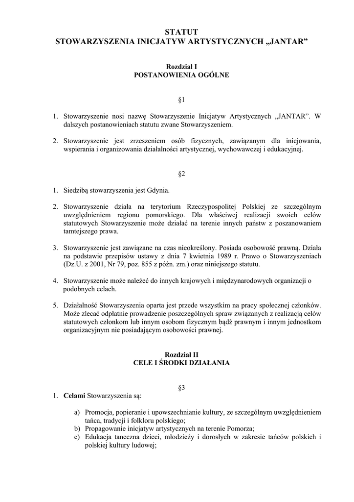 STATUT STOWARZYSZENIA INICJATYW ARTYSTYCZNYCH „JANTAR” Rozdział I POSTANOWIENIA OGÓLNE §1 1. Stowarzyszenie nosi nazwę Stowarzyszenie Inicjatyw Artystycznych „JANTAR”. W dalszych postanowieniach statutu zwane Stowarzyszeniem. 2. Stowarzyszenie jest zrzeszeniem osób fizycznych, zawiązanym dla inicjowania, wspierania i organizowania działalności artystycznej, wychowawczej i edukacyjnej. §2 1. Siedzibą stowarzyszenia jest Gdynia. 2. Stowarzyszenie działa na terytorium Rzeczypospolitej Polskiej ze szczególnym uwzględnieniem regionu pomorskiego. Dla właściwej realizacji swoich celów statutowych Stowarzyszenie może działać na terenie innych państw z poszanowaniem tamtejszego prawa. 3. Stowarzyszenie jest zawiązane na czas nieokreślony. Posiada osobowość prawną. Działa na podstawie przepisów ustawy z dnia 7 kwietnia 1989 r. Prawo o Stowarzyszeniach (Dz.U. z 2001, Nr 79, poz. 855 z późn. zm.) oraz niniejszego statutu. 4. Stowarzyszenie może należeć do innych krajowych i międzynarodowych organizacji o podobnych celach. 5. Działalność Stowarzyszenia oparta jest przede wszystkim na pracy społecznej członków. Może zlecać odpłatnie prowadzenie poszczególnych spraw związanych z realizacją celów statutowych członkom lub innym osobom fizycznym bądź prawnym i innym jednostkom organizacyjnym nie posiadającym osobowości prawnej. Rozdział II CELE I ŚRODKI DZIAŁANIA §3 1. Celami Stowarzyszenia są: a) Promocja, popieranie i upowszechnianie kultury, ze szczególnym uwzględnieniem tańca, tradycji i folkloru polskiego; b) Propagowanie inicjatyw artystycznych na terenie Pomorza; c) Edukacja taneczna dzieci, młodzieży i dorosłych w zakresie tańców polskich i polskiej kultury ludowej; d) Planowanie i organizowanie działań kulturalnych, edukacyjnych i wychowawczych, w szczególności związanych z promocją i propagowaniem wiedzy o kulturze kaszubskiej; e) Wspieranie działań Zespołu Pieśni i Tańca Uniwersytetu Gdańskiego „Jantar” im. Zygmunta Kamińskiego; f) Wspieranie działalności artystycznej byłych członków i sympatyków Zespołu Pieśni i Tańca Uniwersytetu Gdańskiego „Jantar” im. Zygmunta Kamińskiego; g) Planowanie, organizowanie i aktywny udział w imprezach kulturalnych na terenie kraju i poza jego granicami. 2. Stowarzyszenie swoje cele realizuje przez: a) Prowadzenie zajęć tanecznych dla dzieci, młodzieży i dorosłych oraz spotkań poświęconych popularyzacji kultury ludowej; b) Organizowanie imprez kulturalnych i artystycznych (w tym warsztatów, półkolonii, przeglądów, koncertów, turniejów, konferencji itp.); c) Współpracę i wymianę doświadczeń z wszelkimi osobami i instytucjami o podobnych celach działania na terenie kraju jak i poza jego granicami; d) Pozyskiwanie środków finansowych koniecznych do realizacji postawionych celów; e) Promowanie kultury ludowej i tańca ludowego w mediach; f) Współpracę i wzajemną pomoc członków Stowarzyszenia. Rozdział III CZŁONKOWIE - PRAWA I OBOWIĄZKI §4 1. Członkami Stowarzyszenia mogą być osoby fizyczne i prawne. Osoba prawna może być jedynie członkiem wspierającym Stowarzyszenia. 2. Członkowie Stowarzyszenia dzielą się na: a) członków zwyczajnych, b) członków wspierających, c) członków honorowych. §5 1. Członkiem zwyczajnym Stowarzyszenia może być każda osoba fizyczna, która: a) złoży deklarację członkowską na piśmie, b) przedstawi pozytywną opinię dwóch członków Stowarzyszenia. 2. Członkiem zwyczajnym staje się po złożeniu pisemnej deklaracji na podstawie uchwały Zarządu Stowarzyszenia. 3. Członkowie zwyczajni mają prawo: a) biernego i czynnego uczestniczenia w wyborach do władz Stowarzyszenia, b) korzystania z dorobku, majątku i wszelkich form działalności Stowarzyszenia, c) udziału w zebraniach, wykładach oraz imprezach organizowanych Stowarzyszenie, d) zgłaszania wniosków co do działalności Stowarzyszenia. 4. Członkowie zwyczajni mają obowiązek: przez a) brania udziału w działalności Stowarzyszenia i realizacji jego celów statutowych, b) przestrzegania statutu i uchwał władz Stowarzyszenia, c) regularnego opłacania składek. §6 1. Członkiem wspierającym może być osoba fizyczna i prawna, która zadeklarowała pomoc finansową, rzeczową lub merytoryczną w realizacji celów statutowych Stowarzyszenia. 2. Członkiem wspierającym staje się po złożeniu pisemnej deklaracji na podstawie uchwały Zarządu Stowarzyszenia. 3. Członek wspierający ma obowiązek wywiązywania się z zadeklarowanych świadczeń, przestrzegania statutu oraz uchwał władz Stowarzyszenia. 4. Członek wspierający jest zwolniony z opłacania składek członkowskich. §7 1. Członkiem honorowym może być osoba, która wniosła wybitny wkład w rozwój idei Stowarzyszenia lub w inny szczególny sposób wniosła zasługi dla Stowarzyszenia. 2. Członkowie honorowi są przyjmowani przez Walne Zgromadzenie na wniosek 5 członków Stowarzyszenia. 3. Członkowie honorowi są ustanawiani przez Zarząd na wniosek członków Stowarzyszenia. 4. Członkowie honorowi są zwolnieni z opłacania składek członkowskich. §8 Członkowie wspierający i honorowi nie posiadają biernego oraz czynnego prawa wyborczego, mogą jednak brać udział z głosem doradczym w statutowych władzach Stowarzyszenia. Poza tym posiadają takie prawa jak członkowie zwyczajni. §9 Utrata członkostwa może nastąpić na skutek: a) pisemnej rezygnacji złożonej na ręce Zarządu, b) wykluczenia przez Zarząd: • z powodu łamania statutu i nieprzestrzegania uchwał władz Stowarzyszenia, • z powodu notorycznego niebrania udziału w pracach Stowarzyszenia, • z powodu niepłacenia składek za okres roku, • na pisemny wniosek trzech członków Stowarzyszenia c) utraty praw obywatelskich na mocy prawomocnego wyroku sądu, d) śmierci członka albo utraty osobowości prawnej przez osoby prawne. §10 Od uchwały Zarządu w sprawie 