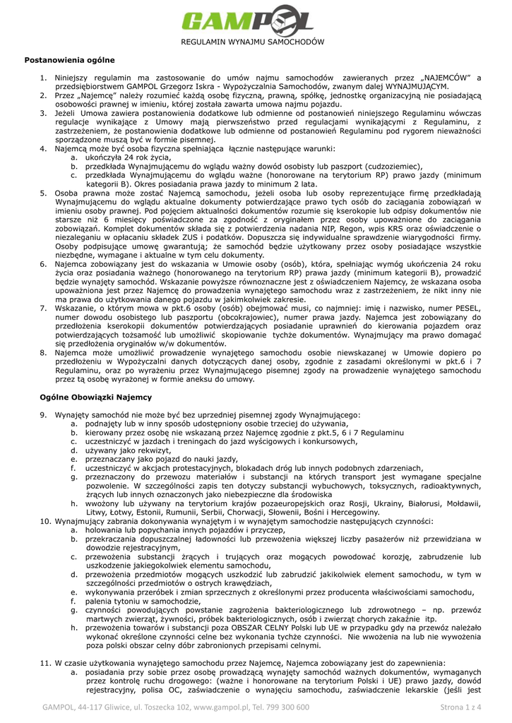 REGULAMIN WYNAJMU SAMOCHODÓW Postanowienia ogólne 1. 2. 3. 4. 5. 6. 7. 8. Niniejszy regulamin ma zastosowanie do umów najmu samochodów zawieranych przez „NAJEMCÓW” a przedsiębiorstwem GAMPOL Grzegorz Iskra - Wypożyczalnia Samochodów, zwanym dalej WYNAJMUJĄCYM. Przez „Najemcę” należy rozumieć każdą osobę fizyczną, prawną, spółkę, jednostkę organizacyjną nie posiadającą osobowości prawnej w imieniu, której została zawarta umowa najmu pojazdu. Jeżeli Umowa zawiera postanowienia dodatkowe lub odmienne od postanowień niniejszego Regulaminu wówczas regulacje wynikające z Umowy mają pierwszeństwo przed regulacjami wynikającymi z Regulaminu, z zastrzeżeniem, że postanowienia dodatkowe lub odmienne od postanowień Regulaminu pod rygorem nieważności sporządzone muszą być w formie pisemnej. Najemcą może być osoba fizyczna spełniająca łącznie następujące warunki: a. ukończyła 24 rok życia, b. przedkłada Wynajmującemu do wglądu ważny dowód osobisty lub paszport (cudzoziemiec), c. przedkłada Wynajmującemu do wglądu ważne (honorowane na terytorium RP) prawo jazdy (minimum kategorii B). Okres posiadania prawa jazdy to minimum 2 lata. Osoba prawna może zostać Najemcą samochodu, jeżeli osoba lub osoby reprezentujące firmę przedkładają Wynajmującemu do wglądu aktualne dokumenty potwierdzające prawo tych osób do zaciągania zobowiązań w imieniu osoby prawnej. Pod pojęciem aktualności dokumentów rozumie się kserokopie lub odpisy dokumentów nie starsze niż 6 miesięcy poświadczone za zgodność z oryginałem przez osoby upoważnione do zaciągania zobowiązań. Komplet dokumentów składa się z potwierdzenia nadania NIP, Regon, wpis KRS oraz oświadczenie o niezaleganiu w opłacaniu składek ZUS i podatków. Dopuszcza się indywidualne sprawdzenie wiarygodności firmy. Osoby podpisujące umowę gwarantują; że samochód będzie użytkowany przez osoby posiadające wszystkie niezbędne, wymagane i aktualne w tym celu dokumenty. Najemca zobowiązany jest do wskazania w Umowie osoby (osób), która, spełniając wymóg ukończenia 24 roku życia oraz posiadania ważnego (honorowanego na terytorium RP) prawa jazdy (minimum kategorii B), prowadzić będzie wynajęty samochód. Wskazanie powyższe równoznaczne jest z oświadczeniem Najemcy, że wskazana osoba upoważniona jest przez Najemcę do prowadzenia wynajętego samochodu wraz z zastrzeżeniem, że nikt inny nie ma prawa do użytkowania danego pojazdu w jakimkolwiek zakresie. Wskazanie, o którym mowa w pkt.6 osoby (osób) obejmować musi, co najmniej: imię i nazwisko, numer PESEL, numer dowodu osobistego lub paszportu (obcokrajowiec), numer prawa jazdy. Najemca jest zobowiązany do przedłożenia kserokopii dokumentów potwierdzających posiadanie uprawnień do kierowania pojazdem oraz potwierdzających tożsamość lub umożliwić skopiowanie tychże dokumentów. Wynajmujący ma prawo domagać się przedłożenia oryginałów w/w dokumentów. Najemca może umożliwić prowadzenie wynajętego samochodu osobie niewskazanej w Umowie dopiero po przedłożeniu w Wypożyczalni danych dotyczących danej osoby, zgodnie z zasadami określonymi w pkt.6 i 7 Regulaminu, oraz po wyrażeniu przez Wynajmującego pisemnej zgody na prowadzenie wynajętego samochodu przez tą osobę wyrażonej w formie aneksu do umowy. Ogólne Obowiązki Najemcy 9. Wynajęty samochód nie może być bez uprzedniej pisemnej zgody Wynajmującego: a. podnajęty lub w inny sposób udostępniony osobie trzeciej do używania, b. kierowany przez osobę nie wskazaną przez Najemcę zgodnie z pkt.5, 6 i 7 Regulaminu c. uczestniczyć w jazdach i treningach do jazd wyścigowych i konkursowych, d. używany jako rekwizyt, e. przeznaczany jako pojazd do nauki jazdy, f. uczestniczyć w akcjach protestacyjnych, blokadach dróg lub innych podobnych zdarzeniach, g. przeznaczony do przewozu materiałów i substancji na których transport jest wymagane specjalne pozwolenie. W szczególności zapis ten dotyczy substancji wybuchowych, toksycznych, radioaktywnych, żrących lub innych oznaczonych jako niebezpieczne dla środowiska h. wwożony lub używany na terytorium krajów pozaeuropejskich oraz Rosji, Ukrainy, Białorusi, Mołdawii, Litwy, Łotwy, Estonii, Rumunii, Serbii, Chorwacji, Słowenii, Bośni i Hercegowiny. 10. Wynajmujący zabrania dokonywania wynajętym i w wynajętym samochodzie następujących czynności: a. holowania lub popychania innych pojazdów i przyczep, b. przekraczania dopuszczalnej ładowności lub przewożenia większej liczby pasażerów niż przewidziana w dowodzie rejestracyjnym, c. przewożenia substancji żrących i trujących oraz mogących powodować korozję, zabrudzenie lub uszkodzenie jakiegokolwiek elementu samochodu, d. przewożenia przedmiotów mogących uszkodzić lub zabrudzić jakikolwiek element samochodu, w tym w szczególności przedmiotów o ostrych krawędziach, e. wykonywania przeróbek i zmian sprzecznych z określonymi przez producenta właściwościami samochodu, f. palenia tytoniu w samochodzie, g. czynności powodujących powstanie zagrożenia bakteriologicznego lub zdrowotnego – np. przewóz martwych zwierząt, żywności, próbek bakteriologicznych, osób i zwierząt chorych zakaźnie itp. h. przewożenia towarów i substancji poza OBSZAR CELNY Polski lub UE w przypadku gdy na przewóz należało wykonać określone czynności celne bez wykonania tychże czynności. Nie wwożenia na lub nie wywożenia poza polski obszar celny dóbr zabronionych przepisami celnymi. 11. W czasie użytkowania wynajętego samochodu przez Najemcę, Najemca zobowiązany jest do zapewnienia: a. posiadania przy sobie przez osobę prowadzącą wynajęty samochód ważnych dokumentów, wymaganych przez kontrolę ruchu drogowego: (ważne i honorowane na terytorium Polski i UE) prawo jazdy, dowód rejestracyjny, polisa OC, zaświadczenie o wynajęciu samochodu, zaświadczenie lekarskie (jeś