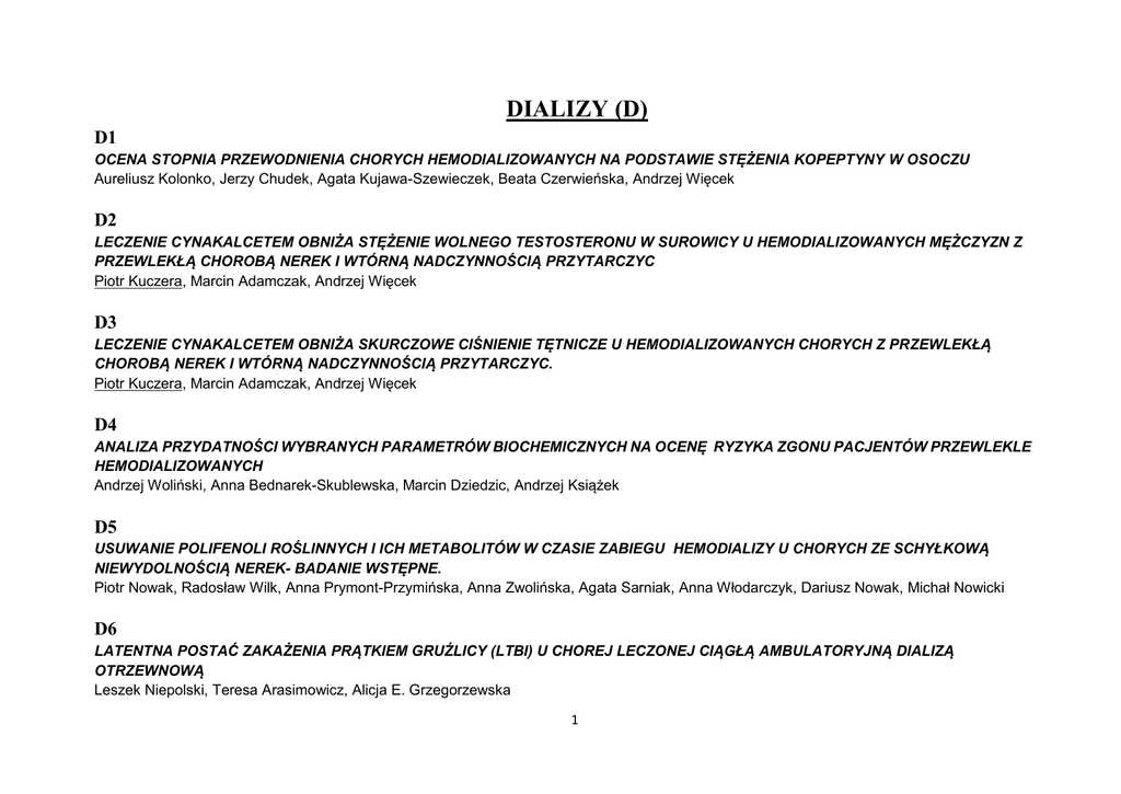 DIALIZY (D) D1 OCENA STOPNIA PRZEWODNIENIA CHORYCH HEMODIALIZOWANYCH NA PODSTAWIE STĘŻENIA KOPEPTYNY W OSOCZU Aureliusz Kolonko, Jerzy Chudek, Agata Kujawa-Szewieczek, Beata Czerwieńska, Andrzej Więcek D2 LECZENIE CYNAKALCETEM OBNIŻA STĘŻENIE WOLNEGO TESTOSTERONU W SUROWICY U HEMODIALIZOWANYCH MĘŻCZYZN Z PRZEWLEKŁĄ CHOROBĄ NEREK I WTÓRNĄ NADCZYNNOŚCIĄ PRZYTARCZYC Piotr Kuczera, Marcin Adamczak, Andrzej Więcek D3 LECZENIE CYNAKALCETEM OBNIŻA SKURCZOWE CIŚNIENIE TĘTNICZE U HEMODIALIZOWANYCH CHORYCH Z PRZEWLEKŁĄ CHOROBĄ NEREK I WTÓRNĄ NADCZYNNOŚCIĄ PRZYTARCZYC. Piotr Kuczera, Marcin Adamczak, Andrzej Więcek D4 ANALIZA PRZYDATNOŚCI WYBRANYCH PARAMETRÓW BIOCHEMICZNYCH NA OCENĘ RYZYKA ZGONU PACJENTÓW PRZEWLEKLE HEMODIALIZOWANYCH Andrzej Woliński, Anna Bednarek-Skublewska, Marcin Dziedzic, Andrzej Książek D5 USUWANIE POLIFENOLI ROŚLINNYCH I ICH METABOLITÓW W CZASIE ZABIEGU HEMODIALIZY U CHORYCH ZE SCHYŁKOWĄ NIEWYDOLNOŚCIĄ NEREK- BADANIE WSTĘPNE. Piotr Nowak, Radosław Wilk, Anna Prymont-Przymińska, Anna Zwolińska, Agata Sarniak, Anna Włodarczyk, Dariusz Nowak, Michał Nowicki D6 LATENTNA POSTAĆ ZAKAŻENIA PRĄTKIEM GRUŹLICY (LTBI) U CHOREJ LECZONEJ CIĄGŁĄ AMBULATORYJNĄ DIALIZĄ OTRZEWNOWĄ Leszek Niepolski, Teresa Arasimowicz, Alicja E. Grzegorzewska 1 D7 POLIMORFIZMY GENÓW SZLAKU WITAMINY D (PGSWD) A WIEK CHORYCH ROZPOCZYNAJĄCYCH LECZENIE NERKOZASTĘPCZE (RRT) Alicja E. Grzegorzewska, Grzegorz Ostromecki, Adrianna Mostowska, Anna Sowińska, Paweł P. Jagodziński D8 PÓŹNA POPRAWA FUNKCJI NEREK U PACJENTKI ZE SZPICZAKIEM PLAZMOCYTOWYM LECZONEJ PRZY UŻYCIU DIALIZATORÓW Z WYSOKIM PUNKTEM ODCIĘCIA (HCO) – OPIS PRZYPADKU Katarzyna Ponikwicka, Alicja Rydzewska – Rosołowska, Tomasz Hryszko, Beata Naumnik D9 WYBIÓRCZA APLAZJA CZERWONOKRWINKOWA U CHOREJ DIALIZOWANEJ LECZONEJ EPOETYNĄ BETA. Zdrojewski Łukasz, Konopa Joanna, Liberek Tomasz, Śliwarska Julita, Grabowska Magdalena, Rutkowski Bolesław D10 WPŁYW HEMODIALIZY Z ENOKSAPARYNĄ VERSUS BEZ SYSTEMOWEJ ANTYKOAGULACJI NA AKTYWNOŚĆ DYSMUTAZY NADTLENKOWEJ Jacek Borawski, Joanna Goździkiewicz-Łapińska, Beata Naumnik D11 SKUTECZNOŚĆ BIOPODOBNEGO LEKU EPOETIN ALFA: POLSKIE JEDNOROCZNE WYNIKI DAWKOWANIA BIOPODOBNEGO LEKU EPOETIN ALFA NA STABILNOŚĆ POZIOMU HEMOGLOBINY W BADANIU FARMAKOEPIDEMIOLOGICZNYM MONITOR-CKD5 LECZENIE NIEDOKRWISTOŚCI W HEMODIALIZACH P. Wierzbicki, G.Orlik D12 ZABURZENIA NEUROLOGICZNE U CHORYCH Z PRZEWLEKŁĄ CHOROBĄ NEREK LECZONYCH HEMODIALIZAMI JAKO POTENCJALNA PRZYCZYNA UPADKÓW Przedlacki Jerzy, Macias Anna, Kulicki Paweł, Kubiszewska Justyna, Kościelska Małgorzata, Pyrża Michał, Janoska Marlena, Bieńkowska Małgorzata, Mroczek Aneta, Rdzanek Magdalena, Zakrzewska-Pniewska Beata, Matuszkiewicz-Rowińska Joanna 2 D13 OCENA SKUTECZNOŚCI ZABIEGU CIĄGŁEJ ŻYLNO-ŻYLNEJ HEMODIALIZY Z WYKORZYSTANIEM HEMOFILTRA TYPU „HIGH CUT-OFF” W USUWANIU WYBRANYCH CYTOKIN U CHORYCH WE WSTRZĄSIE SEPTYCZNYM - DONIESIENIE WSTĘPNE. Kade Grzegorz, Lubas Arkadiusz, Niemczyk Stanisław, Wańkowicz Zofia , Rzeszotarska Agnieszka, Korsak Jolanta D14 WPŁYW STANU ODŻYWIENIA NA STĘŻENIA KWASU D-MLEKOWEGO I ZONULINY W OSOCZU PACJENTÓW HEMODIALIZOWANYCH Katarzyna Wyskida, Urszula Spiechowicz, Sylwia Rotkegel, Jarosław Ciepał,Dariusz Klein, Maria Bożentowicz- Wikarek, Aniceta Brzozowska, Magdalena Olszanecka-Glinianowicz, Jerzy Chudek D15 WPŁYW PRZEPUSZCZALNOŚCI OTRZEWNEJ NA PARAMETRY KLINICZNE I BIOCHEMICZNE U DZIECI LECZONYCH PRZEWLEKLE DIALIZĄ OTRZEWNOWĄ Maria Roszkowska-Blaim, Piotr Skrzypczyk D16 FRAX JAKO METODA PRZEWIDYWANA ZWIĘKSZONEGO RYZYKA ZŁAMANIA KOŚCI U CHORYCH Z PRZEWLEKŁĄ CHOROBĄ NEREK LECZONYCH DIALIZAMI 29 Ośrodków Dializ woj. mazowieckiego Przedlacki Jerzy, Buczyńska-Chyl Jolanta, Koźmiński Piotr, Stopiński Marek, Niemczyk Ewa, Gieglis Edyta, Żebrowski Paweł, Mieczkowski Mariusz, Wojtaszek Ewa, Gawron Rafał, Podgórzak Andrzej, Ściślak Jolanta, Grochowski Janusz, Kędzierska Małgorzata, Kaczanowska Bożenna, Wyszyńska Agnieszka, Sitkowska Zofia, Klatko Wiesław, Gelert Ryszard, Daniewska Dorota, Osuch Dariusz, Stryjewski Dariusz, Świtalski Marek, Arkadiusz Piotrowski, Piotr Kędzierski, Andrzej Rydzewski, Bartosz Fiderkiewicz, Wypych-Birecka Magdalena, Śliwicka Dorota, Duplik Magdalena, Grzeszczyk Mirosław, Sokalski Antoni, Papliński Marek, Hartman Jakub, Imiela Jacek, Małecki Robert, Bolesta Agnieszka, Niemczyk Stanisław, Klimm Wojciech, Wierzbicki Przemysław, Gorczyńska Joanna, Piórecki Mirosław, Gołębiewski Sewer, Horbacz Roman, Matuszkiewicz-Rowińska Joanna 3 D17 PLASMA REFILLING DURING HEMODIALYSIS Pietribiasi Mauro, Waniewski Jacek, Dębowska Małgorzata, Wójcik-Załuska Alicja, Książek Andrzej, Załuska Wojciech D18 OCENA ADEKWATNOŚCI USUWANIA FOSFORANÓW NA PODSTAWIE TYGODNIOWEGO MONITORINGU HEMODIALIZ Załuska Wojciech, Waniewski Jacek, Dębowska Małgorzata, Wójcik-Załuska Alicja, Książek Andrzej D19 KINETYKA WAPNIA PODCZAS TYGODNIOWEGO CYKLU TRZECH HEMODIALIZ Waniewski Jacek, Dębowska Małgorzata, Wójcik-Załuska Alicja, Książek Andrzej, Załuska Wojciech D20 ANALIZA PRZEŻYCIA PACJENTÓW ZE SCHYŁKOWĄ NIEWYDOLNOŚCIĄ NEREK W PIERWSZYM ROKU LECZENIA NERKOZASTĘPCZEGO. Dorota Brodowska-Kania, Krzysztof Gibiński, Julia Kiełczewska, Aleksandra Rymarz, Marek Saracyn, Małgorzata Gomółka, Katarzyna Szamotulska, Stanisław Niemczyk D21 ZASTOSOWANIE FONDAPARYNUKSU W CHORYCH HEMODIALIZOWANYCH Wojciech Klimm, Sebastian Spaleniak, Jerzy Smoszna, Małgorzata Gomółka, Marek Saracyn, Stanisław Niemczyk D22 PLASMA ASCORBATE AND HOMOCYSTEINE CONCENTRATION AND ERYTHROCYTES ANTIOXIDANT ACTIVITY OF PATIENTS WITH CHRONIC KIDNEY DISEASE ON RENAL REPLACEMENT THERAPY Przemysław Miarka, Agata Pietrzycka, Monika Głuch-Litwin, Eve Chowaniec, Grzegorz Chmiel, Katarzyna Janda, Władysław Sułowicz 4 D23 DIALIZA OTRZEWNOWA- WYBÓR CHOREGO, CZY „OSTATNIA DESKA RATUNKU”? Agnieszka M. Grzebalska, Jarosł