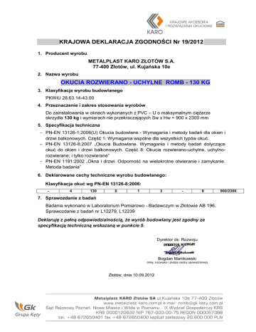 KRAJOWA DEKLARACJA ZGODNOŚCI Nr 19/2012 1. Producent wyrobu METALPLAST KARO ZŁOTÓW S.A. 77-400 Złotów, ul. Kujańska 10e 2. Nazwa wyrobu OKUCIA ROZWIERANO - UCHYLNE ROMB - 130 KG 3. Klasyfikacja wyrobu budowlanego PKWiU 28.63.14-43.00 4. Przeznaczenie i zakres stosowania wyrobów Do zainstalowania w oknach wykonanych z PVC – U o maksymalnym ciężarze skrzydła 130 kg i wymiarach nie przekraczających Sw x Hw = 900 x 2300 mm 5. Specyfikacja techniczna - PN-EN 13126-1:2006(U) Okucia budowlane - Wymagania i metody badań dla okien i drzwi balkonowych. Część 1: Wymagania wspólne dla wszystkich typów okuć. - PN-EN 13126-8:2007 „Okucia Budowlane. Wymagania i metody badań dotyczące okuć do okien i drzwi balkonowych. Część 8: Okucia rozwierano-uchylne, uchylnorozwierane; i tylko rozwierane” - PN-EN 1191:2002 „Okna i drzwi. Odporność na wielokrotne otwieranie i zamykanie. Metoda badania” 6. Deklarowane cechy techniczne wyrobu budowlanego: Klasyfikacja okuć wg PN-EN 13126-8:2006: - 4 130 0 1 3 - 8 7. Sprawozdanie z badań Badania wykonano w Laboratorium Pomiarowo - Badawczym w Złotowie AB 196. Sprawozdanie z badań nr L12279, L12239 Deklaruję z pełną odpowiedzialnością, że wyrób budowlany jest zgodny ze specyfikacją techniczną wskazaną w punkcie 5. Dyrektor ds. Rozwoju Bogdan Manikowski (imię, nazwisko i podpis osoby upoważnionej) Złotów, dnia 10.09.2012 900/2300