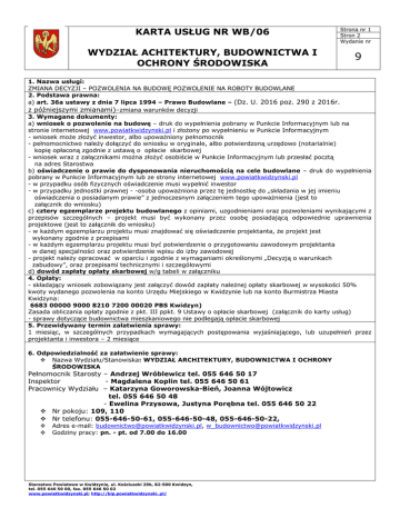 KARTA USŁUG NR WB/06 WYDZIAŁ ACHITEKTURY, BUDOWNICTWA I OCHRONY ŚRODOWISKA Strona nr 1 Stron 2 Wydanie nr 9 1. Nazwa usługi: ZMIANA DECYZJI – POZWOLENIA NA BUDOWĘ POZWOLENIE NA ROBOTY BUDOWLANE 2. Podstawa prawna: a) art. 36a ustawy z dnia 7 lipca 1994 – Prawo Budowlane – (Dz. U. 2016 poz. 290 z 2016r. z późniejszymi zmianami)–zmiana warunków decyzji 3. Wymagane dokumenty: a) wniosek o pozwolenie na budowę – druk do wypełnienia pobrany w Punkcie Informacyjnym lub na stronie internetowej www.powiatkwidzynski.pl i złożony po wypełnieniu w Punkcie Informacyjnym - wniosek może złożyć inwestor, albo upoważniony pełnomocnik - pełnomocnictwo należy dołączyć do wniosku w oryginale, albo potwierdzoną urzędowo (notarialnie) kopię opłaconą zgodnie z ustawą o opłacie skarbowej - wniosek wraz z załącznikami można złożyć osobiście w Punkcie Informacyjnym lub przesłać pocztą na adres Starostwa b) oświadczenie o prawie do dysponowania nieruchomością na cele budowlane – druk do wypełnienia pobrany w Punkcie Informacyjnym lub ze strony internetowej www.powiatkwidzynski.pl - w przypadku osób fizycznych oświadczenie musi wypełnić inwestor - w przypadku jednostki prawnej - -osoba upoważniona przez tę jednostkę do „składania w jej imieniu oświadczenia o posiadanym prawie” z jednoczesnym załączeniem tego upoważnienia (jest to załącznik do wniosku) c) cztery egzemplarze projektu budowlanego z opiniami, uzgodnieniami oraz pozwoleniami wynikającymi z przepisów szczególnych – projekt musi być wykonany przez osobę posiadającą odpowiednie uprawnienia projektowe (jest to załącznik do wniosku) - w każdym egzemplarzu projektu musi znajdować się oświadczenie projektanta, że projekt jest wykonany zgodnie z przepisami - w każdym egzemplarzu projektu musi być potwierdzenie o przygotowaniu zawodowym projektanta w danej specjalności oraz potwierdzenie wpisu do izby zawodowej - projekt należy opracować w oparciu i zgodnie z wymaganiami określonymi „Decyzją o warunkach zabudowy”, oraz przepisami technicznymi i szczegółowymi d) dowód zapłaty opłaty skarbowej w/g tabeli w załączniku 4. Opłaty: - składający wniosek zobowiązany jest załączyć dowód zapłaty należnej opłaty skarbowej w wysokości 50% kwoty wydanego pozwolenia na konto Urzędu Miejskiego w Kwidzynie lub na konto Burmistrza Miasta Kwidzyna: 6683 00000 9000 8210 7200 00020 PBS Kwidzyn) Zasada obliczania opłaty zgodnie z pkt. III ppkt. 9 Ustawy o opłacie skarbowej (załącznik do karty usług) - sprawy dotyczące budownictwa mieszkaniowego nie podlegają opłacie skarbowej 5. Przewidywany termin załatwienia sprawy: 1 miesiąc, w szczególnych przypadkach wymagających postępowania wyjaśniającego, lub uzupełnień przez projektanta i inwestora – 2 miesiące 6. Odpowiedzialność za załatwienie sprawy: Nazwa Wydziału/Stanowiska: WYDZIAŁ ARCHITEKTURY, BUDOWNICTWA I OCHRONY ŚRODOWISKA Pełnomocnik Starosty – Andrzej Wróblewicz tel. 055 646 50 17 Inspektor - Magdalena Koplin tel. 055 646 50 61 Pracownicy Wydziału – Katarzyna Goworowska-Bień, Joanna Wójtowicz tel. 055 646 50 48 - Ewelina Przysowa, Justyna Porębna tel. 055 646 50 22 Nr pokoju: 109, 110 Nr telefonu: 055-646-50-61, 055-646-50-48, 055-646-50-22, Adres e-mail: [email protected], [email protected] Godziny pracy: pn. - pt. od 7.00 do 16.00 Starostwo Powiatowe w Kwidzynie, ul. Kościuszki 29b, 82-500 Kwidzyn, tel. 055 646 50 00, fax. 055 646 50 02 www.powiatkwidzynski.pl; http://bip.powiatkwidzynski..pl/ KARTA USŁUG NR WB/06 Strona nr 2 WYDZIAŁ ACHITEKTURY, BUDOWNICTWA I OCHRONY ŚRODOWISKA Wydanie nr Stron 2 9 7. Tryb odwoławczy: Odwołanie należy składać poprzez Starostwo Powiatowe do Wojewody Pomorskiego ul. Okopowa 21/27 80-810 Gdańsk. Odwołanie składa się w terminie 14 dni od terminu doręczenia decyzji 8. Uwagi: - Decyzję można odebrać osobiście w pok. 109, 110 lub zostanie przesłana na adres inwestora. Odbiór osobisty znacznie przyspiesza sprawę. - Decyzja o pozwoleniu na budowę wygasa, jeżeli budowa nie zostanie rozpoczęta przed upływem trzech lat od dnia, w którym decyzja ta stanie się ostateczna lub budowa zostanie przerwana na okres dłuższy niż trzy lata. W takim przypadku należy ponownie wystąpić z kompletem dokumentów j.w. o nowe pozwolenie na budowę. 9. Miejsce na notatki: \ Starostwo Powiatowe w Kwidzynie, ul. Kościuszki 29b, 82-500 Kwidzyn, tel. 055 646 50 00, fax. 055 646 50 02 www.powiatkwidzynski.pl; http://bip.powiatkwidzynski..pl/ WNIOSEK O POZWOLENIE NA BUDOWĘ LUB ROZBIÓRKĘ (B-1) (podstawa prawna: art. 32 i art. 33 ustawy z dnia 7 lipca 1994 r. – Prawo budowlane) 1. Proszę wpisać nazwę organu właściwego do wydania pozwolenia (organ, do którego kierowany jest wniosek): .............................................................................................................................................................................................................................................. 2. Proszę oznaczyć znakiem X cel złożenia wniosku: Wniosek o pozwolenie na budowę lub rozbiórkę 3. Wniosek o zmianę pozwolenia na budowę lub rozbiórkę z dnia ...................nr............... Proszę wpisać dane inwestora (w tym adres zamieszkania lub siedziby): (w przypadku konieczności podania danych drugiego lub kolejnych inwestorów lub danych pełnomocnika, dane te należy podać w formularzu B-4) imię i nazwisko lub nazwa inwestora:................................................................ kraj: .......................................... województwo: ...………………………… powiat: ............................................................................................................... gmina: ...................................................................................................... miejscowość: .............................................................. ul