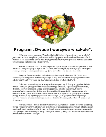 Program „Owoce i warzywa w szkole”. Głównym celem programu Wspólnej Polityki Rolnej „Owoce i warzywa w szkole” jest trwała zmiana nawyków żywieniowych dzieci poprzez zwiększenie udziału owoców i warzyw w ich codziennej diecie oraz propagowanie zdrowego odżywiania poprzez działania towarzyszące o charakterze edukacyjnym. W roku szkolnym 2016/2017 w programie będzie mogło uczestniczyć przeszło 1,350 mln dzieci uczęszczających regularnie do szkół podstawowych, tj. realizujących obowiązek rocznego przygotowania przedszkolnego (tzw. zerówki) oraz dzieci z klas I-III. Program finansowany jest ze środków pochodzących z budżetu UE (88%) oraz środków pochodzących z budżetu krajowego (12%), a całkowity budżet programu w roku szkolnym 2016/2017 wynosi ok. 19,762 mln EUR (ok. 84,265 mln PLN). Dzieciom uczestniczącym w programie udostępnia się 2, 3 razy w tygodniu świeże owoce i warzywa (przygotowane do bezpośredniego spożycia, wystarczająco rozwinięte, dojrzałe, zdrowe) oraz soki. Dzieci otrzymują jabłka, gruszki, truskawki, borówki amerykańskie, marchewkę, słodką paprykę, rzodkiewki, pomidorki i kalarepę oraz soki owocowe i warzywne. Każde dziecko uczestniczące w programie otrzymuje jednorazowo porcję składającą się z jednego produktu owocowego i jednego produktu warzywnego. Owoce, warzywa oraz soki nie mogą zawierać dodatku tłuszczu, soli, cukru lub substancji słodzących.. Aby skutecznie i trwale ukształtować nawyki żywieniowe - dzieci nie tylko otrzymują porcje owoców i warzyw, ale również uczestniczą w działaniach edukacyjnych informujących o zaletach spożywania owoców i warzyw. Każda szkoła uczestnicząca w programie, zgodnie z wytycznymi MEN realizuje różnego rodzaju działania poświęcone zdrowemu żywieniu oraz pochodzeniu owoców i warzyw.