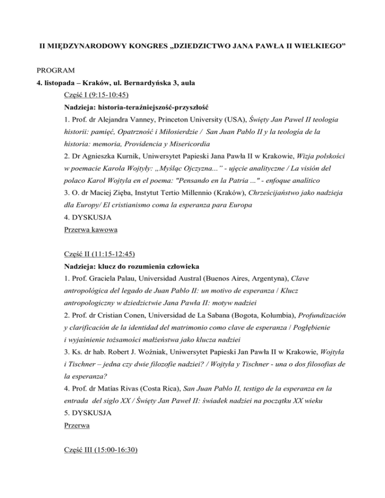 II MIĘDZYNARODOWY KONGRES „DZIEDZICTWO JANA PAWŁA II WIELKIEGO” PROGRAM 4. listopada – Kraków, ul. Bernardyńska 3, aula Część I (9:15-10:45) Nadzieja: historia-teraźniejszość-przyszłość 1. Prof. dr Alejandra Vanney, Princeton University (USA), Święty Jan Pawel II teologia historii: pamięć, Opatrzność i Miłosierdzie / San Juan Pablo II y la teología de la historia: memoria, Providencia y Misericordia 2. Dr Agnieszka Kurnik, Uniwersytet Papieski Jana Pawła II w Krakowie, Wizja polskości w poemacie Karola Wojtyły: „Myśląc Ojczyzna...” - ujęcie analityczne / La visión del polaco Karol Wojtyla en el poema: "Pensando en la Patria ..." - enfoque analítico 3. O. dr Maciej Zięba, Instytut Tertio Millennio (Kraków), Chrześcijaństwo jako nadzieja dla Europy/ El cristianismo coma la esperanza para Europa 4. DYSKUSJA Przerwa kawowa Część II (11:15-12:45) Nadzieja: klucz do rozumienia człowieka 1. Prof. Graciela Palau, Universidad Austral (Buenos Aires, Argentyna), Clave antropológica del legado de Juan Pablo II: un motivo de esperanza / Klucz antropologiczny w dziedzictwie Jana Pawła II: motyw nadziei 2. Prof. dr Cristian Conen, Universidad de La Sabana (Bogota, Kolumbia), Profundización y clarificación de la identidad del matrimonio como clave de esperanza / Pogłębienie i wyjaśnienie tożsamości małżeństwa jako klucza nadziei 3. Ks. dr hab. Robert J. Woźniak, Uniwersytet Papieski Jan Pawła II w Krakowie, Wojtyła i Tischner – jedna czy dwie filozofie nadziei? / Wojtyła y Tischner - una o dos filosofias de la esperanza? 4. Prof. dr Matías Rivas (Costa Rica), San Juan Pablo II, testigo de la esperanza en la entrada del siglo XX / Święty Jan Paweł II: świadek nadziei na początku XX wieku 5. DYSKUSJA Przerwa Część III (15:00-16:30) Nadzieja a ludzka miłość i płciowość 1. Prof. dr Rodrigo Guerra López, Centro de Investigacion Social Avanzada (México), Volver al umbral de la Esperanza: amor humano y acontecimiento cristiano / Powrót na próg nadziei: miłość ludzka i wydarzenie chrześcijańskie 2. Prof. dr Ana María Araújo, Universidad de La Sabana (Bogota, Kolumbia), Unidualidad: complementariedad varón mujer / Dwoistość: komplementarność mężczyzny i kobiety 3. Prof. dr Bogdan Piotrowski, Universidad de La Sabana (Bogota, Kolumbia), De la maternidad y la paternidad como esperanza en laa creación literaria de Karol Wojtyła / O macierzyństwie i ojcostwie jako nadziei w twórczości literackiej Karola Wojtyły 4. DYSKUSJA