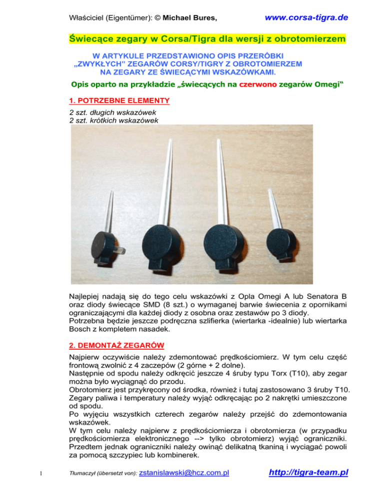Właściciel (Eigentümer): © Michael Bures, www.corsa-tigra.de Świecące zegary w Corsa/Tigra dla wersji z obrotomierzem W ARTYKULE PRZEDSTAWIONO OPIS PRZERÓBKI „ZWYKŁYCH” ZEGARÓW CORSY/TIGRY Z OBROTOMIERZEM NA ZEGARY ZE ŚWIECĄCYMI WSKAZÓWKAMI. Opis oparto na przykładzie „świecących na czerwono zegarów Omegi“ 1. POTRZEBNE ELEMENTY 2 szt. długich wskazówek 2 szt. krótkich wskazówek Najlepiej nadają się do tego celu wskazówki z Opla Omegi A lub Senatora B oraz diody świecące SMD (8 szt.) o wymaganej barwie świecenia z opornikami ograniczającymi dla każdej diody z osobna oraz zestawów po 3 diody. Potrzebna będzie jeszcze podręczna szlifierka (wiertarka -idealnie) lub wiertarka Bosch z kompletem nasadek. 2. DEMONTAŻ ZEGARÓW Najpierw oczywiście należy zdemontować prędkościomierz. W tym celu część frontową zwolnić z 4 zaczepów (2 górne + 2 dolne). Następnie od spodu należy odkręcić jeszcze 4 śruby typu Torx (T10), aby zegar można było wyciągnąć do przodu. Obrotomierz jest przykręcony od środka, również i tutaj zastosowano 3 śruby T10. Zegary paliwa i temperatury należy wyjąć odkręcając po 2 nakrętki umieszczone od spodu. Po wyjęciu wszystkich czterech zegarów należy przejść do zdemontowania wskazówek. W tym celu należy najpierw z prędkościomierza i obrotomierza (w przypadku prędkościomierza elektronicznego --> tylko obrotomierz) wyjąć ograniczniki. Przedtem jednak ograniczniki należy owinąć delikatną tkaniną i wyciągać powoli za pomocą szczypiec lub kombinerek. 1 Tłumaczył (übersetzt von): [email protected] http://tigra-team.pl Właściciel (Eigentümer): © Michael Bures, www.corsa-tigra.de Prędkościomierz Pozwolić „zejść“ wskazówce ku dołowi do samego krańcowego położenia, a następnie ściągnąć ją w takiej pozycji. W tym miejscu prawie zawsze na zewnętrznej krawędzi tarczy zegarowej zrobiony jest znacznik. DOKŁADNIE w tym miejscu należy ponownie założyć wskazówkę ! Wskazówkę najprościej ściągać podkładając i podważając większych rozmiarów płaskim śrubokrętem każdą z 2 stron wskazówki. Koniecznie zabezpieczyć przy tej czynności tarczę zegara osłaniając ją miękką szmatką ! Zaleca się wysoką ostrożność, aby czegoś nie zepsuć. W przypadku prędkościomierza elektronicznego wskazówka zawsze zatrzymuje się samodzielnie na 0. Ściągając wskazówkę postępować dokładnie tak samo, jak to opisano powyżej. Zakładając ją ponownie zwrócić uwagę na montaż w pozycji 0. Obrotomierz Także wskazówce obrotomierza należy pozwolić „zejść“ do krańcowego położenia ku dołowi (tylko troszkę poniżej 0) dla takiej pozycji ją ściągnąć. Paliwo+Temperatura Trzeba po prostu zdecydowanie pociągnąć wskazówkę, a wtedy zejdzie naprawdę łatwo. Dzięki karbowi wykonanemu na jej uchwycie ponowny montaż wskazówki jest zapewniony dokładnie w tym samym miejscu. Wreszcie na koniec w przypadku prędkościomierza i obrotomierza należy odkręcić dwie środkowe śrubki i zdjąć tarczę. 3. MONTAŻ 3 DIÓD LED LED-y w przypadku prędkościomierza i obrotomierza zamontować jak na poniższym rysunku: 2 Tłumaczył (übersetzt von): [email protected] http://tigra-team.pl Właściciel (Eigentümer): © Michael Bures, www.corsa-tigra.de W przypadku zegarów paliwa i temperatury silnika (niestety brak fotografii) należy umieścić odpowiednio tylko po jednej diodzie LED na godzinie 12, bezpośrednio nad uchwytem wskazówki. Dla zapewnienia miejsca na podkładce tarczy prędkościomierza najlepiej użyć jest do tego celu szlifierki (wiertarki) podręcznej. Uwaga: nie przesadzić ze szlifowaniem, bowiem trzeba przecież jeszcze zapewnić powierzchnię montażową dla samych LED-ów. Po wykonaniu miejsca LED-y przykleić we wskazanej pozycji za pomocą kleju szybkoschnącego lub innego. 3 diody LED w przypadku prędkościomierza i obrotomierza łączymy szeregowo, w związku z czym należy je polutować jak na poniższym rysunku: Opornika ograniczającego prąd LED-ów nie umieszczać bezpośrednio na diodach, bowiem tutaj na głębokości naprawdę niewiele jest już miejsca. ZAWSZE zwracać uwagę na to, aby wskazówki miały później swobodę ruchu. Całość złożyć kilka razy próbnie, aby sprawdzić czy nic wzajemnie o siebie nie ociera! Wskazówki szczególne dotyczące mojego, własnego zestawu: - oporniki 470 Ohm przeznaczone są dla 3 LED-ów połączonych szeregowo. - oporniki 680 Ohm przeznaczone są dla pojedynczych diód LED. Katoda LED-a (minus) jest wyprowadzona płasko od naroża z przodu diody. Kable diód LED poprowadzić wspólnie i przylutować przykładowo do jednej oprawki oświetlenia umieszczonej na folii przewodzącej. Zwrócić uwagę na biegunowość „+” i „–„ ponieważ jak wiadomo, diody LED polaryzowane są przewodząco tylko w jednym kierunku! 3 Tłumaczył (übersetzt von): [email protected] http://tigra-team.pl Właściciel (Eigentümer): © Michael Bures, www.corsa-tigra.de 4. DOPASOWANIE WSKAZÓWEK Krótkie wskazówki zegara ilości paliwa i temperatury silnika można zamontować bez problemu. Karb wykonany we wskazówce z Omegi pasuje idealnie do zegarów Corsy/Tigry, jednakże ma tu miejsce pewne przesunięci kątowe. Dla kompensacji tego przesunięcia zarówno zegar zbiornika jak i temperatury posiadają od spodu (przedłużenie wałka wskazówki) kółeczko regulacyjne dla precyzyjnej nastawy położenia początkowego wskazówki. W przypadku oryginalnej wskazówki najlepiej zapamiętać jest jej położenie początkowe dla wyłączonego zapłonu (... a więc kiedy tacho leży na blacie stołu ... ), a następnie po nałożeniu nowej wskazówki kółeczkiem regulacyjnym skorygować jej położenie początkowe. Dopasowanie dłuższych wskazówek w przypadku prędkościomierza i obrotomierza jest zróżnicowane, ponieważ dostępne są: a) różne wskazówki do Omegi-A oraz b) różne grubośc