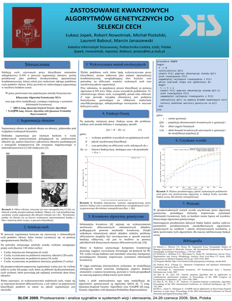ZASTOSOWANIE KWANTOWYCH ALGORYTMÓW GENETYCZNYCH DO SELEKCJI CECH Łukasz Jopek, Robert Nowotniak, Michał Postolski, Laurent Babout, Marcin Janaszewski Katedra Informatyki Stosowanej, Politechnika Łódzka, Łódź, Polska ljopek, rnowotniak, mpostol, lbabout, [email protected] Streszczenie Selekcję cech, używanych przez klasyfikator minimalno odległościowy k-NN w procesie segmentacji obrazów, można potraktować jako problem dwukryterialnej optymalizacji kombinatorycznej, której celem jest znalezienie takiego podzbioru cech punktów obrazu, który pozwala na zadowalającą segmentację w możliwie krótkim czasie. W pracy porównano trzy populacyjne metody heurystyczne: Klasyczny Algorytm Genetyczny SGA oraz jego dwie modyfikacje, czerpiące inspirację z systemów informatyki kwantowej: • QiGA (ang. Quantum-Inspired Genetic Algorithm) • GAQPR (ang. Genetic Algorithm with Quantum Probability Representation) 1. Segmentacja obrazów Segmentacja obrazu to podział obrazu na obszary, jednorodne pod względem wybranych kryteriów. Dokładna segmentacja jest istotnym krokiem w wielu praktycznych zastosowaniach polegających na analizowaniu obrazów np. analiza ilościowa i jakościowa obrazów pochodzących z tomografii komputerowej lub rezonansu magnetycznego w materiałoznawstwie [1] lub medycynie [2]. (a) (b) (c) (d) 3. Wykorzystanie metod ewolucyjnych Wybór podzbioru cech, które będą wykorzystywane przez klasyfikator, można traktować jako zadanie optymalizacji kombinatorycznej, uwzględniającej dwa kryteria: czas potrzebny na obliczenie wartości wybranych cech oraz uzyskiwaną jakość segmentacji. Przy założeniu, że pojedynczy proces klasyfikacji za pomocą algorytmu k-NN trwa 10ms, ocena wszystkich podzbiorów 32elementowego zbioru cech, wymagałaby ponad roku obliczeń. Z tego powodu rozsądną alternatywą jest podejście heurystyczne, pozwalające na efektywne znalezienie satysfakcjonującego, suboptymalnego rozwiązania w znacznie krótszym czasie. procedure GAQPR begin t := 0 zainicjalizuj Q(t) utwórz P(t) poprzez obserwację stanów Q(t) oceń rozwiązania P(t) zapamiętaj najlepsze rozwiązanie z P(t) while (warunek stopu nie spełniony) do begin t := t + 1 utwórz P(t) poprzez obserwację stanów Q(t-1) oceń rozwiązania P(t) zapamiętaj najlepsze rozwiązanie z P(t) zaktualizuj Q(t) za pomocą bramek kwantowych U(t) zastosuj dodatkowe operatory genetyczne na Q(t) end end 4. Funkcja Oceny gdzie: t - numer generacji Na potrzeby niniejszej pracy funkcja oceny dla problemu selekcji cech została dobrana w następujący sposób: Q(t) - populacja chromosomów kwantowych w generacji t f(x) = K – S(t, w) U(t) - zbiór bramek kwantowych używanych w generacji t do modyfikacji populacji Q (1) gdzie: x - wybrany podzbiór wszystkich uwzględnianych cech K - jakość uzyskiwanej klasyfikacji P(t) - zbiór ciągów binarnych 6. Uzyskane wyniki T - czas potrzebny na obliczenie cech, należących do x S(t, w) - liniowa funkcja kary, skalująca czas t do przedziału < 0;w > Rysunek 3: Wykres przedstawiający jakość znalezionych podzbiorów cech przez trzy porównywane algorytmy w funkcji liczby wywołań funkcji oceny, dla tekstury tomograficznej. Rysunek 1: Obraz tekstury sztucznej (a) oraz tomograficznej [1] (b), na których zostały przeprowadzone badania. Obrazy (c) i (d) przedstawiają uzyskany wynik segmentacji dla obrazów kolejno (a) i (b) . Wyróżnione punkty na obrazie (a) są losowo wybranymi reprezentantami każdej z klas i stanowią zbiór uczący w procesie klasyfikacji. 2. Selekcja cech W procesie segmentacji korzysta się zazwyczaj z różnorodnych cech punktów obrazu, które można wyznaczyć np. za pomocą oprogramowania MaZda [3].. Na potrzeby niniejszego artykułu zostały wybrane następujące grupy cech (łącznie 144 różne cechy): Rysunek 2: Rozkład statystyczny wartości zaproponowanej przez autorów funkcji celu w przestrzeni podzbiorów uwzględnianych cech – wygenerowany dla tekstury tomograficznej (Rys. 1 (b)) 7. Wnioski W przeprowadzonych testach wyniki uzyskiwane przez algorytmy genetyczne, posiadające elementy inspirowane systemami informatyki kwantowej, były za każdym razem lepsze od wyników 5. Kwantowe algorytmy genetyczne klasycznego algorytmu genetycznego. Interesującym przedmiotem dalszych badań będzie analiza wpływu Informatyka kwantowa [4] zajmuje się wykorzystaniem parametrów przedstawionych zmodyfikowanych algorytmów możliwości obliczeniowych miniaturowych układów, genetycznych na szybkość i jakość otrzymywanych rezultatów, a podlegających prawom mechaniki kwantowej. Dzięki także porównanie tych algorytmów dla inaczej zdefiniowanej funkcji unikalnym własnościom takich układów niektóre problemy oceny. obliczeniowe mogłyby być rozwiązywane w sposób znacznie bardziej efektywny, niż jest to możliwe za pomocą Bibliografia jakichkolwiek klasycznych maszyn obliczeniowych (np. [5]). Mimo iż budowa użytecznego komputera kwantowego pozostaje ciągłym wyzwaniem równolegle od późnych lat 90. XX wieku trwają badania nad metodami sztucznej inteligencji, posiadającymi elementy inspirowane systemami informatyki kwantowej. [1] Babout L., Marrow T.J., Preuss M.: Sequential X-ray Tomography Studies of Damage Assessment in Materials Science, 4th International Symposium on Process Tomography in Poland. Proceedings. s.159-162, 2006. [2] Tschirren J., Hoffman E.A., McLennan G., Sonka M.: Intrathoracic Airway Trees: Segmentation and Airway Morphology Analysis from Low-Dose CT Scans. IEEE Transactions on Medical Imaging 24(12), pp. 1529-1539, 2005 [3] Program MaZda, http://www.eletel.p.lodz.pl/programy/cost/progr_mazda.html Do przeprowadzenia poprawnej segmentacji ważne jest, by wybrać tylko te cechy lub grupy cech, które są dobrymi dyskryminatorami, czyli cechami, które pozwalają jak najlepiej rozróżniać dane klasy obrazów. W ciągu ostatniego dziesięciolecia wykazano, że modyfikacja ist