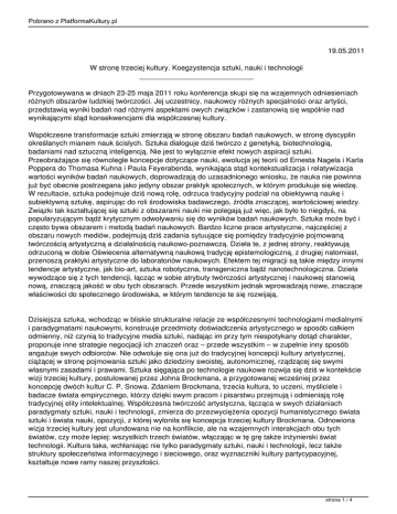 Pobrano z PlatformaKultury.pl 19.05.2011 W stronę trzeciej kultury. Koegzystencja sztuki, nauki i technologii ____________________________ Przygotowywana w dniach 23-25 maja 2011 roku konferencja skupi się na wzajemnych odniesieniach różnych obszarów ludzkiej twórczości. Jej uczestnicy, naukowcy różnych specjalności oraz artyści, przedstawią wyniki badań nad różnymi aspektami owych związków i zastanowią się wspólnie nad wynikającymi stąd konsekwencjami dla współczesnej kultury. Współczesne transformacje sztuki zmierzają w stronę obszaru badań naukowych, w stronę dyscyplin określanych mianem nauk ścisłych. Sztuka dialoguje dziś twórczo z genetyką, biotechnologią, badaniami nad sztuczną inteligencją. Nie jest to wyłącznie efekt nowych aspiracji sztuki. Przeobrażające się równolegle koncepcje dotyczące nauki, ewolucja jej teorii od Ernesta Nagela i Karla Poppera do Thomasa Kuhna i Paula Feyerabenda, wynikająca stąd kontekstualizacja i relatywizacja wartości wyników badań naukowych, doprowadzają do uzasadnionego wniosku, że nauka nie powinna już być obecnie postrzegana jako jedyny obszar praktyk społecznych, w którym produkuje się wiedzę. W rezultacie, sztuka podejmuje dziś nową rolę, odrzuca tradycyjny podział na obiektywną naukę i subiektywną sztukę, aspirując do roli środowiska badawczego, źródła znaczącej, wartościowej wiedzy. Związki tak kształtującej się sztuki z obszarami nauki nie polegają już więc, jak było to niegdyś, na popularyzującym bądź krytycznym odwoływaniu się do wyników badań naukowych. Sztuka może być i często bywa obszarem i metodą badań naukowych. Bardzo liczne prace artystyczne, najczęściej z obszaru nowych mediów, podejmują dziś zadania sytuujące się pomiędzy tradycyjnie pojmowaną twórczością artystyczną a działalnością naukowo-poznawczą. Dzieła te, z jednej strony, reaktywują odrzuconą w dobie Oświecenia alternatywną naukową tradycję epistemologiczną, z drugiej natomiast, przenoszą praktyki artystyczne do laboratoriów naukowych. Efektem tej migracji są takie między innymi tendencje artystyczne, jak bio-art, sztuka robotyczna, transgeniczna bądź nanotechnologiczna. Dzieła wywodzące się z tych tendencji, łącząc w sobie atrybuty twórczości artystycznej i naukowej stanowią nową, znaczącą jakość w obu tych obszarach. Przede wszystkim jednak wprowadzają nowe, znaczące właściwości do społecznego środowiska, w którym tendencje te się rozwijają. Dzisiejsza sztuka, wchodząc w bliskie strukturalne relacje ze współczesnymi technologiami medialnymi i paradygmatami naukowymi, konstruuje przedmioty doświadczenia artystycznego w sposób całkiem odmienny, niż czynią to tradycyjne media sztuki, nadając im przy tym niespotykany dotąd charakter, proponuje inne strategie negocjacji ich znaczeń oraz – przede wszystkim – w zupełnie inny sposób angażuje swych odbiorców. Nie odwołuje się ona już do tradycyjnej koncepcji kultury artystycznej, ciążącej w stronę pojmowania sztuki jako dziedziny swoistej, autonomicznej, rządzącej się swymi własnymi zasadami i prawami. Sztuka sięgająca po technologie naukowe rozwija się dziś w kontekście wizji trzeciej kultury, postulowanej przez Johna Brockmana, a przygotowanej wcześniej przez koncepcję dwóch kultur C. P. Snowa. Zdaniem Brockmana, trzecia kultura, to uczeni, myśliciele i badacze świata empirycznego, którzy dzięki swym pracom i pisarstwu przejmują i odmieniają rolę tradycyjnej elity intelektualnej. Współczesna twórczość artystyczna, łącząca w swych działaniach paradygmaty sztuki, nauki i technologii, zmierza do przezwyciężenia opozycji humanistycznego świata sztuki i świata nauki, opozycji, z której wyłoniła się koncepcja trzeciej kultury Brockmana. Odnowiona wizja trzeciej kultury jest ufundowana nie na konflikcie, ale na wzajemnych interakcjach obu tych światów, czy może lepiej: wszystkich trzech światów, włączając w tę grę także inżynierski świat technologii. Kultura taka, wchłaniając nie tylko paradygmaty sztuki, nauki i technologii, lecz także struktury społeczeństwa informacyjnego i sieciowego, oraz wyznaczniki kultury partycypacyjnej, kształtuje nowe ramy naszej przyszłości. strona 1 / 4 Pobrano z PlatformaKultury.pl Przygotowywana w dniach 23-25 maja 2011 roku konferencja skupi się na tych właśnie wzajemnych odniesieniach trzech wskazanych obszarów ludzkiej twórczości. Jej uczestnicy, naukowcy różnych specjalności oraz artyści, przedstawią wyniki badań nad różnymi aspektami owych związków i zastanowią się wspólnie nad wynikającymi stąd konsekwencjami dla współczesnej kultury. Konferencja jest otwarta dla publiczności, wstęp wolny. Osoby zainteresowane uczestnictwem w konferencji proszone są o wypełnienie formularza na stronie www.laznia.pl bądź artandsciencemeeting.pl i przesłanie go na adres [email protected] Termin przesłania zgłoszenia: 16 maja 2011. Po otrzymaniu zgłoszenia będziemy wysyłać emaila z prośbą o potwierdzenie. Brak potwierdzenia do 19 maja będzie oznaczał rezygnację z udziału w konferencji. UWAGA! Ilość miejsc ograniczona. PLAN KONFERENCJI: 23 maja 10.00 - 13.00: Konferencja (Dwór Artusa) 13.00 - 15.00: przerwa obiadowa 15.00 - 18.00: Konferencja (Dwór Artusa) 24 maja 10.00 - 12.00: zwiedzanie wystawy Performing Data (CSW Łaźnia) 12.00 - 14.00: przerwa obiadowa 14.00 - 18.00: Konferencja (Dwór Artusa) 25 maja 10.00 - 12.00: zwiedzanie wystawy Pleasure of Light (Zielona Brama) 12.00 - 14.00: przerwa obiadowa 14.00 - 16.00: Konferencja - dyskusja panelowa (Dwór Artusa) Uczestnicy konferencji: dr Monika Bakke Uniwersytet im. Adama Mickiewicza w Poznaniu Kuba Bąkowski Warszawa Edwin Bendyk strona 2 / 4 Pobrano z PlatformaKultury.pl Tygodnik POLITYKA Warszawa Dr Martha Blassnigg University of Plymouth Wielka Brytania Prof. Elinor Nina Czegledy Unive
