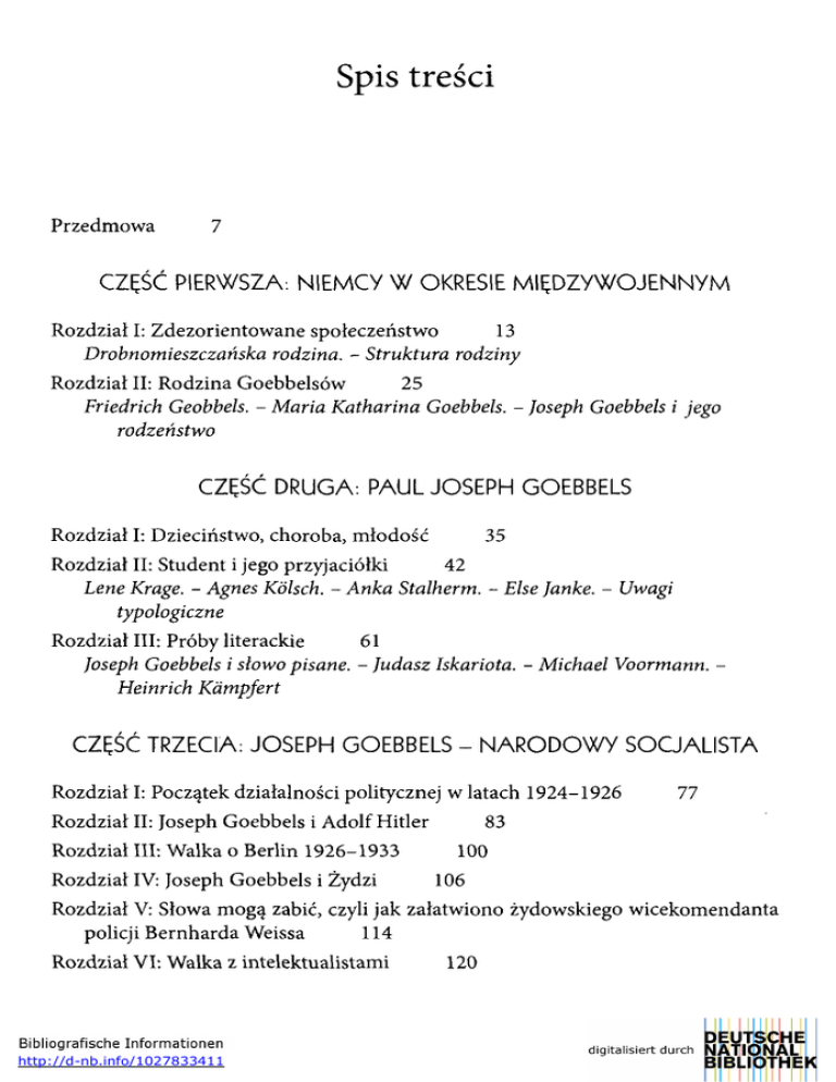 Spis treści Przedmowa 7 CZĘŚĆ PIERWSZA-. NIEMCY W OKRESIE MIĘDZYWOJENNYM Rozdział I: Zdezorientowane społeczeństwo 13 Drobnomieszczańska rodzina. - Struktura rodziny Rozdział II: Rodzina Goebbelsów 25 Friedrich Geobbels. - Maria Katharina Goebbels. - Joseph Goebbels i jego rodzeństwo CZĘŚĆ DRUGA: PAUL JOSEPH GOEBBELS Rozdział I: Dzieciństwo, choroba, młodość Rozdział II: Student i jego przyjaciółki 35 42 Lene Krage. - Agnes Kólsch. - Anka Stalherm. - Elsę fankę. - Uwagi typologiczne Rozdział III: Próby literackie 61 Joseph Goebbels i słowo pisane. - Judasz Iskariota. - Michael Voormann. Heinrich Kampfert CZĘŚĆ TRZECIA: JOSEPH GOEBBELS - NARODOWY SOCJALISTA Rozdział I: Początek działalności politycznej w latach 1924-1926 Rozdział II: Joseph Goebbels i Adolf Hitler Rozdział III: Walka o Berlin 1926-1933 Rozdział IV: Joseph Goebbels i Żydzi 77 83 100 106 Rozdział V: Słowa mogą zabić, czyli jak załatwiono żydowskiego wicekomendanta policji Bernharda Weissa 114 Rozdział VI: Walka z intelektualistami http://d-nb.info/1027833411 120 CZĘŚĆ CZWARTA: JOSEPH GOEBBELS - PRYWATNIE Rozdział I: Osoba Josepha Goebbelsa 133 Charakter. - Mefistofeles. - Natura Rozdział II: Małżeństwo 155 Magda Ritschel-Friedlander-Quandt. - Magda Quandt i Joseph Goebbels. Życie małżeńskie. - Dzieci Rozdział III: Lida Baarova - o krok od rozwodu 173 Aktorka i minister. - Magda i Lida: uwagi typologiczne Rozdział IV: Joseph Goebbels - kobieciarz 189 Romanse. - Joseph Goebbels o kobietach CZĘŚĆ PIATA: JOSEPH GOEBBELS - POLITYK Rozdział I: Propagandzista Rozdział II: Orator 199 204 Rozdział III: Dziennikarz 210 Rozdział IV: Od katolika do narodowego socjalisty Rozdział V: Kampanie 212 218 Rozdział VI: Wielkie kłamstwo stalingradzkie i przemówienie „Czy chcecie wojny totalnej?" 225 CZĘŚĆ SZÓSTA: KONIEC JOSEPHA GOEBBELSA Śmierć w bunkrze: banalny koniec 241 SUPLEMENT Tablica chronologiczna Objaśnienia pojęć Przypisy Bibliografia 259 271 279 301 Spis ilustracji 311 Indeks osób 315