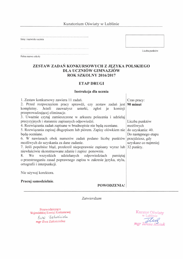 Kuratorium Odwiaty w Lublinie Liczba punkt6w ZESTAW ZADAN KONKURSOWYCHZ J\ZYKA POLSKTEGO DLA UCZNIOW GIMNAZJOW ROK SZKOLNY 2016/2017 ETAP DRUGI Instrukcja dla ucznia l. Zestaw konkursowy zawiera ll zadai. Czas pracy: 2. Pned rozpoczgciem pracy sprawd2, czy zestaw zadari jest 90 minut kompletny. Je2eli zj;uwazysz usterki, zglos je komisji przeprowadzaj4cej inacje. zamieszczone w arkuszu polecenia udzielaj precyzyjnych i starannie zapisanych odpowiedzi. 4. Rozwi4zania zadari zapisane w brudnopisie nie bgd4 oceniane. 5. Rozwi4zania zapisuj dfugopisem lub pi6rem. Zapisy ol6wkiem nie bgd4 oceniane. 6. W nawiasach obok numer6w zadah podano liczbg punkt6w moZliwych do uzyskania za dane zadanie. 7. JeSli popelnisz bl4d, przekreSl niepoprawnie zapisany wyraz lub niewlaSciwie skonstruowane zdanie i zapisz ponownie. wszystkich udzielanych odpowiedziach pamigtaj przestrzeganiu o zasad poprawnego zapisu w zakresie jgzyka, stylu, ortografii i interpunkcj i. el im i 3. Uwa2nie czytaj Liczba punkt6w mo2liwych do uzyskania: 40. Do nastgpnego etapu przejdziesz, gdy uzyskasz co najmniej 32 punkty. 8. We Nie uzywaj korektora. Pracuj samodzielnie. POWODZENIA! Zatwierdzam Przewodnicz4cz Wr.jewodzkicl Kornisii Korkunclvej t*a 'tra'&'q'u'eI^ mgr Ewe Ztko!cielna Kurrl,.- ,r.i... ieiv .,fu4 i, I .,i ,,ir: mgr t.1-"-. ,.f tuk Przeczytaj uważnie poniższy tekst, a następnie wykonaj polecenia od 1 do 7. W środku Rynku i po brzegach płynęła rzeka ludzka: tłumy przechadzały się pod łukami bazyliki Juliusza Cezara, tłumy siedziały na schodach Kastora i Polluksa i kręciły się koło świątyńki Westy, podobne na tym wielkim marmurowym tle do różnokolorowych rojów motyli lub żuków. Z góry, przez ogromne stopnie, od strony świątyni poświęconej „Jovi Optimo Maximo”*, napływały nowe fale; przy rostrach słuchano jakichś przygodnych mówców; tu i ówdzie słychać było okrzyki przekupniów sprzedających owoce, wino lub wodę pomieszaną z figowym sokiem, oszustów polecających cudowne lekarstwa, wróżbitów, odgadywaczy ukrytych skarbów, tłumaczów snów. Gdzieniegdzie z gwarem rozmów i nawoływań mieszały się dźwięki sistry, egipskiej sambuki*** lub greckich fletów. Gdzieniegdzie chorzy, pobożni lub stroskani nieśli do świątyń ofiary. Wśród ludzi, na kamiennych płytach, zbierały się chciwe na ofiarne ziarno, podobne do ruchomych, pstrych i ciemnych plam, stadka gołębi, to wzbijając się chwilowo z rozgłośnym szumem skrzydeł w górę, to znów zapadając na opróżnione przez tłum miejsca. Od czasu do czasu gromady ludzkie rozstępowały się przed lektykami, w których widać było wykwintne twarze kobiece lub głowy senatorów i rycerzy, o rysach jakby zakrzepłych i wyniszczonych życiem. Różnojęzyczna ludność powtarzała w głos ich imiona z dodatkiem przezwisk, szyderstw lub pochwał. Między bezładnymi grupami przeciskały się czasem postępujące miarowym krokiem oddziały żołnierzy lub wigilów czuwających nad ulicznym porządkiem. Język grecki dawał się słyszeć naokół równie często, jak łaciński. H. Sienkiewicz, Quo vadis, Warszawa 1973, s. 23-24. * Jowiszowi Najlepszemu Najwyższemu. ** W starożytnym Rzymie: mównica publiczna stojąca na Forum Romanum, ozdobiona dziobami zdobytych okrętów nieprzyjacielskich *** Instrumenty muzyczne. Zadanie 1. (2 p.) Określ cel zastosowania zabiegów stylistycznych w przytoczonych fragmentach narracji. Cytat Gdzieniegdzie z gwarem rozmów i nawoływań mieszały się dźwięki sistry, egipskiej sambuki lub greckich fletów. Gdzieniegdzie chorzy, pobożni lub stroskani nieśli do świątyń ofiary. Wśród ludzi, na kamiennych płytach, zbierały się chciwe na ofiarne ziarno, podobne do ruchomych, pstrych i ciemnych plam, stadka gołębi, to wzbijając się chwilowo z rozgłośnym szumem skrzydeł w górę, to znów zapadając na opróżnione przez tłum miejsca. Nazwa zabiegu stylistycznego w zakresie składni Cel zastosowania Zadanie 2. (2 p.) a) Wypisz z tekstu trzy przykłady przymiotników, które się nie stopniują. (1 p.) ..................................................................................................................................................... b) Od wybranych z tekstu trzech innych przymiotników utwórz pochodne przysłówki. (1 p.) Przysłówek Przymiotnik Zadanie 3. (3 p.) Wyszukaj w tekście po dwa przykłady form czasowników wskazanych w tabeli. Formy podlegające koniugacji Formy nieodmienne (nieosobowe) Formy podlegające deklinacji Zadanie 4. (2 p.) Określ cechy każdej spółgłoski występującej w czasowniku kręciły. Spółgłoska Cechy Zadanie 5. (2 p.) W podanych wyrazach podkreśl sylaby akcentowane. pły-nął pły-nę-li-ście pły- nę-li-byś-my ba-zy-li-ka o-próż-nio-ne czu-wa-ją-cy-mi Zadanie 6. (3 p.) Udowodnij, że wyraz tłum może wystąpić w zdaniu jako dwie różne części mowy. Przykład użycia w zdaniu Nazwa części mowy Forma gramatyczna w zdaniu Funkcja składniowa Zadanie 7. (3 p.) Podaj pełne nazwy wypowiedzeń, którymi posłużył się Henryk Sienkiewicz w poniższych sentencjach. Miłość nie jest całkiem ślepa, ale cierpi na daltonizm. ................................................................................................................................................. Kochanie to niedola ciężka, bo przez nie człek wolny niewolnikiem się staje. .................................................................................................................................................. Szczęście jest zawsze tam, gdzie je człowiek widzi. ................................................................................................................................................. *** Przeczytaj uważnie podany fragment prozy Mirona Białoszewskiego, a następnie wykonaj polecenia od 8 do 10. Ale ludzie latali. Dużo. Mnóstwo. Na Kruczej i na Mokotowskiej było dużo kwater powstańczych i c