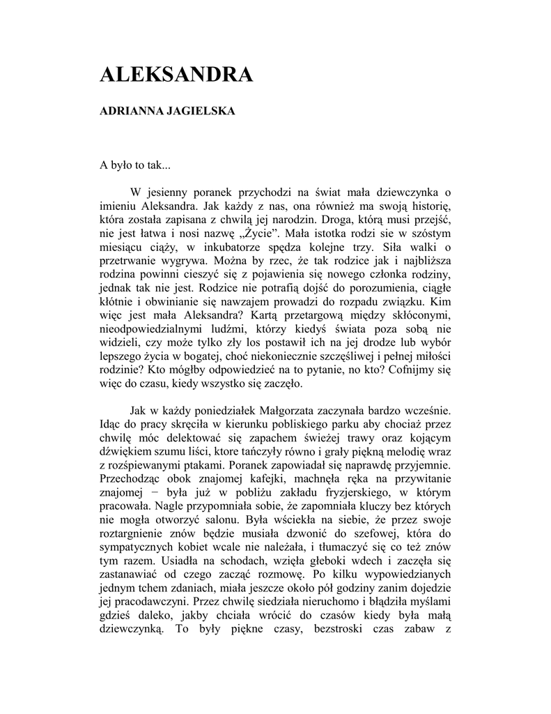 ALEKSANDRA ADRIANNA JAGIELSKA A było to tak... W jesienny poranek przychodzi na świat mała dziewczynka o imieniu Aleksandra. Jak każdy z nas, ona również ma swoją historię, która została zapisana z chwilą jej narodzin. Droga, którą musi przejść, nie jest łatwa i nosi nazwę „Życie”. Mała istotka rodzi sie w szóstym miesiącu ciąży, w inkubatorze spędza kolejne trzy. Siła walki o przetrwanie wygrywa. Można by rzec, że tak rodzice jak i najbliższa rodzina powinni cieszyć się z pojawienia się nowego członka rodziny, jednak tak nie jest. Rodzice nie potrafią dojść do porozumienia, ciągłe kłótnie i obwinianie się nawzajem prowadzi do rozpadu związku. Kim więc jest mała Aleksandra? Kartą przetargową między skłóconymi, nieodpowiedzialnymi ludźmi, którzy kiedyś świata poza sobą nie widzieli, czy może tylko zły los postawił ich na jej drodze lub wybór lepszego życia w bogatej, choć niekoniecznie szczęśliwej i pełnej miłości rodzinie? Kto mógłby odpowiedzieć na to pytanie, no kto? Cofnijmy się więc do czasu, kiedy wszystko się zaczęło. Jak w każdy poniedziałek Małgorzata zaczynała bardzo wcześnie. Idąc do pracy skręciła w kierunku pobliskiego parku aby chociaż przez chwilę móc delektować się zapachem świeżej trawy oraz kojącym dźwiękiem szumu liści, ktore tańczyły równo i grały piękną melodię wraz z rozśpiewanymi ptakami. Poranek zapowiadał się naprawdę przyjemnie. Przechodząc obok znajomej kafejki, machnęła ręka na przywitanie znajomej − była już w pobliżu zakładu fryzjerskiego, w którym pracowała. Nagle przypomniała sobie, że zapomniała kluczy bez których nie mogła otworzyć salonu. Była wściekła na siebie, że przez swoje roztargnienie znów będzie musiała dzwonić do szefowej, która do sympatycznych kobiet wcale nie należała, i tłumaczyć się co też znów tym razem. Usiadła na schodach, wzięła głeboki wdech i zaczęła się zastanawiać od czego zacząć rozmowę. Po kilku wypowiedzianych jednym tchem zdaniach, miała jeszcze około pół godziny zanim dojedzie jej pracodawczyni. Przez chwilę siedziała nieruchomo i błądziła myślami gdzieś daleko, jakby chciała wrócić do czasów kiedy była małą dziewczynką. To były piękne czasy, bezstroski czas zabaw z przyjaciółmi, wyjazdy z rodzicami, sanatoria i siostry, z których każda starała się pomóc kiedy pojawiały się problemy. − Teraz, kiedy ma się 23 lata − pomyślała − nie wszystko wygląda już tak różowo. Starsza siostra o imieniu Anna nie była wychowywana przez biologiczną matkę tylko przez jej teściową. Młodsza z sióstr zawsze była faworyzowana przez rodziców: zdolniejsza, ładniejsza i miała zawsze wszystko czego pragnęła. Nagle klakson samochodu wybudza dziewczynę z letargu. − Czas do roboty − pomyślała. Dzień zaczął się jak każdy inny: stałe klientki, jak codzień. Późnym popołudniem jednak dołączyła do grona zespołu nowa twarz − młoda dziewczyna o imieniu Barbara. Barbara była absolwentką szkoły fryzjerskiej, szukała pracy i przez przypadek trafiła do zakładu fryzjerskiego w którym pracowała Małgorzata. Po kilku tygodniach w zakładzie pojawia się w nowy klient − przystojny mężczyzna o imieniu Michał. To typ mężczyzny, który kocha kobiety, uwielbia je uwodzić i wie, że się im podoba. Jest bratem Barbary. Co dwa tygodnie jest stałym klientem zakładu fryzjerskiego, w którym pracuje Małgorzata. Z pozoru niewinne rozmowy szybko przeradzają się w coś czego pragnie młoda dziewczyna. On zaś wie, że nie jest jej obojętny. Przeszkodą do podjęcia poważniejszych kroków jest narzeczona Michała. Czarnowłosa piękność o zabójczo długich nogach dowiaduje się dlaczego Michał tak chętnie odwiedza salon. Między kochankami dochodzi do coraz częstszych kłótni i nieporozumień. Małgorzata jednak widzi szansę na to, aby zbliżyć się do mężczyzny. Mijają następne trzy miesiące. Miłość zaczyna się rozwijać tak jak przewidywała Małgorzata. Michał zaczął odwzajemniać jej uczucia. Po pół roku spotykania się młodzi postanawiają zapoznać swoich rodziców. Miłość kwitnie a rodzice zaczynają oficjalnie mysleć o tym, aby młodzi zalegalizowali swój zwiazęk. Michał pogodziwszy się z faktem, że Małgorzata ma nieślubną córkę, obiecuje jej, że dołoży starań, aby ona była szczęśliwa a dziecko uzna za swoje. W końcu po roku spotykania się, po roku wspólnych planów na przyszłość, przychodzi dzień ślubu. Biała sukienka, dobrze skrojony garnitur, zaproszeni goście i on, pełen watpliwości, czy dobrze robi. Tak, właśnie on, ten, który jeszcze rok temu nie widział świata poza Ireną − czarnowłosą pięknością. Czas się zatrzymuje w miejscu, kiedy Michał widzi oczami wspomnień właśnie tę w której kiedyś był tak szaleńczo zakochany, a którą porzucił dla lepszego być. Nowy Początek Ślub, wydawać by sie mogło, powinien być zwieńczeniem uczucia dwojga kochających się osób. Michał był tym typem człowieka, który zawsze kochał pieniądze, a ślub miał mu pomóc w dojściu do dużych pieniędzy, tak przynajmniej mu się wydawało. Małgorzatę kochał na swój sposób, ale po wielu miesiącach zauważył, że myślami coraz częściej powraca do czasów kiedy był z Ireną. Ta szaleńcza miłość, połączona z namiętnością, była tym, czego tak naprawdę pragnął mężczyzna − szaleńczej niepochamowanej namiętności; uczucia, które było tak silne, że czasami tracił oddech, kiedy wspominał Irenę. Właśnie po dwóch latach małżeństwa byli kochankowie spotykają się przypadkowo w sklepie. Irena dalej z tym samym uśmiechem na twarzy, on nieco przybity mówi − Witaj! To właśnie spotkanie, ta krótka chwila, zawiśnie niczym ciemna chmura nad znanym nam małżeństwem. Mijają dni, tygodnie i miesiące. Po wielu, niby przypad