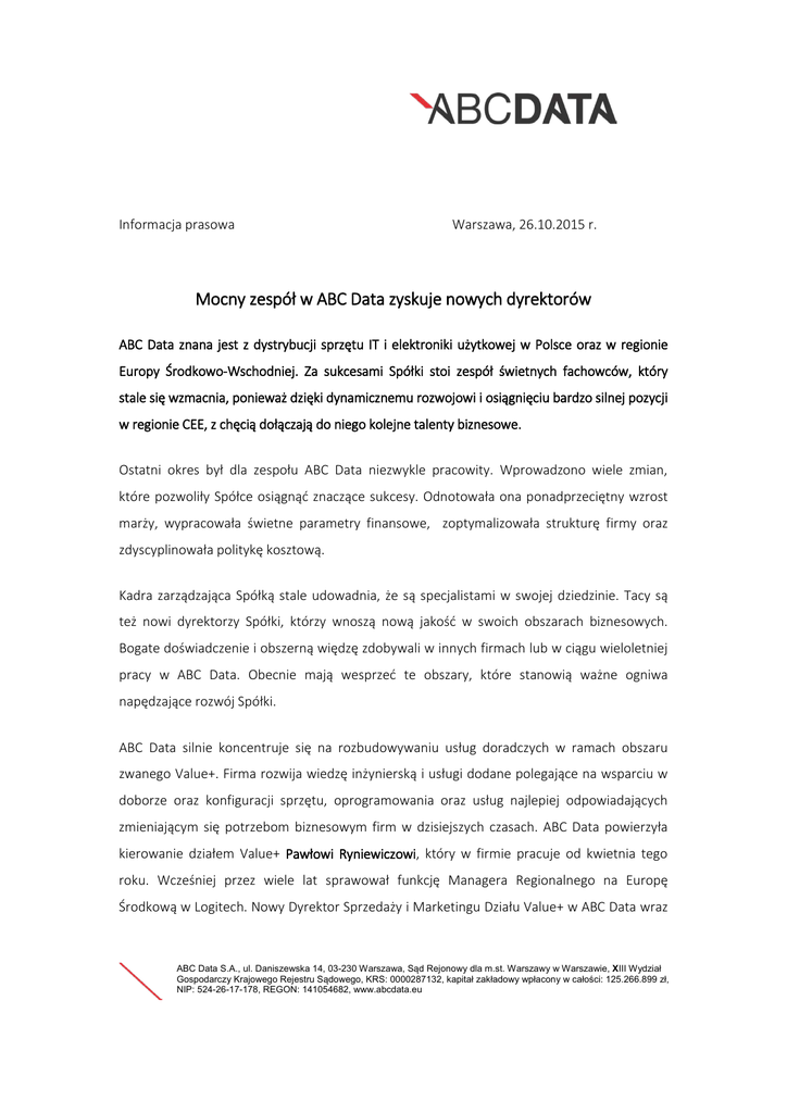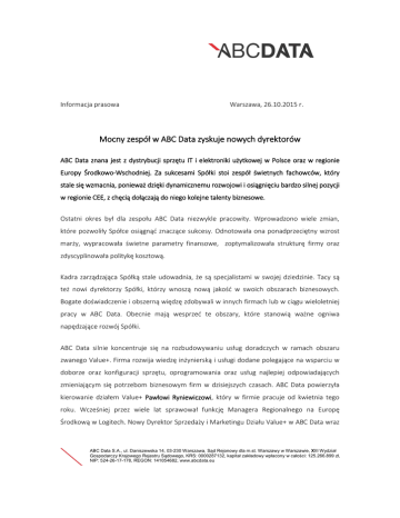 Informacja prasowa Warszawa, 26.10.2015 r. Mocny zespół w ABC Data zyskuje nowych dyrektorów ABC Data znana jest z dystrybucji sprzętu IT i elektroniki użytkowej w Polsce oraz w regionie Europy Środkowo-Wschodniej. Za sukcesami Spółki stoi zespół świetnych fachowców, który stale się wzmacnia, ponieważ dzięki dynamicznemu rozwojowi i osiągnięciu bardzo silnej pozycji w regionie CEE, z chęcią dołączają do niego kolejne talenty biznesowe. Ostatni okres był dla zespołu ABC Data niezwykle pracowity. Wprowadzono wiele zmian, które pozwoliły Spółce osiągnąć znaczące sukcesy. Odnotowała ona ponadprzeciętny wzrost marży, wypracowała świetne parametry finansowe, zoptymalizowała strukturę firmy oraz zdyscyplinowała politykę kosztową. Kadra zarządzająca Spółką stale udowadnia, że są specjalistami w swojej dziedzinie. Tacy są też nowi dyrektorzy Spółki, którzy wnoszą nową jakość w swoich obszarach biznesowych. Bogate doświadczenie i obszerną więdzę zdobywali w innych firmach lub w ciągu wieloletniej pracy w ABC Data. Obecnie mają wesprzeć te obszary, które stanowią ważne ogniwa napędzające rozwój Spółki. ABC Data silnie koncentruje się na rozbudowywaniu usług doradczych w ramach obszaru zwanego Value+. Firma rozwija wiedzę inżynierską i usługi dodane polegające na wsparciu w doborze oraz konfiguracji sprzętu, oprogramowania oraz usług najlepiej odpowiadających zmieniającym się potrzebom biznesowym firm w dzisiejszych czasach. ABC Data powierzyła kierowanie działem Value+ Pawłowi Ryniewiczowi, który w firmie pracuje od kwietnia tego roku. Wcześniej przez wiele lat sprawował funkcję Managera Regionalnego na Europę Środkową w Logitech. Nowy Dyrektor Sprzedaży i Marketingu Działu Value+ w ABC Data wraz ABC Data S.A., ul. Daniszewska 14, 03-230 Warszawa, Sąd Rejonowy dla m.st. Warszawy w Warszawie, XIII Wydział Gospodarczy Krajowego Rejestru Sądowego, KRS: 0000287132, kapitał zakładowy wpłacony w całości: 125.266.899 zł, NIP: 524-26-17-178, REGON: 141054682, www.abcdata.eu ze swoim zespołem ma sprawić, że Spółka stanie się dostawcą kompleksowych rozwiązań z zakresu ICT, m.in. w obszarze surveillance, bezpieczeństwa i usług w chmurze. Zajmuje się też rozwojem programu edukacji partnerów oraz klientów końcowych w tym obszarze. ABC Data wzmacnia również obszar sprzedaży w sektorze mobile. Objęcie przez Macieja Jarmińskiego w kwietniu 2015 roku funkcji Dyrektora Działu Mobile ma zapewnić Spółce dynamiczny rozwój na tym polu. Do ABC Data przeszedł z firmy Action, w której pracował przez 5 lat na stanowisku Dyrektora Działu Obsługi Rynku Telekomunikacyjnego. W ABC Data jako cel swojej pracy obrał konsolidację dystrybucji marek GSM poprzez wykorzystanie zasięgu i potencjału Spółki działającej aż na 8 rynkach regionu CEE i wejście we współpracę z producentami w całej Europie Środkowo-Wschodniej. Jego zadaniem jest również wsparcie marek GSM na rynku polskim, obsługa klientów z sektora telekomunikacyjnego oraz rozwój grup i linii produktowych z szeroko rozumianej kategorii Internetu Rzeczy, w tym produktów typu „smart” – już dostępne sa pierwsze produkty z kategorii smart-fit, a wkrótce również z health i home. Dla spółki bardzo ważny jest również rozwój sprzedaży produktów z kategorii RTV i AGD, którą w maju 2015 roku przejął Artur Rzysko. Wcześniej pracował w Media Expert TERG S.A. na stanowiskach m.in. Zastępcy Dyrektora Generalnego oraz Dyrektora Sprzedaży. W ABC Data, poza zwiększaniem udziałów rynkowych w sprzedaży produktów RTV i AGD w Polsce oraz CEE, planuje stworzyć siatkę sklepów partnerskich z sektora małych i średnich przedsiębiorstw, poszerzyć portfolio produktów oraz listę firm partnerskich wśród dostawców oraz odbiorców. Jego celem jest prowadzenie klarownej polityki sprzedaży dla wszystkich kanałów dystrybucji. Radosław Góralczyk w lipcu 2015 roku został Dyrektorem Handlowym i odpowiada za rozwój sprzedaży do małych i średnich partnerów, klientów e-commerce, klientów korporacyjnych oraz sieci detalicznych. Od 9 lat jest związany z ABC Datą. Poprzednio pełnił rolę Menadżera Sprzedaży. Jest absolwentem Wyższej Szkoły Stosowanej i Zarządzania oraz Szkoły Głównej ABC Data S.A., ul. Daniszewska 14, 03-230 Warszawa, Sąd Rejonowy dla m.st. Warszawy w Warszawie, XIII Wydział Gospodarczy Krajowego Rejestru Sądowego, KRS: 0000287132, kapitał zakładowy wpłacony w całości: 125.266.899 zł, NIP: 524-26-17-178, REGON: 141054682, www.abcdata.eu Handlowej. Pracuje nad stałym wzrostem satysfakcji klientów. Cel ten chce osiągnąć poprzez poszerzanie oferty produktowej, podniesienie jakości obsługi oraz rozwijanie korzystnych ofert współpracy. Planuje też szereg działań handlowych, które pozwolą Spółce umocnić się na pozycji lidera na rynku dystrybucji. Wojciech Mayer jest związany z branżą IT od 2007 roku. Pracował wcześniej m.in. dla firmy Komputronik S.A. oraz Komputronik Biznes Sp. z o.o. koncentrując się na budowaniu długofalowych relacji z klientami. Jest ekspertem w zakresie rozwiązań serwerowych, pamięci masowych, wirtualizacji, jak również technologii wykorzystywanych do tworzenia kopii zapasowych i archiwizacji danych. W ABC Data odpowiada za budowanie, wdrażanie i realizację strategii sprzedaży projektowej skierowanej do największych partnerów. Powierzony Wojciechowi Mayerowi Dział Sprzedaży Projektowej ma na celu zapewnienie najwyższej jakości obsługi integratorów i resellerów na każdym etapie realizowanego projektu. Wspólnie z zespołem doświadczonych Key Account Managerów wspieranych przez stacjonarny dział sprzedaży zapewnią komplementarne wsparcie we wszystkich rejonach kraju. Znaczny potencjał rynku zaawansowanych technologii daje możliwość rozwoju w obszarze sprzedaży kompleksowych rozwiązań z wartością doda