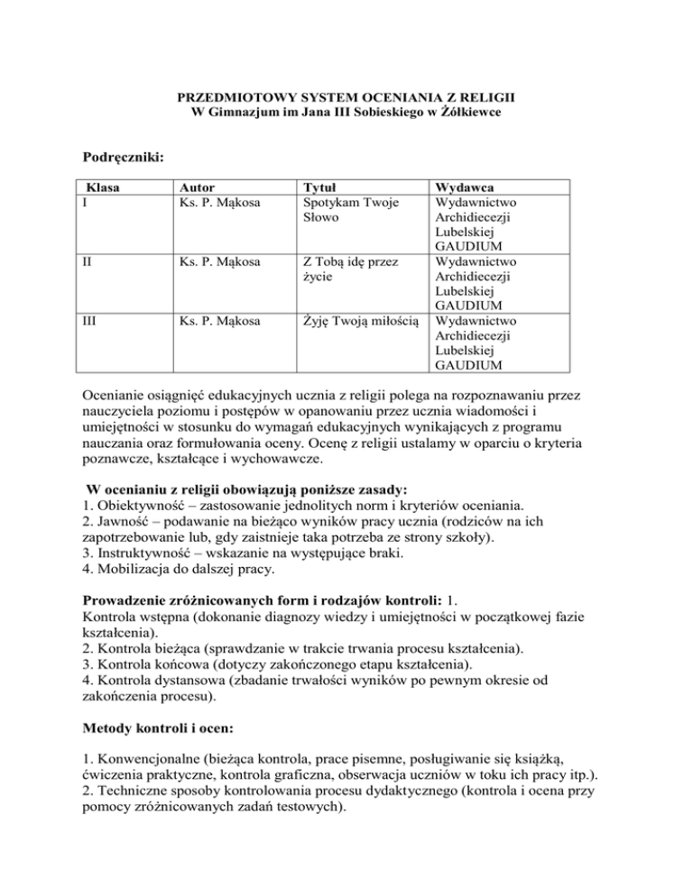 PRZEDMIOTOWY SYSTEM OCENIANIA Z RELIGII W Gimnazjum im Jana III Sobieskiego w Żółkiewce Podręczniki: Klasa I Autor Ks. P. Mąkosa Tytuł Spotykam Twoje Słowo II Ks. P. Mąkosa Z Tobą idę przez życie III Ks. P. Mąkosa Żyję Twoją miłością Wydawca Wydawnictwo Archidiecezji Lubelskiej GAUDIUM Wydawnictwo Archidiecezji Lubelskiej GAUDIUM Wydawnictwo Archidiecezji Lubelskiej GAUDIUM Ocenianie osiągnięć edukacyjnych ucznia z religii polega na rozpoznawaniu przez nauczyciela poziomu i postępów w opanowaniu przez ucznia wiadomości i umiejętności w stosunku do wymagań edukacyjnych wynikających z programu nauczania oraz formułowania oceny. Ocenę z religii ustalamy w oparciu o kryteria poznawcze, kształcące i wychowawcze. W ocenianiu z religii obowiązują poniższe zasady: 1. Obiektywność – zastosowanie jednolitych norm i kryteriów oceniania. 2. Jawność – podawanie na bieżąco wyników pracy ucznia (rodziców na ich zapotrzebowanie lub, gdy zaistnieje taka potrzeba ze strony szkoły). 3. Instruktywność – wskazanie na występujące braki. 4. Mobilizacja do dalszej pracy. Prowadzenie zróżnicowanych form i rodzajów kontroli: 1. Kontrola wstępna (dokonanie diagnozy wiedzy i umiejętności w początkowej fazie kształcenia). 2. Kontrola bieżąca (sprawdzanie w trakcie trwania procesu kształcenia). 3. Kontrola końcowa (dotyczy zakończonego etapu kształcenia). 4. Kontrola dystansowa (zbadanie trwałości wyników po pewnym okresie od zakończenia procesu). Metody kontroli i ocen: 1. Konwencjonalne (bieżąca kontrola, prace pisemne, posługiwanie się książką, ćwiczenia praktyczne, kontrola graficzna, obserwacja uczniów w toku ich pracy itp.). 2. Techniczne sposoby kontrolowania procesu dydaktycznego (kontrola i ocena przy pomocy zróżnicowanych zadań testowych). Elementy wchodzące w zakres oceny z religii: 1. Ilość i jakość prezentowanych wiadomości. 2. Zainteresowanie przedmiotem. 3. Stosunek do przedmiotu. 4. Pilność i systematyczność. 5. Umiejętność zastosowania poznanych wiadomości w życiu. 6. Postawa. Kontrola i ocena w religii nie dotyczy wyłącznie sprawdzenia wiadomości, lecz także wartościowania umiejętności, postaw, zdolności twórczych, rozwoju zainteresowań, motywacji uczenia się, a głównie kształtowania cech charakteru, woli, odpowiedzialności za swoje czyny, dokładności, wytrwałości, pracowitości, kultury osobistej, zgodności postępowania z przyjętą wiarą. Ocenianie ma na celu: a) informowanie ucznia o poziomie jego osiągnięć edukacyjnych, b) motywowanie ucznia do dalszej pracy, c) pomaganie uczniowi w samodzielnym planowaniu jego rozwoju, d) systematyczne informowanie rodziców (prawnych opiekunów) o postępach, trudnościach i specjalnych uzdolnieniach ucznia. Ocenie podlegają: Pisemne prace kontrolne dwa razy w ciągu semestru, obejmujące więcej niż trzy jednostki lekcyjne, zapowiedziane z co najmniej tygodniowym wyprzedzeniem, sprawdzane przez nauczyciela do dwóch tygodni. Ponadto kartkówki; zakres ich materiału powinien obejmować nie więcej niż trzy jednostki lekcyjne lub materiał podstawowy. Pisemne prace kontrolne są do wglądu uczniów, a rodziców na ich zapotrzebowanie. Nauczyciel ma prawo do niepodawania terminu prac kontrolnych, jeżeli uczniowie dezorganizują proces oceny osiągnięć przez absencję, ucieczki z lekcji itp. Podczas oceniania sprawdzianów, kartkówek i prac punktowanych stosuje się następujące przeliczenia na oceny: Powyżej 100% - celujący 100% - 95% - bardzo dobry 94% - 75% - dobry 74% - 51% - dostateczny 50% - 33% - dopuszczający 32% - 0% - niedostateczny 1. Odpowiedzi ustne dotyczące materiału z zakresu trzech ostatnich lekcji. 2. Wypowiedzi w trakcie lekcji, podczas dyskusji, powtórzenia itp. 3. Praca domowa: krótkoterminowa i długoterminowa, kontrolowana na bieżąco. 4. Ocena ze znajomości podstawowych prawd wiary zdobywana podczas odpowiedzi ustnej lub pisemnej. 5. Zeszyt: sprawdzany podczas odpowiedzi i według decyzji nauczyciela. Jeden raz w semestrze kompleksowa ocena zeszytu. 6. Pilność, systematyczność, postawy, umiejętności: osiągnięcia ucznia zapisywane w kartach obserwacyjnych prowadzonych przez nauczyciela religii. 7. Przygotowanie do poszczególnych katechez. 8. Korzystanie z Pisma Świętego, podręcznika i innych materiałów katechetycznych. 9. Zaangażowanie w przygotowanie i przeprowadzenie uroczystości szkolnych o charakterze religijnym, zaangażowanie w przygotowanie gazetek szkolnych, udział w konkursach religijnych, współpraca ze wspólnotą parafialną. 11. Inne możliwości wskazujące możliwość oceniania. Ilość ocen: W ciągu jednego semestru nauczyciel wystawia każdemu uczniowi co najmniej trzy oceny cząstkowe. Poprawianie: Promuje się systematyczne ocenianie w ciągu semestrów połączone z możliwością poprawiania ocen. W wyjątkowych uzasadnionych sytuacjach poprawianie może odbywać się bezpośrednio przed wystawianiem oceny semestralnej lub końcoworocznej. Przeprowadza się je według ustaleń osób zainteresowanych w terminie i z zakresu wskazanego przez nauczyciela religii z zastosowaniem formy pisemnej lub ustnej. Klasyfikacja: Uczeń może być niesklasyfikowany z religii, jeżeli brak podstaw do ustalenia oceny klasyfikacyjnej z powodu jego nieobecności na zajęciach edukacyjnych przekraczającej połowę czasu przeznaczonego na te zajęcia w szkolnym planie edukacji. Uczeń niesklasyfikowany z powodu usprawiedliwionej nieobecności może zdawać egzamin klasyfikacyjny. Ocena nie będzie miała charakteru średniej arytmetycznej ocen cząstkowych; znaczący wpływ mają przede wszystkim oceny uzyskane (w semestrze lub w ciągu całego roku szkolnego) z prac kontrolnych, dłuższych wypowiedzi, referatów, o ile prezentacja ich przejmie formę wypowiedzi ustnej oraz innych form pracy o charakterze samodzielnym. Uczeń, który przystąpi do olimpiady czy konkursu religijne