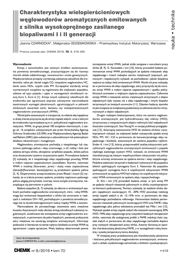 Joanna CZARNOCKA*, Małgorzata ODZIEMKOWSKA – Przemysłowy Instytut Motoryzacji, Warszawa Prosimy cytować jako: CHEMIK 2016, 70, 8, 419–425 Wprowadzenie Emisja z samochodów jest istotnym źródłem zanieczyszczenia powietrza atmosferycznego, przyczyniającym się do rozwoju chorób układu oddechowego, nowotworów i zmian genetycznych. Międzynarodowe przepisy wyróżniają substancje szkodliwe dla środowiska, takie jak: tlenek węgla CO, niespalone węglowodory HC, tlenki azotu NOx, cząstki stałe PM. Europejskie standardy emisji wymienionych związków są regulowane dla większości pojazdów, zależne od typu pojazdu i ujęte w wymaganiach określanych nazwą Euro 5, Euro 6 [1]. Emisja innych substancji szkodliwych dla środowiska jest ograniczana poprzez sukcesywne wprowadzanie zaostrzonych wymagań jakościowych, ograniczających w paliwach silnikowych zawartość siarki, benzenu czy wielopierścieniowych węglowodorów aromatycznych (WWA). Wśród paliw stosowanych w transporcie, to właśnie olej napędowy w dużej mierze przyczynia się do emisji cząstek stałych, wraz z którymi do środowiska wprowadzane są m.in. policykliczne węglowodory aromatyczne. WWA, to grupa ponad 100 związków chemicznych, z czego ok. 16 związków wskazywanych jest przez Amerykańską Agencję Ochrony Środowiska (US EPA) oraz Międzynarodową Agencję Badań nad Rakiem (IARC) jako substancje o udowodnionym lub potencjalnym działaniu rakotwórczym i mutagennym. Węglowodory aromatyczne pochodzą z niespalonego lub częściowo spalonego paliwa i oleju smarowego, a ich rodzaj i ilość jest zależna od typu silnika, obciążenia i prędkości pojazdu, składu paliwa oraz skuteczności systemu oczyszczania spalin. Prowadzone badania [2] wykazały, że z niespalonego oleju napędowego powstają WWA o małym ciężarze cząsteczkowym (acenaftalen, fluoren), natomiast WWA o średniej (fluoranten, piren) i dużej masie cząsteczkowej (benzo[b]fluoranten, benzo[a]piren) są produktami spalania paliwa [3, 4]. Eksperymenty przeprowadzone przez Rhead i innych [5] wykazały, że w trakcie procesu spalania, produkty częściowo spalonego paliwa ulegają piorsyntezie, tworząc nowe związki aromatyczne, nieznajdujące się pierwotnie w paliwie. Badania zespołów [6, 7] wykazały, że obecne w emitowanych spalinach pochodne węglowodorów aromatycznych, nitro- i oksy-WWA, mogą być emitowane bezpośrednio z silnika lub utworzone w reakcjach z rodnikami OH i NO3 pochodzącymi z powietrza atmosferycznego lub na skutek heterogenicznych reakcji między WWA a ozonem. Wprowadzone do powszechnego stosowania estry metylowe kwasów tłuszczowych miały obniżać emisję szkodliwych substancji regulowanych, oczekiwano też zmniejszenia emisji węglowodorów aromatycznych, w porównaniu do paliw kopalnych, ponieważ praktycznie estry metylowe nie zawierają związków aromatycznych. Informacje podawane w literaturze na temat wpływu biodiesla na emisje WWA są ograniczone i często sprzeczne. Wielu badaczy obserwowało pewne Autor do korespondencji: Joanna CZARNOCKA, e-mail: [email protected] nr 8/2016 • tom 70 zmniejszenie emisji WWA, jednak ściśle związane z warunkami pracy silnika [8, 9]. G. Karavalakis i inni [10], którzy prowadzili badania porównawcze emisji WWA pochodzących ze spalania mieszanek oleju napędowego i trzech rodzajów estrów metylowych (sojowych, palmowych i rzepakowych) wykazali, że pochodzenie i jakość biopaliwa wpływa na rodzaj i ilość emitowanych WWA. Wyniki ich prac wskazały, że w porównaniu do oleju napędowego, estry przyczyniły się do wzrostu emisji WWA o małym ciężarze cząsteczkowym i spadku policyklicznych aromatów o większym ciężarze cząsteczkowym. Całkowite emisje WWA z mieszanek estrów metylowych otrzymanych z olejów odpadowych były wyższe niż z oleju napędowego i innych biopaliw otrzymanych ze świeżych surowców [11]. Zdaniem badaczy zjawisko to jest związane ze zwiększoną podatnością na utlenianie estrów otrzymywanych z olejów odpadowych. Drugim rodzajem biokomponentu, który nie zawiera węglowodorów aromatycznych, jest hydrorafinowany olej roślinny (HVO), otrzymywany z niespożywczych olejów roślinnych lub/i odpadowych tłuszczów zwierzęcych. Soo-Young N. w swojej publikacji przeglądowej [12], dotyczącej zastosowania HVO do zasilania silników wysokoprężnych wskazał, że większość badań wykazywała spadek emisji NOx, PM, HC i CO w porównaniu do konwencjonalnego oleju napędowego i biodiesla, stosowanych do zasilania pojazdów ciężkich. Sinder A. i inni [13], którzy przeprowadzili analizę toksyczności policyklicznych węglowodorów aromatycznych emitowanych z pojazdu ciężkiego zasilanego czystym HVO, wykazali, że emitowane WWA charakteryzują się niższym współczynnikiem toksyczności niż policykliczne aromaty emitowane ze spalania estrów i oleju napędowego. Podobne zależności otrzymali w badaniach wykonanych dla pojazdów lekkich spełniających wymagania Euro 3. Natomiast dla pojazdów spełniających wymagania Euro 6 współczynnik toksyczności WWA emitowanych ze spalania HVO był większy niż współczynnik toksyczności WWA emitowanych ze spalania oleju ropopochodnego. D. Kim i inni [14] prowadzili badania emisji, w tym emisji PM ze spalania różnych mieszanek paliwowych w silniku wysokoprężnym na hamowni podwoziowej. Pomiary wykazały, że zasilanie silnika olejem napędowym zawierającym 10…30% HVO powoduje redukcję emisji cząstek stałych o ok. 12–15% m/m, w porównaniu do oleju napędowego pochodzenia naftowego. Hamowniane badania porównawcze mieszanek paliwowych zawierających HVO oraz FAME i oleju napędowego jako paliwa odniesienia prowadzili też Millo i inni [15]. Wykazali spadek emisji cząstek stałych dla mieszanki zawierającej 30% HVO i 70% oleju napędowego przy wszystkich badanych obciążeniach silnika, natomiast dla analogicznej próbki z FAME redukcja ilości cząst