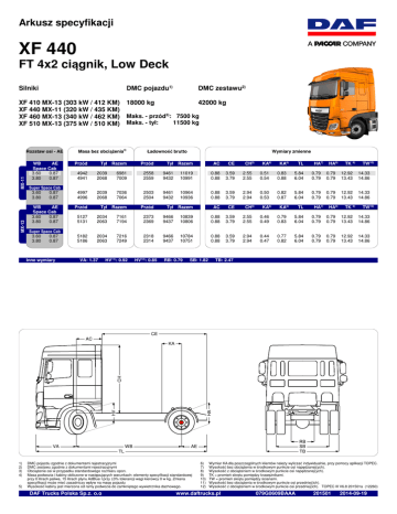 Arkusz specyfikacji XF 440 FT 4x2 ciągnik, Low Deck Silniki DMC pojazdu1) DMC zestawu2) XF 410 MX-13 (303 kW / 412 KM) XF 440 MX-11 (320 kW / 435 KM) XF 460 MX-13 (340 kW / 462 KM) XF 510 MX-13 (375 kW / 510 KM) 18000 kg 42000 kg MX-13 MX-11 Rozstaw osi - AE WB AE Space Cab 3.60 0.87 3.80 0.87 Super Space Cab 3.60 0.87 3.80 0.87 WB AE Space Cab 3.60 0.87 3.80 0.87 Super Space Cab 3.60 0.87 3.80 0.87 Inne wymiary Maks. - przód3): 7500 kg Maks. - tył: 11500 kg Masa bez obciążenia4) Przód Tył Razem Ładowność brutto Przód Wymiary zmienne Tył Razem AC CE CH5) KA6) KA6) TL HA7) HA8) TK 9) TW10) 4942 4941 2039 2068 6981 7009 2558 2559 9461 9432 11019 10991 0.88 0.88 3.59 3.79 2.55 2.55 0.51 0.54 0.83 0.88 5.84 6.04 0.79 0.79 0.79 0.79 12.92 13.43 14.33 14.86 4997 4996 2039 2068 7036 7064 2503 2504 9461 9432 10964 10936 0.88 0.88 3.59 3.79 2.94 2.94 0.50 0.53 0.82 0.87 5.84 6.04 0.79 0.79 0.79 0.79 12.92 13.43 14.33 14.86 Tył Razem Przód Tył Razem AC CE Przód CH5) KA6) KA6) TL HA7) HA8) TK 9) TW10) 5127 5131 2034 2063 7161 7194 2373 2369 9466 9437 10839 10806 0.88 0.88 3.59 3.79 2.55 2.55 0.46 0.49 0.79 0.83 5.84 6.04 0.79 0.79 0.79 0.79 12.92 13.43 14.33 14.86 5182 5186 2034 2063 7216 7249 2318 2314 9466 9437 10784 10751 0.88 0.88 3.59 3.79 2.94 2.94 0.44 0.47 0.77 0.82 5.84 6.04 0.79 0.79 0.79 0.79 12.92 13.43 14.33 14.86 VA: 1.37 HV11): 0.92 HV12): 0.85 RB: 0.79 SB: 1.82 TB: 2.47 CE AC HA HV CH KA VA WB RB SB TB AE TL 1) 2) 3) 4) 5) DMC pojazdu zgodnie z dokumentami rejestracyjnymi DMC zestawu zgodnie z dokumentami rejestracyjnymi Obciążenie osi w przypadku standardowego rozmiaru opon. Masa podwozia i kabiny obliczone w następujących warunkach: elementy specyfikacji standardowej przy 0 litrach paliwa, 15 litrach płynu AdBlue I przy ±3% tolerancji wagi kierowcy 0 w kg. Zmiana specyfikacji może mieć zasadniczy wpływ na masę pojazdu Wysokość kabiny jest mierzona od ramy podwozia do zamkniętego wywietrznika dachowego. DAF Trucks Polska Sp.z. o.o 6) 7) 8) 9) 10) 11) 12) Wymiar KA dla poszczególnych klientów należy wyliczać indywidualnie, przy pomocy aplikacji TOPEC. Wysokość bez obciążenia w środkowym punkcie osi napędzanej(ych). Wysokość z obciążeniem w środkowym punkcie osi napędzanej(ych). TK = promień skrętu pomiędzy krawężnikami. TW = promień skrętu pomiędzy ścianami. Wysokość bez obciążenia w środkowym punkcie osi przedniej(ich). Wysokość z obciążeniem w środkowym punkcie osi przedniej(ich). TOPEC III V6.8 201501a (12260) www.daftrucks.pl 079G0609BAAA 201501 2014-09-19 XF 440 FT 4x2 ciągnik, Low Deck Kabina z zewnątrz Kabina Space Cab ze zderzakiem z ocynkowanej stali, barwioną szybą oraz elektrycznie sterowanymi szybami bocznymi. Lusterka główne i szerokokątne ogrzewane elektrycznie. Szerokość kabiny 2490 mm; Mechaniczne zawieszenie kabiny; Centralny zamek drzwiowy, 2 kluczyki; Lusterko przednie; Światła do jazdy dziennej LED; Teleskopowa myjka i skrobaczka do szyb. Opcjonalnie: • Comfort Cab • Światła Skylights • Super Space Cab • Drabina aluminiowa 1-częściowa • Pneum. zawiesz. kabiny • Drabina aluminiowa 2-częściowa • Reflektory przednie LED Aerodynamika Opcjonalnie: • Uchwyt do regulacji spojlera dachowego • Osłony boczne • RóŜne typy spoilerów dachowych i ich mocowania Kolory Kolor kabiny H3279 biały opalizujący; Panel reflekt. przedn. i zderzak: Brilliant White; C4P500GRY Podwozie w kolorze szarym. Opcjonalnie: • Osłony lusterek w kolorze nadwozia • Kolory kabiny i podwozia - patrz katalog kolorów Wnętrze kabiny Fotel kierowcy: Comfort Air; Fotel zmiennika: podstawowy; Szklany wywietrznik dachowy, elektr. sterowanie; Dolna leŜanka bez szuflady; LeŜanka górna do przechowywania bagaŜu; Dodatkowa nagrzewnica kabiny (powietrze); Filtr przeciwpyłkowy; Klimatyzacja. Opcjonalnie: • Podusz. pow. (kierowcy) i 2 napin. • Lodówka pasów bezp. • Dodatkowa nagrzewnica kabiny • Kierownica, czarna skóra (wodna) • Dolna leŜanka z szufladą o poj. 65 l • Bez nagrzewnicy dodatkowej kabiny • LeŜanka górna • RóŜne typy siedzeń kierowcy i • Bez górnej leŜanki zmiennika Komunikacja i zarządzanie inf. dotyczącymi jazdy Tachograf cyfrowy, Stoneridge; Bezwzględne ustaw. ogranicznika prędkości 85 km/h; Anteny: AM/FM, 2x GSM, GPS; Tempomat; Asystent wydajności kierowcy. Opcjonalnie: • Przygotowanie dla Maut • Tempomat adaptacyjny (ACC) z • RóŜni producenci i typy wyposaŜenia układem FCW audio • Tempomat adaptacyjny z FCW i • Telefon TruckPhone AEBS Bezpieczeństwo i ochrona Podstawowy układ immobilizera silnika. Opcjonalnie: • Wyłącznik główny z drugim przeł. w kabinie • Układ ostrzegania o opuszczeniu pasa ruchu • Układ kamery przedniej • Układ kamer bocznych • Sygnał ostrzegawczy cofania • RóŜne klasy przepisów bezpieczeństwa EC-ADR Zawieszenie i osie Tył: 11,50 t, zawieszenie pneumatyczne, SR1344. Opcjonalnie: • Pneumatyczne resory przednie • Oś tylna SR1347 Koła i opony Oś przednia 1: 315/60R22.5; Oś tylna 1: 295/60R22.5; Stalowe obręcze kół, srebrnoszare; Srebrnoszare pierścienie ochronne kół. Opcjonalnie: • Alu. koła tarczowe – Alcoa, otwory • RóŜni producenci i typy opon mont. 32 mm Układ napędowy MX-11, 6-cylindrowy silnik wysokopręŜny o pojemności 10,8 l. Moc 320 kW (435 KM) przy 1450–1700 obr./min, maks. moment obrotowy 2100 Nm przy 1000–1450 obr./min; Emisja spalin Euro 6; Wył. silnika pracującego na obrotach jałowych; Ręczna skrzynia biegów, 12 biegów; PrzełoŜenie skrzyni biegów 15,57-1,00; PrzełoŜenie osi tylnej 2,38; ASR. Opcjonalnie: • Skrzynia biegów AS Tronic, 12 • Ręczna skrzynia biegów, 16 biegów biegów • Nadbieg skrzyni biegów • Skrzynia biegów AS Tronic, 16 biegów Układ hamulcowy Hamulec wydechowy; Sterowanie hamulcem postojowym + pozycja testowa; Wentylowane hamulce tarczowe na osi przedniej i tylnej. Dwuobwodowy układ spręŜonego powietr