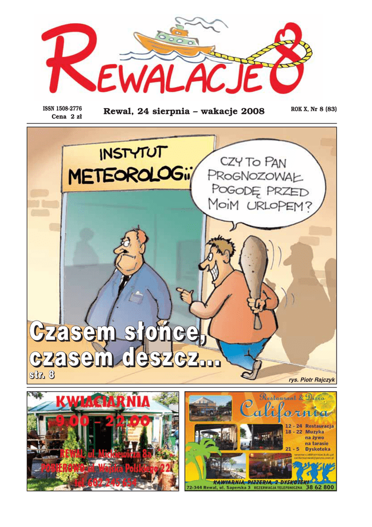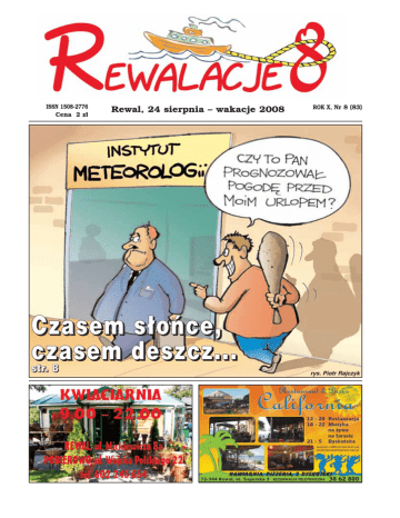 ISSN 1508-2776 Cena 2 zł Rewal, 24 sierpnia – wakacje 2008 Czasem słońce, cstr.z8a s e m d e s z c z . . . ROK X, Nr 8 (83) rys. Piotr Rajczyk CO SŁYCHAĆ? Oddajemy w Wasze ręce ósmy, ostatni już w tym roku numer „Rewalacji”. Mamy nadzieję, że docenicie nasze starania, aby ten tygodnik był najlepszym z dotąd wydanych. W tych „Rewalacjach” znajdziecie podsumowanie sezonu wśród sprzedawców, hotelarzy, jak i ratowników. Nie zabrakło też wywiadu z wójtem, Robertem Skraburskim i relacji z budowy CRM-u w Niechorzu. Z okazji jubileuszu „Potęgi Prasy” (spotykamy się z Wami już dziesiąty rok!) poczytacie o tym, jak obóz rozwijał się w miarę upływu lat. Mamy dla Was także porady zdrowotne i felietony naszych dziennikarzy. Żegnamy się już z Wami, ale nie na długo. Następne wydanie „Rewalacji” już w lipcu... Hejka! Słuchajcie Rewalstacji na 99,2 FM lub w internecie na stronie www.potegaprasy.pl. REDAKTOR NACZELNY DAMIAN MACIĄG (VEL MADEJA) W numerze: - Szach-mat str. 3 - Wywiad z wójtem str. 4 - 10-lecie obozu „Potęga Prasy“ str. 5 - Sezon na kreskę str. 10 - Nie udawać Greka str. 11 KIT (Krótkie Informacje Tekstowe) Mozart w Trzęsaczu Koncert muzyki Wolfganga Amadeusza Mozarta odbędzie się 24 sierpnia o godzinie 18.00 w Trzęsaczu w Kościele pod wezwaniem Miłosierdzia Bożego. Wydarzenie jest jednym z cyklu „Projekt Mozart” odbywającego się od pięciu lat w całej Polsce. Tegoroczne 17 koncertów rozpoczyna się w Trzęsaczu a zakończy – 27 października w Koszalinie. Stowarzyszenie „Mozart 2003” występuje pod batutą Szymona Wyrzykowskiego. Tegoroczna edycja cyklu odbywa się pod hasłem „Veri Sancte Spiritus”, czyli Przybądź Duchu Święty. Drugie miejsce dla Rewala Gmina Rewal jest na drugim miejscu w konkursie smsowym Lata z Radiem. Możemy to zawdzięczać turystom i mieszkańcom tej miejscowości, którzy oddawali swoje głosy. W tym roku w ramach akcji Programu Pierwszego Polskiego Radia S.A. wybierany jest Magiczny Człowiek. Gminę Rewal reprezentuje Tomasz Stolz, autor fotorelacji pogodowych na portalu Rewal. pl. Konkurs, w którym można wygrać Zakończenie Dni Wybrzeża Rewalskiego Uroczyste zakończenie Dni Wybrzeża Rewalskiego odbędzie się w najbliższą sobotę 25 sierpnia. Na deskach amfiteatru wystąpią: kabaret „Pod Spodem”, „Big Cyc” i zespół „. Kowalski” znany z utworu „Irlandia Zielona”. Zapraszamy wszystkich do amfiteatru na godzinę 18.30 na finał Dni Wybrzeża Rewalskiego 2007 w Strefie Słońca. W programie losowanie cennych nagród. Zielono i śmiesznie 20 sierpnia rewalski amfiteatr zorganizował mini – maraton filmowy. O godzinie 20.45 został wyświetlony hit ostatnich miesięcy „Shrek Trzeci”, natomiast o godzinie 22.30, organizatorzy zaproponowali widzom coś polskiego, a mianowicie „Testosteron”. Oba filmy cieszyły się dość sporą oglądalnością. Kalendarium imprez 20-30 sierpień – XII Międzynarodowy Festiwal Szachowy „Konik Morski Rewal 2007” w ramach Caissa Baltic Pol Tour Barlinek, Ostróda, Rewal, Zielona Góra 25 sierpień – Lambda Beach – turniej siatkówki plażowych trójek, Pustkowo Redaktor naczelny: Damian Maciąg (vel Madeja) Sekretarz: Magdalena Madeja (vel Maciąg) Dział foto: Adrian Janicki, Jakub Radzewicz Reklama: Mateusz Prowizor, Marcin Śpiewak, Radomir Wit Korekta: Adam Kubaszewski, Julia Specjalny, Anna Karolkowska Przeszkadzał i przeszkadzał: Pan Adam O. Skład: redakcja Mimo wszystko pomógł: ED Adres Redakcji: Rewal, ul. Sikorskiego 10, tel. 0607650742, e-mail: [email protected], URL: http://www.potegaprasy.pl Druk: Drukarnia Jaklewicz s.c, ul. Bracka 5, 72-300 Gryfice, tel. 0913840786 2 wiele atrakcyjnych nagród, na przykład telefon GSM, trwa do końca sierpnia. Wystarczy wysłać SMS pod numer 71201 wpisując hasło MAGICZNY 12. 25 sierpień – Zakończenie Dni Wybrzeża Rewalskiego i Finał Akademii Słońca- koncert finałowy, Rewal, amfiteatr przy ul. Parkowej 26 sierpień – Tatarek Beach Ball, turniej siatkówki plażowej, Pustkowo ANNA KAROLKOWSKA TO SIĘ DZIEJE Szach-mat! 10 ostatnich dni sierpnia upłynie pod znakiem rozgrywek mistrzów szachownicy. W Rewalu rozpoczęła się bowiem XII edycja międzynarodowego turnieju szachowego „Konik Morski Rewala 2007”, który jest największą tego typu imprezą organizowaną w Polsce. Zainteresowanie konkursem rośnie z roku na rok, co zauważyć można obserwując ciągle wydłużającą się listę uczestników. W tegorocznej edycji turnieju bierze udział 390 szachistów pochodzących z 11 krajów Europy, m.in. Niemiec, Irlandii i Belgii. Już sam fakt, że impreza cieszy się tak dużą popularnością świadczy o jej wysokiej randze. Jak mówi Rafał Śliwik – sędzia główny turnieju, w rozgrywkach może brać udział każdy, bez względu na wiek, płeć czy poziom umiejętności. Przyznaje on jednak, że to chłopcy częściej sięgają po pionki i szachownicę. Nierzadko ten związek trwa przez całe ich życie. Przy- Rozgrywki potrwają jeszcze kilka dni kładem może być Michał Ostrowski, osiemdziesięcioletni pasjonat tego sportu, będący jednocześnie najstarszym uczestnikiem turnieju. Do najmłodszej grupy wiekowej należą zaś dzieci, które nie ukończyły jeszcze siódmego roku życia. – Tak duża rozpiętość wiekowa powoduje, że gracze mogą zmierzyć się zarówno ze swoimi rówieśnikami, osobami młodszymi, jak i starszymi, Niezbędnik turysty być może bardziej doświadczonymi – dodaje Rafał Śliwik. Przygodę z szachownicą rozpocząć można praktycznie w każdym wieku, jednak najlepsze efekty osiągają gracze, którzy naukę zaczęli jeszcze w dzieciństwie. Jednakże istnieją takie wyjątki, jak wcześniej wspomniany pan Michał Ostrowski, który pierwszy raz zetknął się z tym sportem 5 lat temu... – Miłość do szachów wymaga poświęceń, bowiem by sięgnąć po najwyższe trofea z wielu zaj