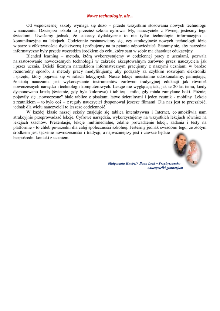 Nowe technologie, ale... Od współczesnej szkoły wymaga się dużo – przede wszystkim stosowania nowych technologii w nauczaniu. Dzisiejsza szkoła to przecież szkoła cyfrowa. My, nauczyciele z Piwnej, jesteśmy tego świadomi. Uważamy jednak, że sukcesy dydaktyczne to nie tylko technologie informacyjno – komunikacyjne na lekcjach. Codziennie zastanawiamy się, czy atrakcyjność nowych technologii idzie w parze z efektywnością dydaktyczną i próbujemy na to pytanie odpowiedzieć. Staramy się, aby narzędzia informatyczne były przede wszystkim środkiem do celu, który sam w sobie ma charakter edukacyjny. Blended learning – metoda, którą wykorzystujemy w codziennej pracy z uczniami, pozwala na zastosowanie nowoczesnych technologii w zakresie akceptowalnym zarówno przez nauczyciela jak i przez ucznia. Dzięki licznym narzędziom informatycznym pracujemy z naszymi uczniami w bardzo różnorodny sposób, a metody pracy modyfikujemy, aby podążały za szybkim rozwojem elektroniki i sprzętu, który pojawia się w salach lekcyjnych. Nasze lekcje nieustannie udoskonalamy, pamiętając, że istotą nauczania jest wykorzystanie instrumentów zarówno tradycyjnej edukacji jak również nowoczesnych narzędzi i technologii komputerowych. Lekcje nie wyglądają tak, jak te 20 lat temu, kiedy dysponowano kredą (świetnie, gdy była kolorowa) i tablicą - miło, gdy miała zamykane boki. Później pojawiły się „nowoczesne" białe tablice z pisakami łatwo ścieralnymi i jeden rzutnik - mobilny. Lekcje z rzutnikiem – to było coś – z reguły nauczyciel dysponował jeszcze filmami. Dla nas jest to przeszłość, jednak dla wielu nauczycieli to jeszcze codzienność. W każdej klasie naszej szkoły znajduje się tablica interaktywna i Internet, co umożliwia nam atrakcyjnie przeprowadzać lekcje. Cyfrowe narzędzia, wykorzystujemy na wszystkich lekcjach również na lekcjach szachów. Prezentacje, lekcje multimedialne, zdalne prowadzenie lekcji, zadania i testy na platformie - to chleb powszedni dla całej społeczności szkolnej. Jesteśmy jednak świadomi tego, że złotym środkiem jest łączenie nowoczesności i tradycji, a najważniejszy jest i zawsze będzie bezpośredni kontakt z uczniem. Małgorzata Knobel/ Ilona Lech – Przybyszewska nauczycielki gimnazjum