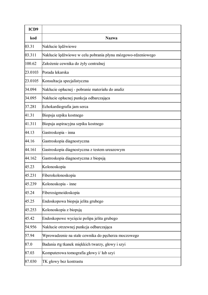 ICD9 kod Nazwa 03.31 Nakłucie lędźwiowe 03.311 Nakłucie lędźwiowe w celu pobrania płynu mózgowo-rdzeniowego 100.62 Założenie cewnika do żyły centralnej 23.0103 Porada lekarska 23.0105 Konsultacja specjalistyczna 34.094 Nakłucie opłucnej - pobranie materiału do analiz 34.095 Nakłucie opłucnej punkcja odbarczająca 37.281 Echokardiografia jam serca 41.31 Biopsja szpiku kostnego 41.311 Biopsja aspiracyjna szpiku kostnego 44.13 Gastroskopia - inna 44.16 Gastroskopia diagnostyczna 44.161 Gastroskopia diagnostyczna z testem ureazowym 44.162 Gastroskopia diagnostyczna z biopsją 45.23 Kolonoskopia 45.231 Fiberokolonoskopia 45.239 Kolonoskopia - inne 45.24 Fiberosigmoidoskopia 45.25 Endoskopowa biopsja jelita grubego 45.253 Kolonoskopia z biopsją 45.42 Endoskopowe wycięcie polipa jelita grubego 54.956 Nakłucie otrzewnej punkcja odbarczająca 57.94 Wprowadzenie na stałe cewnika do pęcherza moczowego 87.0 Badania rtg tkanek miękkich twarzy, głowy i szyi 87.03 Komputerowa tomografia głowy i/ lub szyi 87.030 TK głowy bez kontrastu 87.031 TK głowy bez kontrastu i z kontrastem 87.032 TK głowy bez kontrastu i co najmniej dwie fazy z kontrastem 87.033 TK tętnic głowy i szyi 87.036 TK szyi bez kontrastu 87.037 TK szyi bez kontrastu i z kontrastem 87.04 Tomografia głowy i/ lub szyi - inne 87.049 TK głowy z kontrastem 87.1 Inne badania rtg twarzy, głowy i szyi 87.164 RTG zatok nosa 87.2 Badanie rtg kręgosłupa 87.3 Badanie rtg tkanek miękkich klatki piersiowej 87.4 Inne badania rtg klatki piersiowej 87.41 Komputerowa tomografia (TK) klatki piersiowej 87.411 TK klatki piersiowej bez kontrastu i z kontrastem 87.44 Rutynowe zdjęcie RTG klatki piersiowej 87.440 RTG klatki piersiowej 87.49 Inne zdjęcie RTG klatki piersiowej 88.0 Badanie rtg tkanek miękkich brzucha 88.01 Komputerowa tomografia brzucha 88.010 TK jamy brzusznej lub miednicy małej bez kontrastu 88.011 TK jamy brzusznej lub miednicy małej bez kontrastu i z kontrastem 88.1 Inne badania rtg brzucha 88.11 Zdjęcie RTG miednicy 88.19 Inne RTG brzucha 88.191 RTG jamy brzusznej przeglądowe 88.38 Tomografia komputerowa - inne 88.389 Inna TK z kontrastem 88.71 Diagnostyka ultrasonograficzna głowy/szyi 88.713 USG tarczycy i przytarczyc 88.714 USG naczyń szyi doppler 88.715 USG węzłów chłonnych szyi 88.717 USG ślinianek 88.721 Echokardiografia 88.732 USG piersi 88.734 USG jamy opłucnej 88.751 USG naczyń nerkowych doppler 88.752 USG nerek, moczowodów, pęcherza moczowego 88.759 USG układu moczowego inne 88.76 Diagnostyka ultrasonograficzna brzucha i przestrzeni zaotrzewnowej 88.761 USG brzucha i przestrzeni zaotrzewnowej 88.769 USG brzucha inne 88.77 Diagnostyka ultrasonograficzna obwodowego układu naczyniowego 88.771 Badanie USG zakrzepicy żył głębokich 88.775 USG naczyń narządów miąższowych - doppler 88.776 USG naczyń kończyn górnych - doppler 88.777 USG naczyń kończyn dolnych - doppler 88.779 USG innych obszarów układu naczyniowego - doppler 88.79 Inna diagnostyczna ultrasonografia 88.97 Rezonans magnetyczny innych okolic i miejsc nieokreślonych 88.976 RM jamy brzusznej lub miednicy małej bez kontrastu i z kontrastem 89.0 Wywiad, ocena, konsultacja i badanie 89.00 Porada lekarska, konsultacja, asysta 89.01 Profilaktyka i promocja zdrowia 89.02 Porada lekarska, inne 89.04 Opieka pielęgniarki lub położnej 89.06 Opieka paliatywna 89.501 Monitorowanie ciśnienia tętniczego krwi za pomocą urządzeń analogowych lub cyfrowych (typu Holter) Holter RR 89.502 Monitorowanie czynności serca za pomocą urządzeń analogowych lub cyfrowych (typu Holter) Holter EKG 89.51 Elektrokardiogram (ocena rytmu serca) 89.52 Elektrokardiogram 89.522 Elektrokardiografia z 12 lub więcej odprowadzeniami (z opisem) 89.540 Monitorowanie podstawowych funkcji życiowych 89.541 Monitorowanie czynności serca przy pomocy urządzeń analogowych (typu Holter) 89.602 Pulsoksymetria 89.61 Monitorowanie systemowego ciśnienia tętniczego 89.65 Gazometria krwi tętniczej 89.7 Badanie fizykalne 89.72 Wykonanie segregacji poszkodowanych w zdarzeniu mnogim i masowym 90.03 Badanie mikroskopowe materiału z układu i płynu mózgowo rdzeniowego posiew i antybiogram 90.04 Badanie mikroskopowe materiału z układu i płynu mózgowo rdzeniowego parazytologia 90.43 Badanie mikroskopowe materiału z tchawicy, opłucnej, płuc i innych tkanek klatki piersiowej oraz plwociny - posiew i antybiogram 90.5 Mikroskopowe badanie krwi 90.52 Mikroskopowe badanie krwi -posiew 90.53 Mikroskopowe badanie krwi - posiew i antybiogram 90.92 Badanie mikroskopowe materiału z dolnego odcinka przewodu pokarmowego i stolca - posiew 91.31 Badanie mikroskopowe materiału z pęcherza moczowego, cewki moczowej, stercza, pęcherzyków nasiennych, tkanki okołopęcherzowej, moczu i nasienia rozmaz bakterii 91.32 Badanie mikroskopowe materiału z pęcherza moczowego, cewki moczowej, stercza, pęcherzyków nasiennych, tkanki okołopęcherzowej, moczu i nasienia posiew 91.33 Badanie mikroskopowe materiału z pęcherza moczowego, cewki moczowej, stercza, pęcherzyków nasiennych, tkanki okołopęcherzowej, moczu i nasienia posiew i antybiogram 91.39 Badanie mikroskopowe materiału z pęcherza moczowego, cewki moczowej, stercza, pęcherzyków nasiennych, tkanki okołopęcherzowej, moczu i nasienia inne badania mikroskopowe 91.8 Badanie mikroskopowe materiału z innych miejsc 91.82 Badanie mikroskopowe materiału z innych miejsc - posiew 91.821 Badanie materiału biologicznego posiew jakościowy i ilościowy 91.83 Badanie mikroskopowe materiału z innych miejsc -posiew i antybiogram 91.831 Badanie materiału biologicznego posiew jakościowy wraz z identyfikacją drobnoustroju i antybiogram 93.57 Założenie opatrunku na ranę - inne 93.89 Rehabilitacja - inne 93.9 Respiratoroterapia 93.932 Resuscytacja ręczna 93.94 Nebulizacja 93.96 Tlenoterapia - inne 93.964 Tlenoterapia 94.111 Kliniczno-psychiatryczna ocena stanu psychicznego 94.115 Ocena stanu psychicznego 
