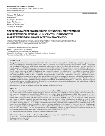 Medycyna Pracy 2009;60(5):369–376 © Instytut Medycyny Pracy im. prof. J. Nofera w Łodzi http://medpr.imp.lodz.pl Tadeusz M. Zielonka1 Jan Lesiński1 Katarzyna Życińska1 Rafał Machowicz2 Krzysztof Królikowski3 Andrzej K. Wardyn1 PRACA ORYGINALNA SZCZEPIENIA PRZECIWKO GRYPIE PERSONELU MEDYCZNEGO WARSZAWSKICH SZPITALI KLINICZNYCH I STUDENTÓW WARSZAWSKIEGO UNIWERSYTETU MEDYCZNEGO VACCINATION AGAINST INFLUENZA IN MEDICAL STAFF OF WARSAW UNIVERSITY HOSPITALS AND IN STUDENTS OF WARSAW MEDICAL UNIVERSITY Warszawski Uniwersytet Medyczny, Warszawa Katedra i Zakład Medycyny Rodzinnej 2 Warszawski Uniwersytet Medyczny, Warszawa Studenckie Koło Naukowe przy Katedrze i Zakładzie Medycyny Rodzinnej 3 Instytut Gruźlicy i Chorób Płuc, Warszawa 1 Streszczenie Wstęp: Aktualne zalecenia amerykańskie zakwalifikowały pracowników medycznych do osób, które powinny być regularnie szczepione przeciwko grypie. Celem pracy była ocena odsetka personelu medycznego wybranych warszawskich szpitali i studentów Warszawskiego Uniwersytetu Medycznego zaszczepionych przeciwko grypie, określenie ich świadomości potrzeby profilaktyki przeciwgrypowej i zidentyfikowanie przyczyn nieszczepienia. Materiał i metody: Anonimowe badanie ankietowe przeprowadzono u 166 lekarzy i 104 pielęgniarek zatrudnionych w dwóch warszawskich szpitalach oraz u 254 studentów odbywających w nich zajęcia kliniczne. Wyniki: W badanej grupie 10,6% pielęgniarek, 13,4% studentów i 22,3% lekarzy regularnie szczepi się przeciwko grypie. Odsetek osób, którym proponowano bezpłatne szczepienia był niewielki (odpowiednio 6% studentów, 15% pielęgniarek i 19% lekarzy). Tylko 42% pielęgniarek było świadomych konieczności szczepień i zgłaszało gotowość do bezpłatnego szczepienia przeciw grypie. Jako najczęstsze przyczyny nieszczepienia się przeciwko grypie lekarze zgłaszali przeświadczenie o braku takiej potrzeby, brak czasu i lenistwo, pielęgniarki — koszty i brak potrzeby, a studenci — koszty i lenistwo. Wnioski: Niewielki odsetek studentów medycyny i personelu medycznego warszawskich szpitali klinicznych regularnie szczepi się przeciwko grypie. Niewielka gotowość do szczepień przeciwgrypowych sprawia, że konieczna jest odpowiednia edukacja w tym zakresie. Med. Pr. 2009;60(5):369–376 Słowa kluczowe: grypa, szczepienia, profilaktyka, personel medyczny, edukacja Abstract Background: According to CDC recommendations, medical staff should be vaccinated against influenza each year. The objective of this work was to establish the percentage of medical personnel and students vaccinated against influenza in two Warsaw university hospitals and Warsaw Medical University, to evaluate their level of awareness about the importance of vaccination and to identify reasons for not taking vaccines. Material and Methods: The anonymous questionnaire survey was conducted in the population of 166 physicians, 104 nurses and 254 students. Results: Only 22.3% of physicians, 10.6% of nurses and 13.4% of students regularly take vaccines against influenza. Free of charge vaccination was offered to 19% of physicians, 15% of nurses and 6% of students. Awareness of the need for influenza vaccination and willingness to take free-of-charge vaccination were declared by 42% of nurses. Physicians justified their decisions not to undergo vaccination by no need to vaccinate, laziness and lack of time, nurses by no need to vaccinate and costs, and students by costs and laziness. Conclusions: The percentage of medical staff of Warsaw university hospitals who regularly take vaccines against influenza is low. In view of the reluctance to take influenza vaccines observed in the study population, there is an urgent need to intensify educational efforts to increase awareness of the importance to be vaccinated. Med Pr 2009;60(5):369–376 Key words: influenza, vaccination, prophylaxis, medical staff, education Adres autorów: Katedra i Zakład Medycyny Rodzinnej Warszawskiego Uniwersytetu Medycznego, ul. Banacha 1a, 02-097 Warszawa, e-mail: [email protected] Nadesłano: 22 kwietnia 2009 Zatwierdzono: 2 lipca 2009 370 T.M. Zielonka i wsp. WSTĘP Wbrew obiegowej opinii zakażenie wirusem grypy nie jest przyczyną jedynie banalnych infekcji, lecz należy do ważnych przyczyn hospitalizacji i zgonów, szczególnie u osób w podeszłym wieku oraz cierpiących na schorzenia przewlekłe. Każdego roku na świecie choruje na grypę 330–990 mln ludzi (1). Okresowo obserwuje się pandemie, które są powodem zgonu wielu milionów chorych. Największa z nich w 1918 roku spowodowała śmierć 40–50 mln osób, a 25% całej populacji zachorowało wówczas na grypę (2). W Polsce w ostatniej dekadzie zarejestrowano od 210 tys. zachorowań na grypę w sezonie 2001/2002 do 2340 tys. w 1998/1999 (3). Szczyt zachorowań przypada zwykle między styczniem a marcem. W Stanach Zjednoczonych z powodu grypy hospitalizowanych jest średnio ponad 200 tys. chorych rocznie (4), a blisko 40 tys. z nich umiera (5). Chociaż do zachorowań na grypę dochodzi we wszystkich grupach wiekowych, to najczęściej chorują dzieci (6). Udowodniono, że szczepienie personelu medycznego w szpitalach znacząco zmniejsza śmiertelność chorych hospitalizowanych (7). Z tego względu w zaleceniach amerykańskich z 2007 roku dotyczących kontroli zakażeń, pracowników placówek ochrony zdrowia zaliczono do osób, które powinny być każdego roku zaszczepione przeciwko grypie (8). Zalecenia te objęły nie tylko lekarzy i pielęgniarki, ale również fizykoterapeutów oraz studentów wydziałów lekarskich i pielęgniarstwa mających stały kontakt z chorymi. Centrum Prewencji i Kontroli Zakażeń w USA (Centres for Diseases Control and Prevention — CDC) uważa, że odsetek personelu medycznego zaszczepionego przeciwko grypie jest jednym z ważnych wyznaczników bezpieczeństwa placówek medycznych i zaleca wdrożenie skutecznych strategii zachęcania lekarzy i pielęgniarek d
