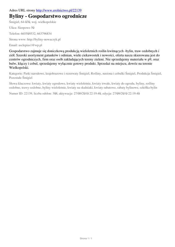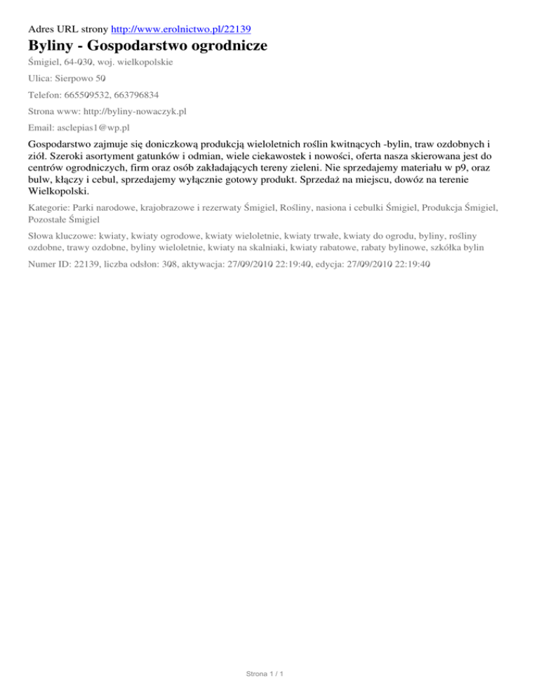 Adres URL strony http://www.erolnictwo.pl/22139 Byliny - Gospodarstwo ogrodnicze Śmigiel, 64-030, woj. wielkopolskie Ulica: Sierpowo 50 Telefon: 665509532, 663796834 Strona www: http://byliny-nowaczyk.pl Email: [email protected] Gospodarstwo zajmuje się doniczkową produkcją wieloletnich roślin kwitnących -bylin, traw ozdobnych i ziół. Szeroki asortyment gatunków i odmian, wiele ciekawostek i nowości, oferta nasza skierowana jest do centrów ogrodniczych, firm oraz osób zakładających tereny zieleni. Nie sprzedajemy materiału w p9, oraz bulw, kłączy i cebul, sprzedajemy wyłącznie gotowy produkt. Sprzedaż na miejscu, dowóz na terenie Wielkopolski. Kategorie: Parki narodowe, krajobrazowe i rezerwaty Śmigiel, Rośliny, nasiona i cebulki Śmigiel, Produkcja Śmigiel, Pozostałe Śmigiel Słowa kluczowe: kwiaty, kwiaty ogrodowe, kwiaty wieloletnie, kwiaty trwałe, kwiaty do ogrodu, byliny, rośliny ozdobne, trawy ozdobne, byliny wieloletnie, kwiaty na skalniaki, kwiaty rabatowe, rabaty bylinowe, szkółka bylin Numer ID: 22139, liczba odsłon: 308, aktywacja: 27/09/2010 22:19:40, edycja: 27/09/2010 22:19:40 Strona 1 / 1