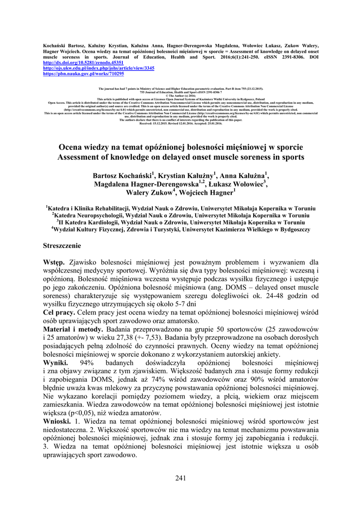 Kochański Bartosz, Kałużny Krystian, Kałużna Anna, Hagner-Derengowska Magdalena, Wołowiec Łukasz, Zukow Walery, Hagner Wojciech. Ocena wiedzy na temat opóźnionej bolesności mięśniowej w sporcie = Assessment of knowledge on delayed onset muscle soreness in sports. Journal of Education, Health and Sport. 2016;6(1):241-250. eISSN 2391-8306. DOI http://dx.doi.org/10.5281/zenodo.45351 http://ojs.ukw.edu.pl/index.php/johs/article/view/3345 https://pbn.nauka.gov.pl/works/710295 The journal has had 7 points in Ministry of Science and Higher Education parametric evaluation. Part B item 755 (23.12.2015). 755 Journal of Education, Health and Sport eISSN 2391-8306 7 © The Author (s) 2016; This article is published with open access at Licensee Open Journal Systems of Kazimierz Wielki University in Bydgoszcz, Poland Open Access. This article is distributed under the terms of the Creative Commons Attribution Noncommercial License which permits any noncommercial use, distribution, and reproduction in any medium, provided the original author(s) and source are credited. This is an open access article licensed under the terms of the Creative Commons Attribution Non Commercial License (http://creativecommons.org/licenses/by-nc/4.0/) which permits unrestricted, non commercial use, distribution and reproduction in any medium, provided the work is properly cited. This is an open access article licensed under the terms of the Creative Commons Attribution Non Commercial License (http://creativecommons.org/licenses/by-nc/4.0/) which permits unrestricted, non commercial use, distribution and reproduction in any medium, provided the work is properly cited. The authors declare that there is no conflict of interests regarding the publication of this paper. Received: 15.12.2015. Revised 12.01.2016. Accepted: 25.01.2016. Ocena wiedzy na temat opóźnionej bolesności mięśniowej w sporcie Assessment of knowledge on delayed onset muscle soreness in sports Bartosz Kochański1, Krystian Kałużny1, Anna Kałużna1, Magdalena Hagner-Derengowska1,2, Łukasz Wołowiec3, Walery Zukow4, Wojciech Hagner1 1 Katedra i Klinika Rehabilitacji, Wydział Nauk o Zdrowiu, Uniwersytet Mikołaja Kopernika w Toruniu 2 Katedra Neuropsychologii, Wydział Nauk o Zdrowiu, Uniwersytet Mikołaja Kopernika w Toruniu 3 II Katedra Kardiologii, Wydział Nauk o Zdrowiu, Uniwersytet Mikołaja Kopernika w Toruniu 4 Wydział Kultury Fizycznej, Zdrowia i Turystyki, Uniwersytet Kazimierza Wielkiego w Bydgoszczy Streszczenie Wstęp. Zjawisko bolesności mięśniowej jest poważnym problemem i wyzwaniem dla współczesnej medycyny sportowej. Wyróżnia się dwa typy bolesności mięśniowej: wczesną i opóźnioną. Bolesność mięśniowa wczesna występuje podczas wysiłku fizycznego i ustępuje po jego zakończeniu. Opóźniona bolesność mięśniowa (ang. DOMS – delayed onset muscle soreness) charakteryzuje się występowaniem szeregu dolegliwości ok. 24-48 godzin od wysiłku fizycznego utrzymujących się około 5-7 dni Cel pracy. Celem pracy jest ocena wiedzy na temat opóźnionej bolesności mięśniowej wśród osób uprawiających sport zawodowo oraz amatorsko. Materiał i metody. Badania przeprowadzono na grupie 50 sportowców (25 zawodowców i 25 amatorów) w wieku 27,38 (+- 7,53). Badania były przeprowadzone na osobach dorosłych posiadających pełną zdolność do czynności prawnych. Oceny wiedzy na temat opóźnionej bolesności mięśniowej w sporcie dokonano z wykorzystaniem autorskiej ankiety. Wyniki. 94% badanych doświadczyła opóźnionej bolesności mięśniowej i zna objawy związane z tym zjawiskiem. Większość badanych zna i stosuje formy redukcji i zapobiegania DOMS, jednak aż 74% wśród zawodowców oraz 90% wśród amatorów błędnie uważa kwas mlekowy za przyczynę powstawania opóźnionej bolesności mięśniowej. Nie wykazano korelacji pomiędzy poziomem wiedzy, a płcią, wiekiem oraz miejscem zamieszkania. Wiedza zawodowców na temat opóźnionej bolesności mięśniowej jest istotnie większa (p<0,05), niż wiedza amatorów. Wnioski. 1. Wiedza na temat opóźnionej bolesności mięśniowej wśród sportowców jest niedostateczna. 2. Większość sportowców nie ma wiedzy na temat mechanizmu powstawania opóźnionej bolesności mięśniowej, jednak zna i stosuje formy jej zapobiegania i redukcji. 3. Wiedza na temat opóźnionej bolesności mięśniowej jest istotnie większa u osób uprawiających sport zawodowo. 241 Abstract Introduction. The phenomenon of muscle soreness is a serious problem and challenge for modern sports medicine. There are two types of muscle soreness: early and delayed. Early muscle soreness occurs during physical exertion and relieved after its completion. Delayed onset muscle soreness is characterized by the presence of a series of ailments approx. 24-48 hours of exercise sustained about 5-7 days. Aim of the study. The aim of the study is to evaluate knowledge on delayed onset muscle soreness in sports. Materials and methods. The study was conducted on a group of 50 athletes (25 professionals and 25 amateurs ) aged 27.38 (+ - 7.53). Studies have been conducted on adults with full legal capacity. Assessment of knowledge on delayed muscle soreness in sports has been using the author's survey. Results. 94% of patients experienced delayed onset muscle soreness and they know the symptoms associated with this phenomenon. The majority of respondents know and apply the form of reducing and preventing DOMS, but 74% professionals and 90% amateurs incorrectly believe lactic acid as the cause of delayed onset muscle soreness. There was no correlation between the level of knowledge and gender, age and place of residence. Knowledge professionals on delayed muscle soreness is significantly higher (p <0.05) than knowledge amateurs. Conclusions. 1. Knowledge of delayed muscle soreness in athletes is insufficient. 2. Most of athletes do not have knowledge about the mechanism of delayed muscle 