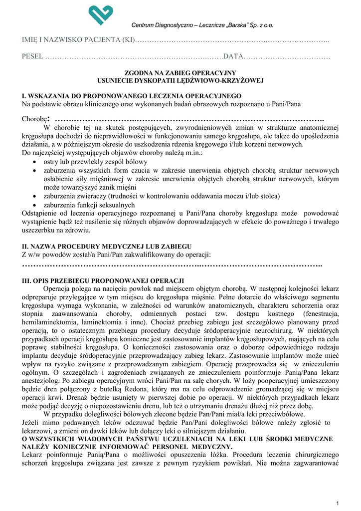 Centrum Diagnostyczno – Lecznicze „Barska” Sp. z o.o. IMIĘ I NAZWISKO PACJENTA (KI)……………………………………………….…………………….. PESEL ………………………………………………………….…….DATA……………………………… ZGODNA NA ZABIEG OPERACYJNY USUNIECIE DYSKOPATII LĘDŹWIOWO-KRZYŻOWEJ I. WSKAZANIA DO PROPONOWANEGO LECZENIA OPERACYJNEGO Na podstawie obrazu klinicznego oraz wykonanych badań obrazowych rozpoznano u Pani/Pana Chorobę: …….…………………..………………………………………………………….. W chorobie tej na skutek postępujących, zwyrodnieniowych zmian w strukturze anatomicznej kręgosłupa dochodzi do nieprawidłowości w funkcjonowaniu samego kręgosłupa, ale także do upośledzenia działania, a w późniejszym okresie do uszkodzenia rdzenia kręgowego i/lub korzeni nerwowych. Do najczęściej występujących objawów choroby należą m.in.: ostry lub przewlekły zespół bólowy zaburzenia wszystkich form czucia w zakresie unerwienia objętych chorobą struktur nerwowych osłabienie siły mięśniowej w zakresie unerwienia objętych chorobą struktur nerwowych, którym może towarzyszyć zanik mięśni zaburzenia zwieraczy (trudności w kontrolowaniu oddawania moczu i/lub stolca) zaburzenia funkcji seksualnych Odstąpienie od leczenia operacyjnego rozpoznanej u Pani/Pana choroby kręgosłupa może powodować wystąpienie bądź też nasilenie się różnych objawów doprowadzających w efekcie do poważnego i trwałego uszczerbku na zdrowiu. II. NAZWA PROCEDURY MEDYCZNEJ LUB ZABIEGU Z w/w powodów został/a Pani/Pan zakwalifikowany do operacji: ………………………………………………………..…………………………………….. III. OPIS PRZEBIEGU PROPONOWANEJ OPERACJI Operacja polega na nacięciu powłok nad miejscem objętym chorobą. W następnej kolejności lekarz odpreparuje przylegające w tym miejscu do kręgosłupa mięśnie. Pełne dotarcie do właściwego segmentu kręgosłupa wymaga wykonania, w zależności od warunków anatomicznych, charakteru schorzenia oraz stopnia zaawansowania choroby, odmiennych postaci tzw. dostępu kostnego (fenestracja, hemilaminektomia, laminektomia i inne). Chociaż przebieg zabiegu jest szczegółowo planowany przed operacją, to o ostatecznym przebiegu procedury decyduje śródoperacyjnie neurochirurg. W niektórych przypadkach operacji kręgosłupa konieczne jest zastosowanie implantów kręgosłupowych, mających na celu poprawę stabilności kręgosłupa. O konieczności zastosowania oraz o doborze odpowiedniego rodzaju implantu decyduje śródoperacyjnie przeprowadzający zabieg lekarz. Zastosowanie implantów może mieć wpływ na ryzyko związane z przeprowadzanym zabiegiem. Operację przeprowadza się w znieczuleniu ogólnym. O szczegółach i zagrożeniach związanych ze znieczuleniem poinformuje Panią/Pana lekarz anestezjolog. Po zabiegu operacyjnym wróci Pani/Pan na salę chorych. W loży pooperacyjnej umieszczony będzie dren połączony z butelką Redona, który ma na celu odprowadzenie gromadzącej się w miejscu operacji krwi. Drenaż będzie usunięty w pierwszej dobie po operacji. W niektórych przypadkach lekarz może podjąć decyzję o niepozostawieniu drenu, lub też o utrzymaniu drenażu dłużej niż przez dobę. W przypadku dolegliwości bólowych zlecone będzie Pan/Pani miał/a leki przeciwbólowe. Jeżeli mimo podawanych leków odczuwać będzie Pan/Pani dolegliwości bólowe należy zgłosić to lekarzowi, a zmieni on dawki leków lub dołączy leki o silniejszym działaniu. O WSZYSTKICH WIADOMYCH PAŃSTWU UCZULENIACH NA LEKI LUB ŚRODKI MEDYCZNE NALEŻY KONIECZNIE INFORMOWAĆ PERSONEL MEDYCZNY. Lekarz poinformuje Panią/Pana o możliwości opuszczenia łóżka. Procedura leczenia chirurgicznego schorzeń kręgosłupa związana jest zawsze z pewnym ryzykiem powikłań. Nie można zagwarantować 1 IMIĘ I NAZWISKO PACJENTA (KI)…………………………………………………….……………….. PESEL ………………………………………………………….…….DATA……………………………… pełnego powodzenia dla każdego bez wyjątku. Dlatego jest bardzo ważne, aby Państwo przeczytali i zaznajomili się ze związanym z planowaną operacją ryzykiem i możliwymi pooperacyjnymi powikłaniami. IV. OPIS MOŻLIWYCH POWIKŁAŃ STANDARDOWYCH ZWIĄZANYCH Z PROPONOWANĄ PROCEDURĄ MEDYCZNĄ Do częściej występujących powikłań, które mogą pojawić się w trakcie operacji lub w okresie pooperacyjnym należą: 1. Infekcje: powierzchowne infekcje, powodujące przedłużone gojenie się rany, mogące wymagać stosowaniamiejscowego lub ogólnego antybiotyków. W niektórych przypadkach także rewizji rany. Zwiększone ryzyko infekcji występuje u osób starszych, otyłych, chorujących na cukrzycę, przyjmujących przewlekle leki sterydowe) infekcje głębokie- występują rzadziej, a obejmują m.in. przestrzeń międzykręgową (tzw. discitis), ropień nadtwardówkowy, zapalenie opon mózgowo-rdzeniowych. infekcje uogólnione- np. zapalenie płuc, infekcje dróg moczowych lub uogólnione zakażenie krwi.Zwiększone ryzyko infekcji występuje m.in. u osób starszych, otyłych, chorujących na cukrzycę, uogólnioną chorobę nowotworową, przyjmujących przewlekle leki sterydowe, długotrwale przebywających w pozycji leżącej, z założonym cewnikiem w drogach moczowych czy też z wkłuciem centralnym. 2. Niezamierzone otwarcie worka oponowego mogące spowodować wyciek płynu mózgowordzeniowego. Płynotok ma wpływ na przebieg gojenia się rany i może wymagać zastosowania zewnętrznego drenażu lędźwiowego lub reoperacji. Ryzyko wystąpienia niezamierzonego otwarcia worka oponowego jest większe w grupie chorych operowanych po raz kolejny. 3. Ryzyko przejściowego lub trwałego wystąpienia zaburzeń ruchowych i/lub czuciowych o c