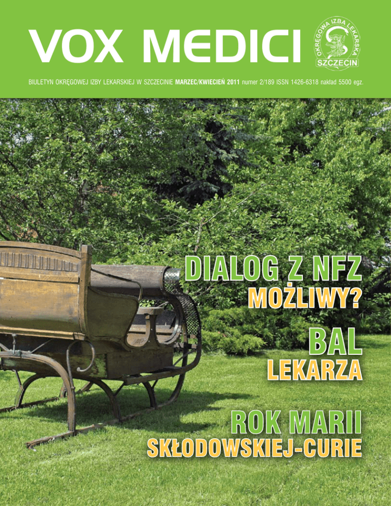 VOX MEDICI Lorem ipsum BIULETYN OKRĘGOWEJ IZBY LEKARSKIEJ W SZCZECINIE marzec/kwiecień 2011 numer 2/189 ISSN 1426-6318 nakład 5500 egz. dialog z nfz I okładka możliwy? bal lekarza rok marii skłodowskiej-curie marzec/kwiecień 2011 VOX MEDICI 1 Uwaga lekarze dentyści członkowie Polskiego Towarzystwa Stomatologicznego! Zarząd Oddziału informuje, iż od maja 2011 roku zgodnie z decyzją podjętą na zebraniu szkoleniowym w styczniu 2011 roku, nastąpiła zmiana miejsca posiedzeń oddziału. Polskie Towarzystwo Stomatologiczne Oddział w Szczecinie uprzejmie zaprasza na spotkanie naukowo-szkoleniowe, które odbędzie się w dniu 21.05.2011 r. o godz. 10.00 Miejsce spotkania - Buchalter -Szczecin, ul. Wojska Polskiego 83 21.05.2011 r. Tytuł referatu programowego: „Krótkie wędzidełko języka – diagnostyka i leczenie” Katedra i Zakład Ortodoncji PUM, kierownik dr hab. n. med. Krzysztof Woźniak, wykładowca – lek. dent. Marcin Post Uwaga : Składka członkowska wynosi 200zł. Zgodnie ze Statutem przyjętym na Walnym Zebraniu Zarządu Głównego PTS składki członkowskie należy wnosić do 30.06.2011 r., po tym terminie następuje utrata członkostwa i konieczność wznowienia procedury przyjęcia. Składkę można uiścić na spotkaniu naukowo-szkoleniowym lub wpłacić na konto: BANK PEKAO SA I O/ SZCZECIN Nr 101240 3813 1111 0000 4375 6878 Biuro PTS O/ Szczecin czynne w siedzibie OIL w 1 i 3 czwartek miesiąca, tel. 91 48 749 36 w. 23, w godz. 10-12 W innych terminach, po wcześniejszym uzgodnieniu telefonicznym, kontakt z: Prezes PTS O/Szczecin dr n. med. H. Ey-Chmielewska 601-57-61-60; Sekretarz PTS O/Szczecin lek. dent. M. Bendig-Wielowiejska 604-09-04-08 Sekretarz PTS O/Szczecin lek. dent. Małgorzata Bendig-Wielowiejska Prezes PTS O/Szczecin dr n. med. Halina Ey-Chmielewska Wszystkiego najpiękniejszego i najmilszego na Wielkanoc i całą wiosnę, niech życzliwość i nadzieja okryją każdy dzień, a ten piękny czas da chwilę radości, uśmiechu w otoczeniu rodziny i przyjaciół Redakcja Redakcja BIURO OKRĘGOWEJ IZBY LEKARSKIEJ DYREKTOR BIURA OIL mgr Agnieszka Niśkiewicz Centrala wew. 102 ul. M. Skłodowskiej-Curie 11 71-332 Szczecin SEKRETARIAT mgr Kamila Sidor Centrala wew. 106, fax 91 487 75 61 www.oil.szczecin.pl email: [email protected] Centrala 1 487 49 36 9 91 487 48 98 91 487 37 24 DYŻURY WICEPREZESÓW ORL LEK. WIESŁAW KUPIŃSKI 1 i 3 poniedziałek miesiąca 14.00 – 15.00 DR N. MED. MAGDA WIŚNIEWSKA czwartek 14.00 – 16.00 DR N. MED. AGNIESZKA RUCHAŁA-TYSZLER środa 13.00 – 14.30 OKRĘGOWY REJESTR LEKARZY (Prawa Wykonywania Zawodu) mgr inż. Lidia Borkowska Centrala wew. 104 (Prawa Wykonywania Zawodu, Punkty Edukacyjne oraz Staże Podyplomowe) mgr Krzysztof Halewski Centrala wew. 124 REJESTR PRAKTYK LEKARSKICH Sylwia Chudoba Centrala wew. 112 KSIĘGOWOŚĆ mgr Maria Iwińska – główna księgowa Centrala wew. 111 KASA, WINDYKACJA SKŁADEK mgr Małgorzata Amanowicz, Urszula Prymas Centrala wew. 107 SEKRETARIAT KOMISJI BIOETYCZNEJ, REDAKCJI „VOX MEDICI” i REJESTR PODMIOTÓW PROWADZĄCYCH KSZTAŁCENIE PODYPLOMOWE mgr Mirosława Fryś Centrala wew. 110, fax 91 486 26 31 BIURO OKRĘGOWEGO RZECZNIKA ODPOWIEDZIALNOŚCI ZAWODOWEJ mgr Marta Hamerska -Litwinowicz mgr Marta Witek Centrala wew. 103, 117 BIURO OKRĘGOWEGO SĄDU LEKARSKIEGO mgr Paweł Kowalski Centrala wew. 119 GODZINY PRACY BIURO OIL (Za wyjątkiem biura Okręgowego Sądu Lekarskiego) poniedziałek 7.30-15.30 środa, piątek w godzinach 7.30-15.00 wtorek, czwartek w godzinach 7.30-16.00 KOLEGIUM REDAKCYJNE: Agnieszka Borowiec (Redaktor Naczelny), Maciej Kołban (Z-ca Redaktora Naczelnego), Grzegorz Wojciechowski, Halina Teodorczyk, Mariusz Pietrzak, Magda Wiśniewska, Mieczysław Chruściel, Łukasz Tyszler. Biuletyn Okręgowej Izby Lekarskiej w Szczecinie WYDAWCA: Okręgowa Izba Lekarska w Szczecinie, 71-332 Szczecin, ul. M. Skłodowskiej-Curie 11 DRUK: Rexdruk KOLPORTAŻ: Rozsyłamy do 5500 lekarzy i lekarzy dentystów, w dawnym woj. szczecińskim i części woj. gorzowskiego poprzez Pocztę Polską i firmę InPost. 4 VOX MEDICI Sekretarz Vox Medici: mgr Mirosława Fryś, tel. 91 487 49 36 wew. 110 STALE WSPÓŁPRACUJĄCY: Krzysztof Jach, Halina Pilawska. LISTY DO REDAKCJI Prosimy przysyłać na adres: [email protected] lub dostarczać do sekretariatu OIL wyłącznie w formie elektronicznej. ZdjęciE NA OKŁADCE: Agnieszka Borowiec SKŁAD I REDAKCJA TECHNICZNA: Michał Orłowski BIURO OKRĘGOWEGO SĄDU LEKARSKIEGO poniedziałek 7.30-15.30 środa w godzinach8.30-13.30 czwartek w godzinach 8.00-15.00 OKRĘGOWY REJESTR LEKARZY, REJESTR PRAKTYK LEKARSKICH w piątek nie przyjmują interesantów. PORADY PRAWNE Eliza Nahajowska – radca prawny Andrzej Lubiniecki – radca prawny Porady prawne udzielane są lekarzom – członkom OIL w Szczecinie – w siedzibie OIL w trakcie dyżurów w każdy wtorek w godz. 11.00 – 15.30. Bezpłatnie – w sprawach związanych z wykonywaniem zawodu lekarza. W innych sprawach porad prawnych dla członków OIL w Szczecinie udziela się na preferencyjnych warunkach. Radcy Prawni nie udzielają porad prawnych telefonicznie. Porady prawne udzielane są po wcześniejszym umówieniu terminu. Rejestracja i informacja Sekretariat OIL Centrala wew. 106 Redakcja nie ponosi odpowiedzialności za treść ogłoszeń. Sekretariat nie przygotowuje tekstów do druku. Redakcja zastrzega sobie prawo do skracania i adjustacji nadesłanych tekstów. Nie gwarantujemy publikacji materiałów, które nie zostały zamówione. Przedruk artykułów oraz wykorzystywanie zdjęć tylko za zgodą redakcji. W przypadku nadsyłania do Vox Medici tekstów zgłoszonych do druku również w innych publikatorach, redakcja musi być o tym fakcie poinformowana. Ogłoszenia prosimy nadsyłać w formatach tiff lub pdf, formy wektorowe w eps lub ai, przestrzeni kolorów CMYK, rozdzielczości 300 dpi, z uwzględnionym spadem 3mm, wielkością i formatem zgodne z zamówionym modułem. Wszyst