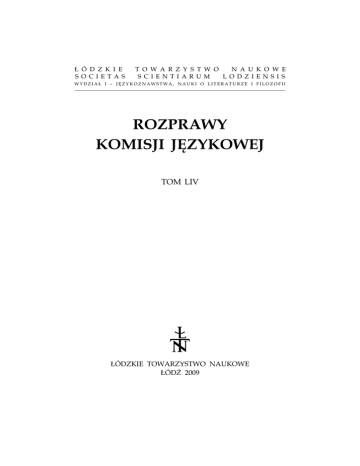 Ł Ó D Z K I E S O C I E T A S T O W A R Z Y S T W O N A U K O W E S C I E N T I A R U M L O D Z I E N S I S WYDZIAŁ I – JĘZYKOZNAWSTWA, NAUKI O LITERATURZE I FILOZOFII ROZPRAWY KOMISJI JĘZYKOWEJ TOM LIV ŁÓDZKIE TOWARZYSTWO NAUKOWE ŁÓDŹ 2009 ŁÓDZKIE TOWARZYSTWO NAUKOWE 95-505 Łódź, ul. M. Skłodowskiej-Curie 11 tel. (0-42) 66-55-459; fax (0-42) 66-55-464 sprzedaż wydawnictw: tel. (0-42) 66-55-448 e-mail: [email protected] REDAKCJA NACZELNA WYDAWNICTW ŁÓDZKIEGO TOWARZYSTWA NAUKOWEGO Sławomir Gala, Edward Karasiński, Wanda M. Krajewska – redaktor naczelny, Jan Szymczak Redaktor naczelny: SŁAWOMIR GALA (Uniwersytet Łódzki) Członkowie redakcji: NATALIA ANANIEWA (Uniwersytet im. M. Łomonosowa, Moskwa), MARIA BIOLIK (Uniwersytet Warmińsko-Mazurski, Olsztyn), MAREK CYBULSKI (Uniwersytet Łódzki), FELIKS CZYŻEWSKI (Uniwersytet Marii Curie-Skłodowskiej, Lublin), STANISŁAW DUBISZ (Uniwersytet Warszawski), BOGUSŁAW DUNAJ (Uniwersytet Jagielloński, Kraków), PAWŁO HRYCENKO (Narodowa Akademia Nauk Ukrainy, Kijów), MARIA KAMIŃSKA (Uniwersytet Łódzki), MICHAEL MOSER (Uniwersytet Wiedeński), ANNA STROKOWSKA (Uniwersytet Łódzki) Sekretarz: IRENA JAROS (Uniwersytet Łódzki) Recenzent: ROBERT MRÓZEK Opracowanie edytorskie: Teresa Majdzińska Wydano z pomocą finansową Ministerstwa Nauki i Szkolnictwa Wyższego oraz Uniwersytetu Łódzkiego ISSN 0076-0390 © Copyright by Łódzkie Towarzystwo Naukowe, Łódź 2009 Skład: „PERFECT”, 95-054 Ksawerów, ul. Parkowa 10, tel. (0-42) 215-83-46 Druk: „TRIADA”, 90-644 Łódź, ul. Żeligowskiego 46, tel. (42) 651-96-35 Nakład: 200 egz. SPIS TREŚCI Alina BURYSZ, Imiona kobiet w inskrypcjach nagrobnych cmentarza w Drohobyczu (na przykładzie pracy Romana Pastucha Drohobyckij nekropol) ................................ 5 – Female names in grave inscriptions of Drohobycz cemetery (on the basis of R. Pastuch’s monograph Drohobyckij nekropol)................................................ 16 Наталія ХIБЕБА, Назви обрядодiй передшлюбного вечора в бойкiвських говiрках . ....................................................................................... 17 – Names of rituals which take place in the evening before wedding in Boiko dialects .................................................................................................... 29 Izabela EJSMUNT, Semantyka prefiksu wy- w czasownikach gwarowych . ............... 31 – The semantic functions of verbal wy- prefix in dialects of the Southern Masovia ........................................................................................ 45 Sławomir GALA, W sprawie paradygmatycznego wymiaru słowotwórstwa gwarowego ............................................................................................................. 47 – On paradigmatic aspects of word formation in dialect .......................................... 55 Beata GALA-MILCZAREK, Czynnościowy charakter derywatów rzeczownikowych w gwarach piotrkowskich ........................................................ 57 – Functional character of nominal derivatives in the dialect of Piotrków region ..... 75 Irena JAROS, Słowotwórstwo na zajęciach z dialektologii polskiej . .......................... 77 – Словообразование на занятиях по польской диалектологии ........................... 85 Renata MARCINIAK, Zagadnienie wielomotywacyjności w słowotwórstwie na przykładzie nazw osobowych wykonawców czynności ................................... 87 – The issue of double motivation in morphology exemplified with the names/types of agents .............................................................................. 95 Martin OLOŠTIAK, Antropomorfizácia v lexike . ...................................................... 97 – Anthropomorphization in a lexicon ....................................................................... 107 Маринела ПАРАСКОВА ВЪЛЧАНОВА, Поглед върху изгубеното славянсколексикално наследство в съвременния унгарския език ................... 109 – A glance over the lost slavonic lexical heritage in modern hungarian . ................. 116 Anna PIECHNIK, Funkcjonowanie gwary w świadomości jej użytkowników ........... 117 – Functioning of dialect in the awareness of its speakers ......................................... 125 Magdalena PIETRZAK, O nagłówkach felietonów drugiej połowy XIX wieku . ...... 127 – On late 19th century column headlines ................................................................... 138 Feliks PLUTA, Powołanie profesora doktora Zdzisława Stiebera na katedrę filologii słowiańskiej w Uniwersytecie Jana Kazimierza we Lwowie w świetle dokumentów .......................................................................................... 139 – The appointment of Professor Zdzisław Stieber to the Chair of Slavonic Philology in Jan Kazimierz University of Lviv in the light of documentation . .... 149 Екатерина А. ПОПОВА, Полина С. ЮСТОВА, О некаторых компонентах славянского ономастического пространства: к проблеме статуса эргонимов и урбанонимов ...................................................................................................... 151 – About certain components of the Slavic onomastic space: the problem of status of ergonyms and urbabonyms. . ............................................................... 162 Ольга РИМ’ЯК, Прямий обєкт у конструкцiях iз дiєсловами конкретноï фiзичноï дiï. ІІ (на матеріалі пам’яток української мови XVI – першої половини X