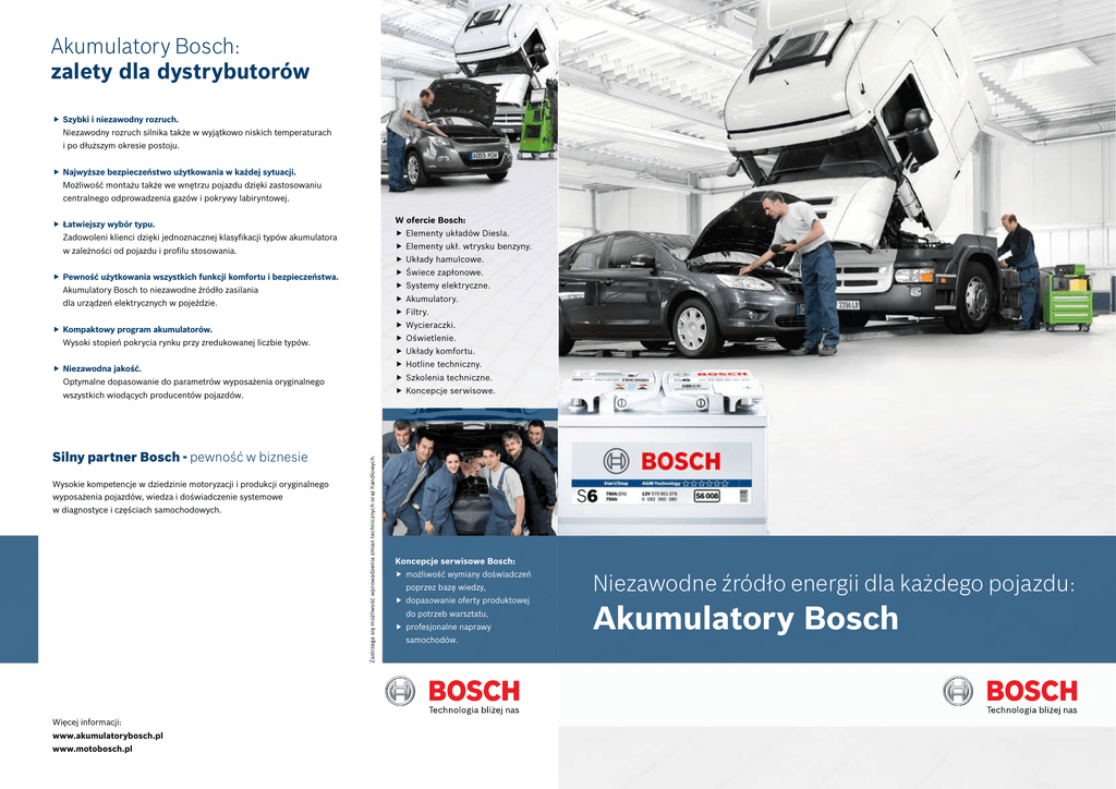 Akumulatory Bosch: zalety dla dystrybutorów Szybki i niezawodny rozruch. Niezawodny rozruch silnika także w wyjątkowo niskich temperaturach i po dłuższym okresie postoju. Najwyższe bezpieczeństwo użytkowania w każdej sytuacji. Możliwość montażu także we wnętrzu pojazdu dzięki zastosowaniu centralnego odprowadzenia gazów i pokrywy labiryntowej. W ofercie Bosch: Łatwiejszy wybór typu. Elementy układów Diesla. Zadowoleni klienci dzięki jednoznacznej klasyfikacji typów akumulatora Elementy ukł. wtrysku benzyny. w zależności od pojazdu i profilu stosowania. Układy hamulcowe. Świece zapłonowe. Pewność użytkowania wszystkich funkcji komfortu i bezpieczeństwa. Systemy elektryczne. Akumulatory Bosch to niezawodne źródło zasilania dla urządzeń elektrycznych w pojeździe. Akumulatory. Kompaktowy program akumulatorów. Wycieraczki. Filtry. Oświetlenie. Wysoki stopień pokrycia rynku przy zredukowanej liczbie typów. Układy komfortu. Hotline techniczny. Niezawodna jakość. Szkolenia techniczne. Optymalne dopasowanie do parametrów wyposażenia oryginalnego Koncepcje serwisowe. Silny partner Bosch - pewność w biznesie Wysokie kompetencje w dziedzinie motoryzacji i produkcji oryginalnego wyposażenia pojazdów, wiedza i doświadczenie systemowe w diagnostyce i częściach samochodowych. Więcej informacji: www.akumulatorybosch.pl www.motobosch.pl Zastrzega się możliwość wprowadzenia zmian technicznych oraz handlowych. wszystkich wiodących producentów pojazdów. Koncepcje serwisowe Bosch: możliwość wymiany doświadczeń poprzez bazę wiedzy, dopasowanie oferty produktowej do potrzeb warsztatu, profesjonalne naprawy samochodów. Niezawodne źródło energii dla każdego pojazdu: Akumulatory Bosch Niezawodne źródło energii dla każdego pojazdu: Akumulatory Bosch Wraz z rosnącą liczbą elementów pojazdu poprawiających komfort i bezpieczeństwo użytkowników, zwiększa się zapotrzebowanie na energię elektryczną. Systemy aktywnego bezpieczeństwa jak ABS, ESP, ACC, funkcje komfortu: klimatyzacja, audio, nawigacja, elektryczna regulacja siedzeń, okien, lusterek, czy szyberdachu sprawiły, że obecne zapotrzebowanie samochodu na energię jest ponad trzykrotnie większe niż w samochodach z przed kilkunastu lat. Akumulatory Bosch wykonane w technologii PowerFrame odznaczają się nie tylko większą mocą rozruchową i dłuższą żywotnością. Zawierają w sobie szereg rozwiązań, które gwarantują użytkownikowi maksimum komfortu i bezpieczeństwa. Program akumulatorów Bosch daje użytkownikowi pewność zastosowania akumulatora najlepiej dopasowanego do indywidualnych wymagań jego pojazdu. Akumulatory Bosch S6 AGM - dla samochodów z wyposażonych w układ Start/Stop z systemem rekuperacji. Nawet 4-krotnie większa odporność na pracę cykliczną w porównaniu z akumulatorami konwencjonalnymi. Stała moc także przy jeździe na krótkich odcinkach. Elektrolit jest związany w matach z włókna szklanego (AGM). Możliwość montażu akumulatora w każdej pozycji, stuprocentowa ochrona przed wyciekiem. Absolutnie bezobsługowe. START Akumulatory Bosch S5 / S4 / S3 - dla samochodów osobowych. Zastosowana nowatorska technologia PowerFrame. Niezawodne źródło zasilania w każdych warunkach. 30 % większa moc rozruchowa zimnego silnika. 20 % dłuższa żywotność w porównaniu do akumulatora tradycyjnego. Wysoka odporność na częste cykle ładowania i rozładowania. Przeznaczone do samochodów europejskich i azjatyckich. Pokrycie rynku europejskiego - 97%. Absolutnie bezobsługowe. Akumulatory Bosch T5 / T4 / T3 - dla pojazdów użytkowych. Bezobsługowe - oszczędność czasu dla właściciela floty. Przeznaczone do najtrudniejszych zastosowań. Technologia Silver - podwyższone rezerwy mocy niezbędne do pracy w ekstremalnie niekorzystnych temperaturach (T5/T4). Optymalne zarządzanie magazynowaniem - program skrojony na miarę potrzeb użytkowników. Podwyższona odporność na wstrząsy. Akumulatory Bosch L5 / L4 - mobilne źródło energii tam, gdzie nie ma dostępu do sieci elektrycznej. Idealne na przykład dla: Kamperów. Przyczep kempingowych. Łodzi motorowych. Systemów solarnych. Akumulatory Bosch M6 / M4 - do motocykli, quadów, skuterów: Do ponad 80% wszystkich motocykli, skuterów i motorowerów. Bezobsługowe wg normy EN. Pewny rozruch w każdych warunkach pogodowych. Szybko i łatwo: z pakietem elektrolitu i systemem napełniania. Akumulatory M6 w technologii AGM. START A A STOP STOP regenerative braking 2 Akumulatory Bosch S5 EFB - dla samochodów wyposażonych w układ Start/Stop. Dwukrotnie większa odporność cykliczna w porównaniu z akumulatorami konwencjonalnymi. Dodatkowa powłoka poliestrowa pomiędzy płytą a separatorem (EFB). Wysoka odporność na użytkowanie na krótkich dystansach. Zabezpieczone przed wyciekiem przy przechyleniu do 55°. Absolutnie bezobsługowe. regenerative braking 3 System Start/Stop Bosch: technologia redukcji emisji spalin Każda sekunda, kiedy samochód stoi z pracującym silnikiem, oznacza większe zużycie paliwa i niepotrzebną emisję spalin. Rozruch silnika w samochodach posiadających system Start/Stop przebiega bardzo szybko i w sposób ekonomiczny. Pomiary wykonane zgodnie z Nowym Europejskim Cyklem Jazdy (NEFZ / NEDC) wykazały obniżenie zużycia paliwa oraz redukcję emisji o ok. 8%. W rzeczywistych warunkach jazdy oszczędności te mogą być znacznie wyższe. W połączeniu z nowoczesnym silnikiem benzynowym samochód zużywa przy rozruchu ciepłego silnika tyle samo paliwa, co w ciągu 0,7 sekundy pracy na biegu jałowym. Zwiększająca się liczba pojazdów, rosnące ceny paliw oraz restrykcyjne normy czy- Eksperci prognozują, że w 2017 roku około 90% Know-how firmy Bosch w dziedzinie systemów. stości spalin w Europie spowodowane koniecznością redukcji CO2 stawiają nowe wy- nowych samochodów będzie wyposażone w system Bosch zajmuje się technologiami hybryd