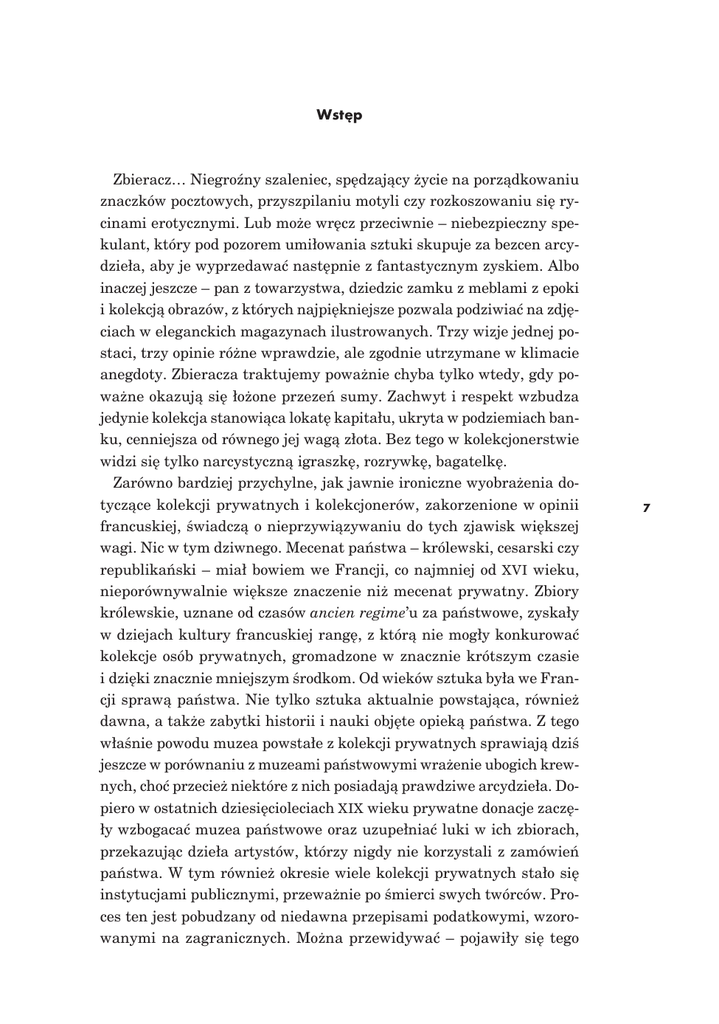 Wstêp Zbieracz… Niegroźny szaleniec, spędzający życie na porządkowaniu znaczków pocztowych, przyszpilaniu motyli czy rozkoszowaniu się rycinami erotycznymi. Lub może wręcz przeciwnie – niebezpieczny spekulant, który pod pozorem umiłowania sztuki skupuje za bezcen arcydzieła, aby je wyprzedawać następnie z fantastycznym zyskiem. Albo inaczej jeszcze – pan z towarzystwa, dziedzic zamku z meblami z epoki i kolekcją obrazów, z których najpiękniejsze pozwala podziwiać na zdjęciach w eleganckich magazynach ilustrowanych. Trzy wizje jednej postaci, trzy opinie różne wprawdzie, ale zgodnie utrzymane w klimacie anegdoty. Zbieracza traktujemy poważnie chyba tylko wtedy, gdy poważne okazują się łożone przezeń sumy. Zachwyt i respekt wzbudza jedynie kolekcja stanowiąca lokatę kapitału, ukryta w podziemiach banku, cenniejsza od równego jej wagą złota. Bez tego w kolekcjonerstwie widzi się tylko narcystyczną igraszkę, rozrywkę, bagatelkę. Zarówno bardziej przychylne, jak jawnie ironiczne wyobrażenia dotyczące kolekcji prywatnych i kolekcjonerów, zakorzenione w opinii francuskiej, świadczą o nieprzywiązywaniu do tych zjawisk większej wagi. Nic w tym dziwnego. Mecenat państwa – królewski, cesarski czy republikański – miał bowiem we Francji, co najmniej od XVI wieku, nieporównywalnie większe znaczenie niż mecenat prywatny. Zbiory królewskie, uznane od czasów ancien regime’u za państwowe, zyskały w dziejach kultury francuskiej rangę, z którą nie mogły konkurować kolekcje osób prywatnych, gromadzone w znacznie krótszym czasie i dzięki znacznie mniejszym środkom. Od wieków sztuka była we Francji sprawą państwa. Nie tylko sztuka aktualnie powstająca, również dawna, a także zabytki historii i nauki objęte opieką państwa. Z tego właśnie powodu muzea powstałe z kolekcji prywatnych sprawiają dziś jeszcze w porównaniu z muzeami państwowymi wrażenie ubogich krewnych, choć przecież niektóre z nich posiadają prawdziwe arcydzieła. Dopiero w ostatnich dziesięcioleciach XIX wieku prywatne donacje zaczęły wzbogacać muzea państwowe oraz uzupełniać luki w ich zbiorach, przekazując dzieła artystów, którzy nigdy nie korzystali z zamówień państwa. W tym również okresie wiele kolekcji prywatnych stało się instytucjami publicznymi, przeważnie po śmierci swych twórców. Proces ten jest pobudzany od niedawna przepisami podatkowymi, wzorowanymi na zagranicznych. Można przewidywać – pojawiły się tego 7 8 pierwsze zwiastuny – że wzrost liczby donacji i muzeów utworzonych z kolekcji prywatnych lub częściowo je wchłaniających, a także wielki trud wychowawczy podjęty przez organizatorów wystaw i krytykę zmienią wreszcie postawę szerokiej publiczności wobec zbieraczy, uzmysławiając, że są oni „centralnymi postaciami świata sztuki” (André Chastel), a nawet szerzej – kultury. Jakoż świadomość taka jest szeroko rozpowszechniona w krajach, gdzie ogólnie wiadomo, iż muzea, od najmniejszych po największe, powstały z indywidualnych inicjatyw i że zawdzięczają swe zasoby kolekcjom osób prywatnych oraz zakupom finansowanym przez nie lub przez ich przedsiębiorstwa. Tak na przykład w Stanach Zjednoczonych kolekcjonera uważa się za potencjalnego dobroczyńcę, który sprowadza do swego kraju dzieła sztuki lub pamiątki przeszłości i który może sprawić, by w nim pozostały, który, inaczej mówiąc, może obdarzyć własny kraj instytucją zarazem wychowującą i twórczą, jako że każde lub prawie każde muzeum staje się jednocześnie biblioteką, miejscem wystaw, projekcji, wykładów, ośrodkiem wydawniczym i – z tych właśnie względów – terenem spotkań i odnawiania się tkanki społecznej. Nie trzeba zresztą podróży do Stanów Zjednoczonych, by odnaleźć świadomość kulturowej roli kolekcjonerów. Wystarczy przekroczyć granicę Włoch. Kraj ten bowiem, długo pozbawiony państwa narodowego, był od XV wieku ziemią wybraną indywidualnych zbieraczy, z których wielu bardzo wcześnie udostępniło publiczności własne zbiory. We Włoszech można też najlepiej odsłonić rolę kolekcji prywatnych w długim okresie dziejów dla dojrzewania patriotyzmów miejskich oraz świadomości narodowej – i zrozumieć, że miały one znaczenie wyraźnie polityczne, ponieważ wywierały wpływ, choć niewidzialny, ale realny, na życie zbiorowe. To samo dotyczy francuskich muzeów publicznych. Nie mogłyby one jednak pozwolić sobie na szeroką dostępność, a więc tanie bilety wstępu, a zarazem na modernizację obiektów i konserwację dzieł, na zakupy stale aktualizujące ich zbiory współczesne bez pomocy państwa, to znaczy obywateli płacących podatki. Ale nie mogłyby one również pozwolić sobie na to wszystko bez kolekcji prywatnych, które są ich niezastąpionym dopełnieniem, o tyle, o ile pomagają im śledzić przemiany smaku i przewidywać ich kierunki w przyszłości. Głośne zachwyty i pogardliwe wypowiedzi, komentarze – kolekcje wywoływały je od początku swego istnienia. Grecy jako pierwsi w kulturze Zachodu zaczęli sporządzać opisy swoich zbiorów. W opisach tych – i późniejszych – brzmią jeszcze głosy podziwu oglądających. Inwentarze, często bardzo obszerne, przechowały pamięć o skarbcach kościołów oraz skarbcach średniowiecznych władców; mówi się tam o wielu przedmio- A. Furetière, Dictionnaire universel contenant… tous les mots francois…, La Haye – Rotterdam 1690, has³o Curieux. 10 tach, które dotrwały, rzecz zadziwiająca, aż do naszych czasów. Od XV wieku wreszcie, wraz z powstaniem kolekcji prywatnych typu nowożytnego, mnożą się bardzo skądinąd różnorodne publikacje, poświęcone im w całości lub częściowo: przewodniki dla zwiedzających, amatorów i zbieraczy (curieux); relacje z podróży; opisy gabinetów osobliwości, pinakotek i prywatnych muzeów, często pióra samych w