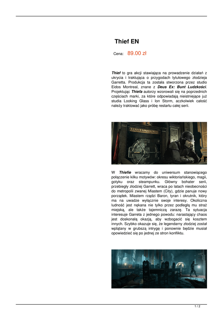 Thief EN Cena: 89.00 zł Thief to gra akcji stawiająca na prowadzenie działań z ukrycia i traktująca o przygodach tytułowego złodzieja Garretta. Produkcja ta została stworzona przez studio Eidos Montreal, znane z Deus Ex: Bunt Ludzkości. Projektując Thiefa autorzy wzorowali się na poprzednich częściach marki, za które odpowiadają nieistniejące już studia Looking Glass i Ion Storm, aczkolwiek całość należy traktować jako próbę restartu całej serii. W Thiefie wracamy do uniwersum stanowiącego połączenie kilku motywów: okresu wiktoriańskiego, magii, gotyku oraz steampunku. Główny bohater serii, przebiegły złodziej Garrett, wraca po latach nieobecności do metropolii zwanej Miastem (City), gdzie panuje nowy porządek. Miastem rządzi Baron, tyran i okrutnik, który ma na uwadze wyłącznie swoje interesy. Okoliczna ludność jest nękana nie tylko przez podległą mu straż miejską, ale także tajemniczą zarazę. Ta sytuacja interesuje Garreta z jednego powodu: narastający chaos jest doskonałą okazją, aby wzbogacić się kosztem innych. Szybko okazuje się, że legendarny złodziej został wplątany w grubszą intrygę i ponownie będzie musiał opowiedzieć się po jednej ze stron konfliktu. 1/2 Nowy Thief podąża ścieżką wytyczoną przez poprzednie odsłony i składa się z fabularyzowanych misji, w których Garrett okrada kolejnych bogatych mieszkańców Miasta, przy okazji poznając ich najskrytsze sekrety. W dalszym ciągu gracz może przeprowadzać akcje na wiele sposobów (np. skorzystanie z głównego wejścia, przeprawa przez kanały, skakanie po dachach), korzystając z bogatego asortymentu gadżetów, na który składają się między innymi wytrychy, szczypce do cięcia drutu, strzały ze sznurem czy klucz do otwierania kratek szybów wentylacyjnych. Mimo niewątpliwych umiejętności szermierczych, tytułowy złodziej woli unikać otwartej konfrontacji i działa z ukrycia. W ominięciu lub wyeliminowaniu straży pomagają mu takie zabawki jak specjalne strzały (np. wodna do gaszenia pochodni lub hukowa do odwracania uwagi), czy chociażby pałka, której uderzenie momentalnie ogłusza cel. Jednym z dodatków są szpony umożliwiające wspinanie się w wybranych miejscach poziomów. Zobacz wideo: 2/2 Powered by TCPDF (www.tcpdf.org)